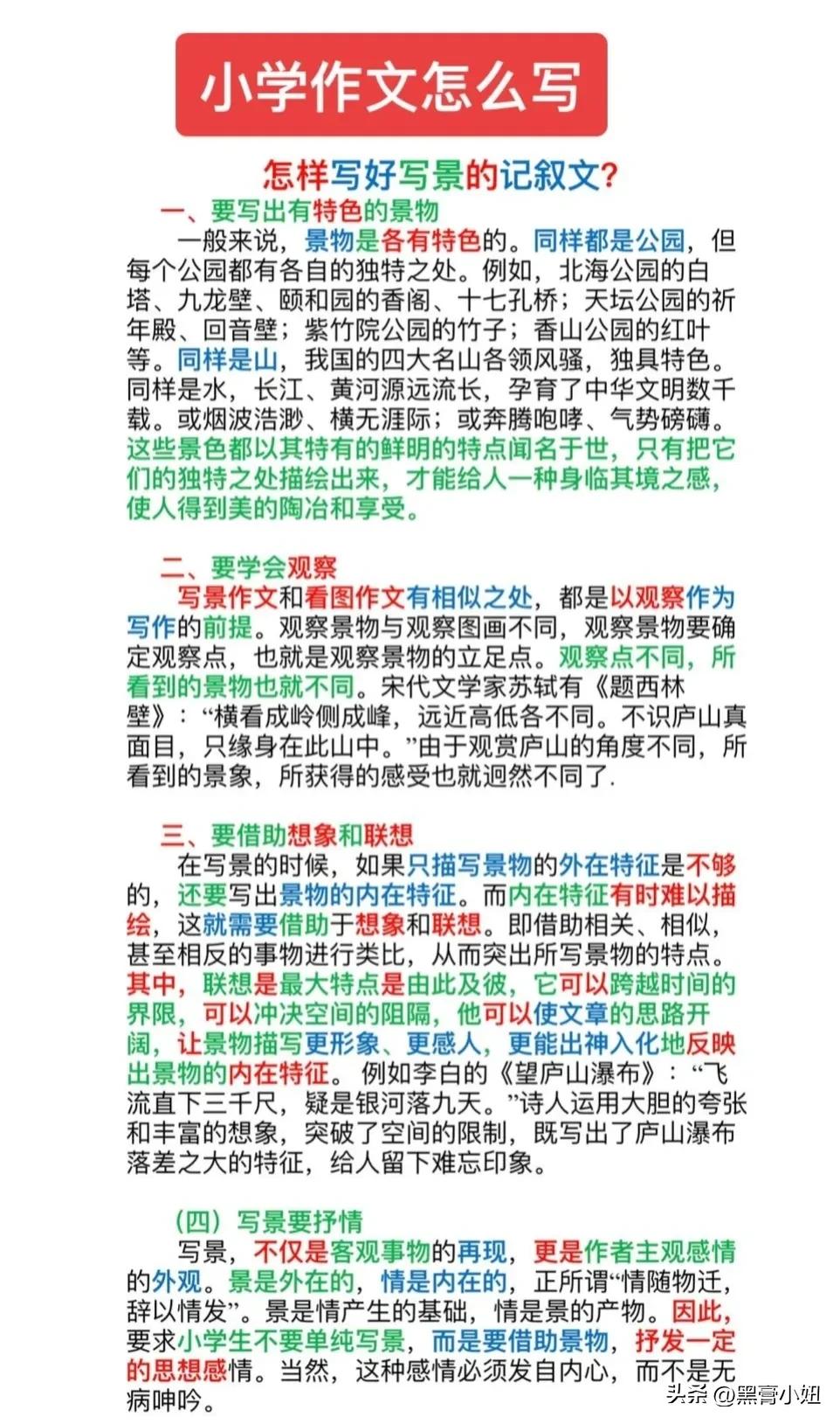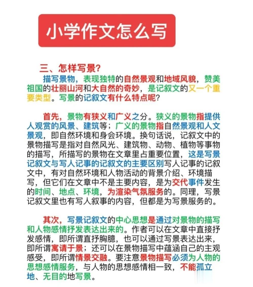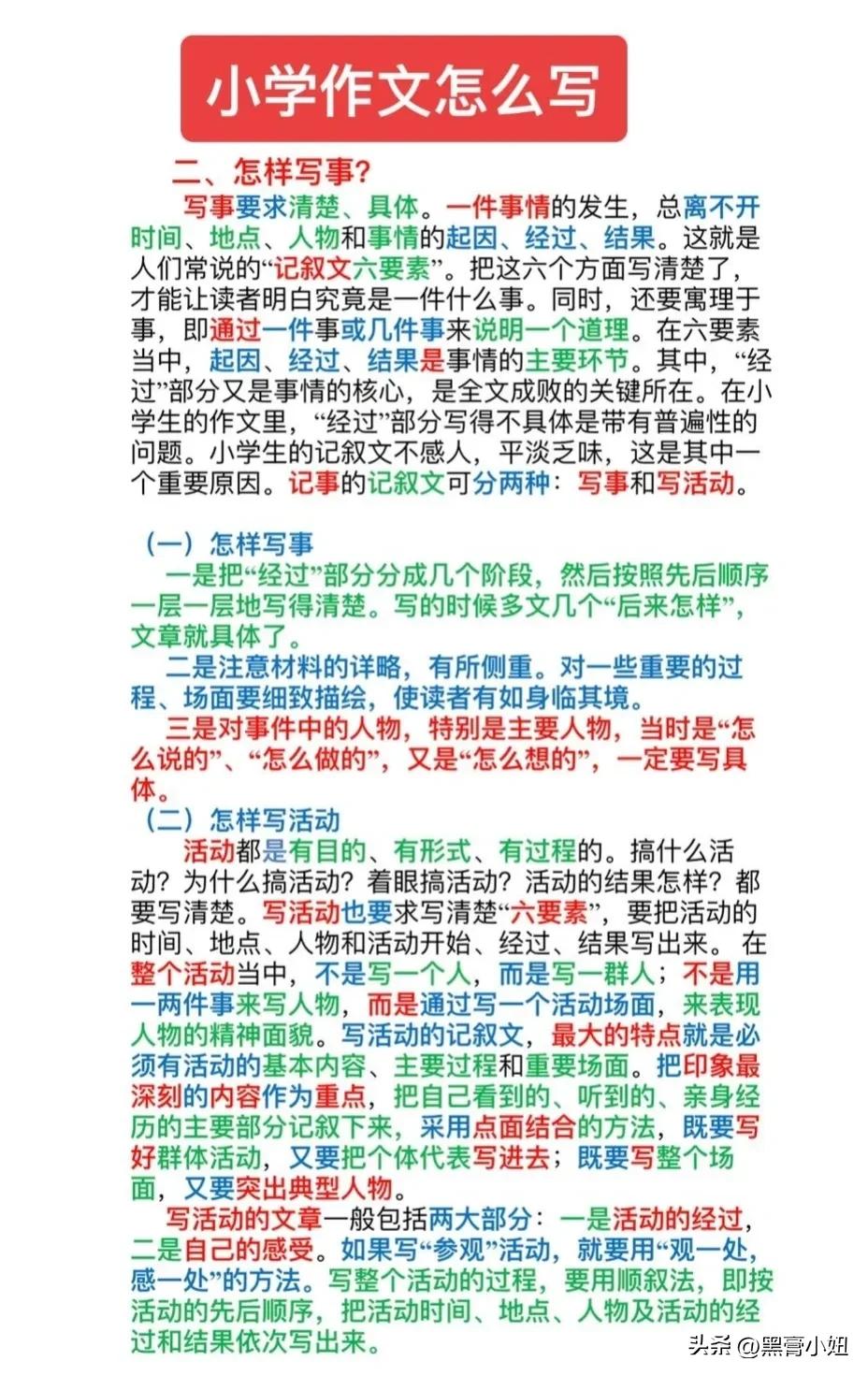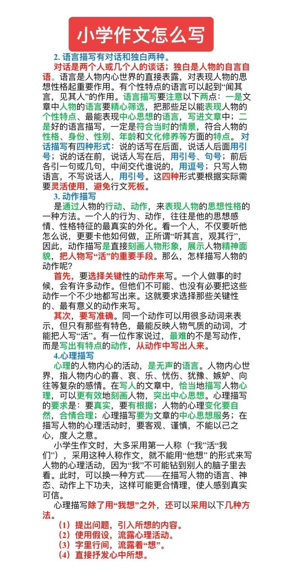 一位语文特级教师分享:小学语文作文的技巧和方法,比如怎样写人、写事、写景、写活动、看图写话等,都整理的非常详细,一目了然,轻松掌握写作的精髓!1-6年级的孩子都适用,家有孩子的赶紧收藏保存下来!没事让孩子看一看,练一练!提高写作水平! 作文是语文的重头戏,特别是中学以后,作文更是占了半壁江山!让孩子在小学吃透这些写作技巧,多借鉴借鉴,多模仿模仿,满分作文不在话下。 写作方法技巧提升训练