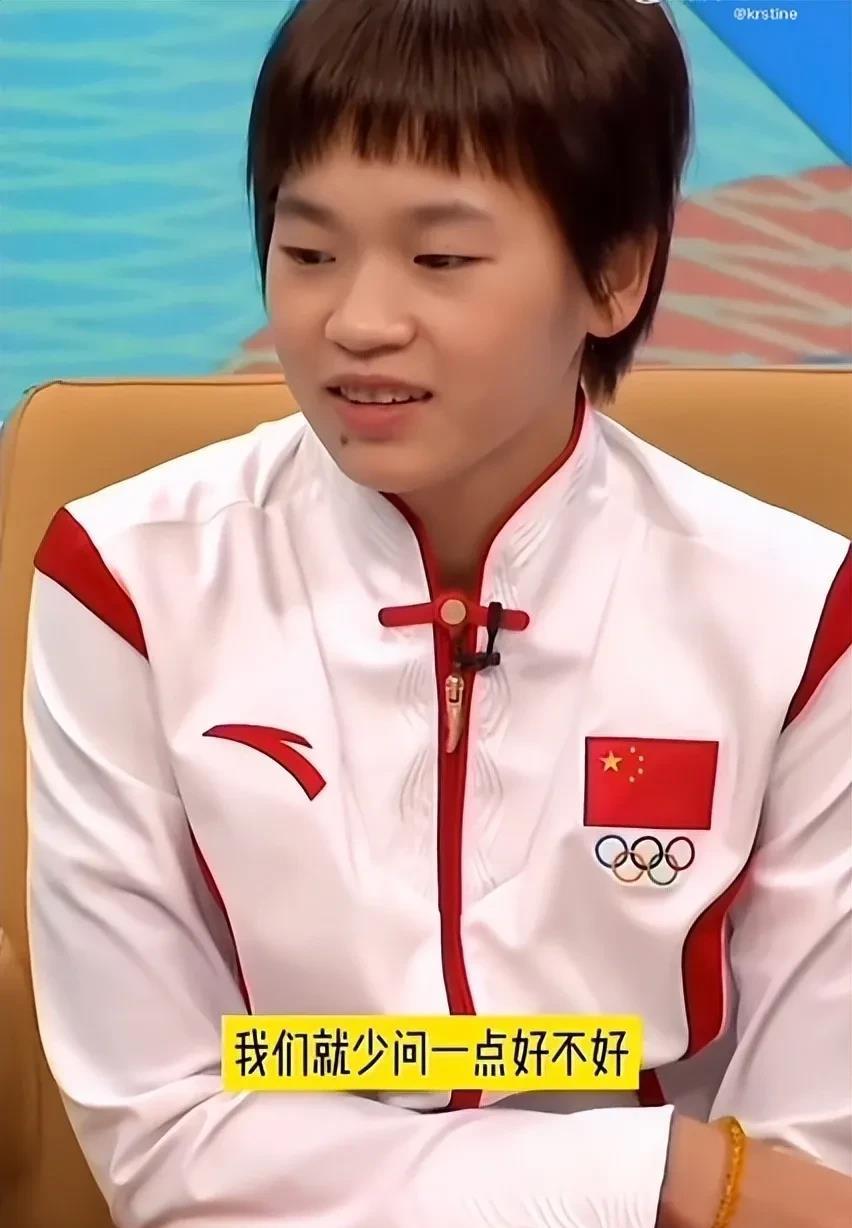 全红婵:哎呀,这个椅子会转哎。 主持人:别转了,一会转坏喽。 全红婵:好吧,今天就放过你。 主持人:不然播出去又有人该说你了。 全红婵:太吓人了,快点采访吧,我要回家。[偷笑] 其实她们在为国争光的同时也会有孩子的天性,不要对她们要求太严格,毕竟平时她们真的太辛苦了。