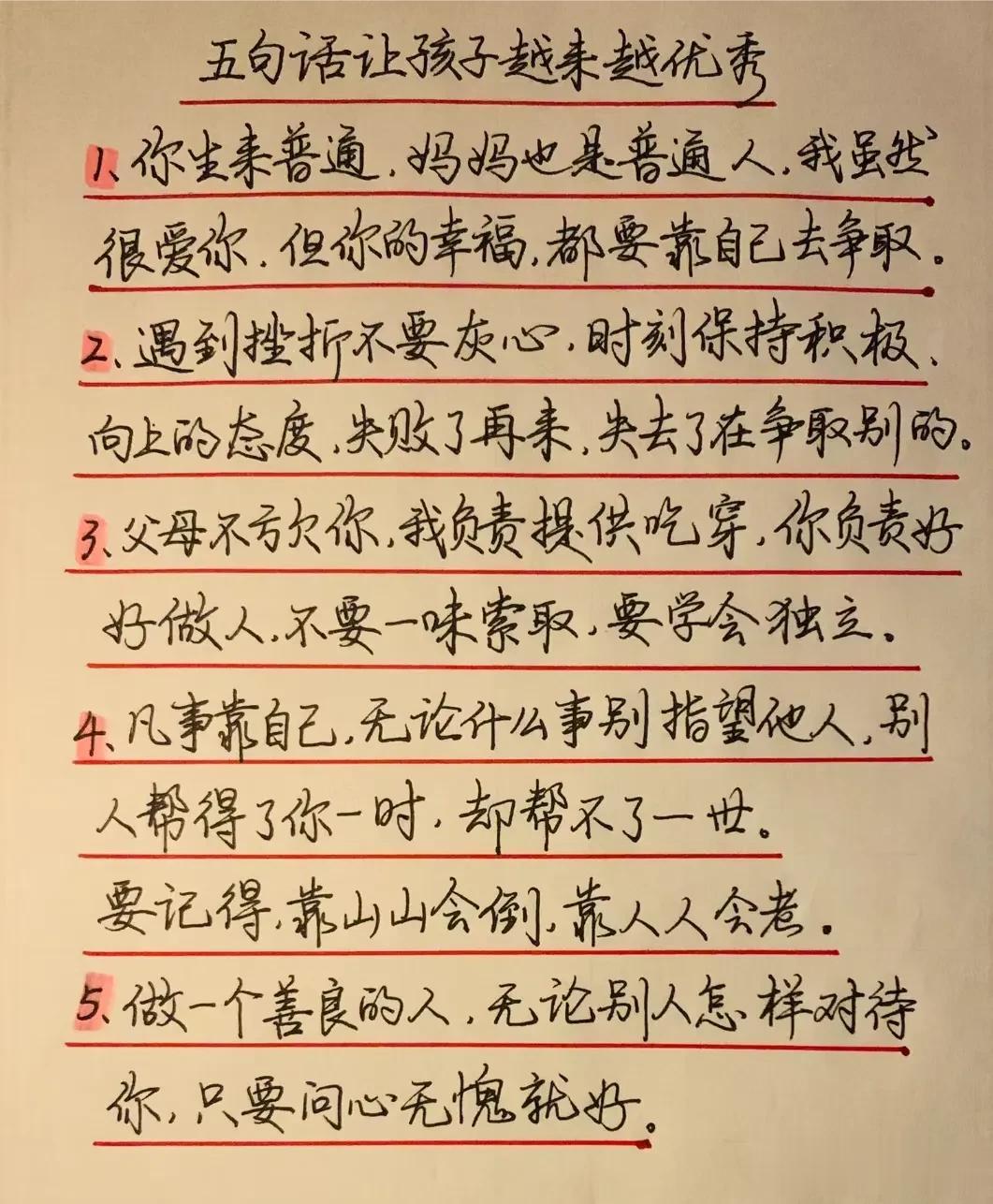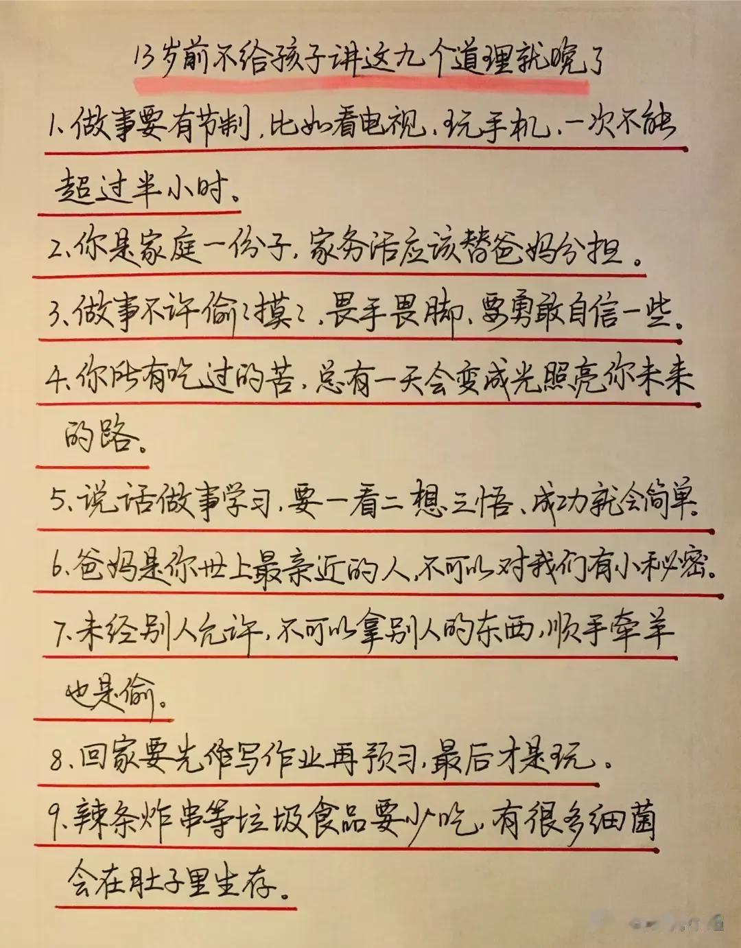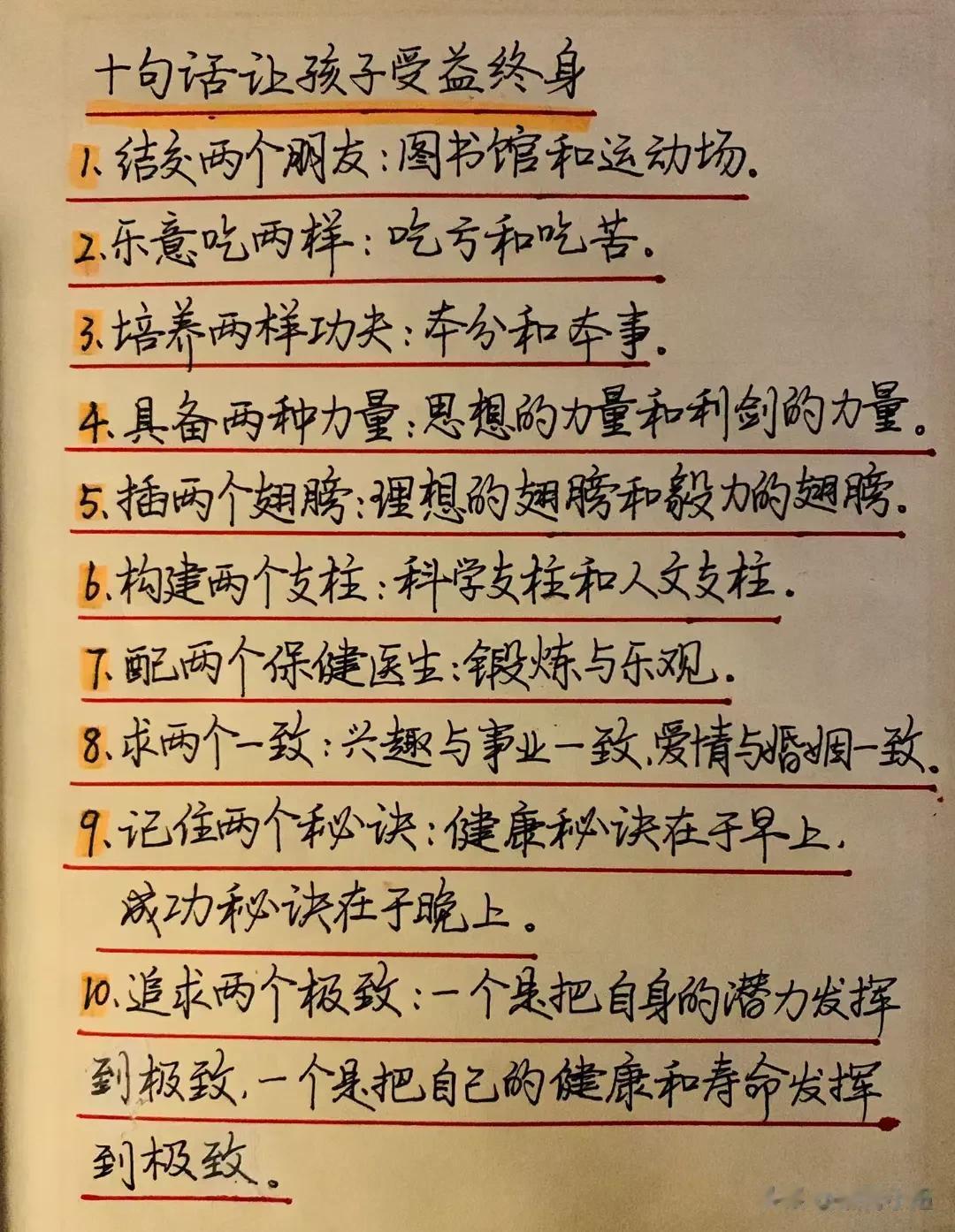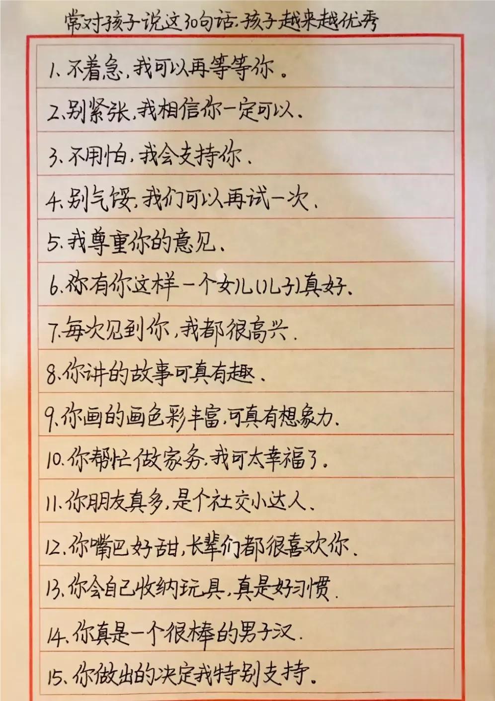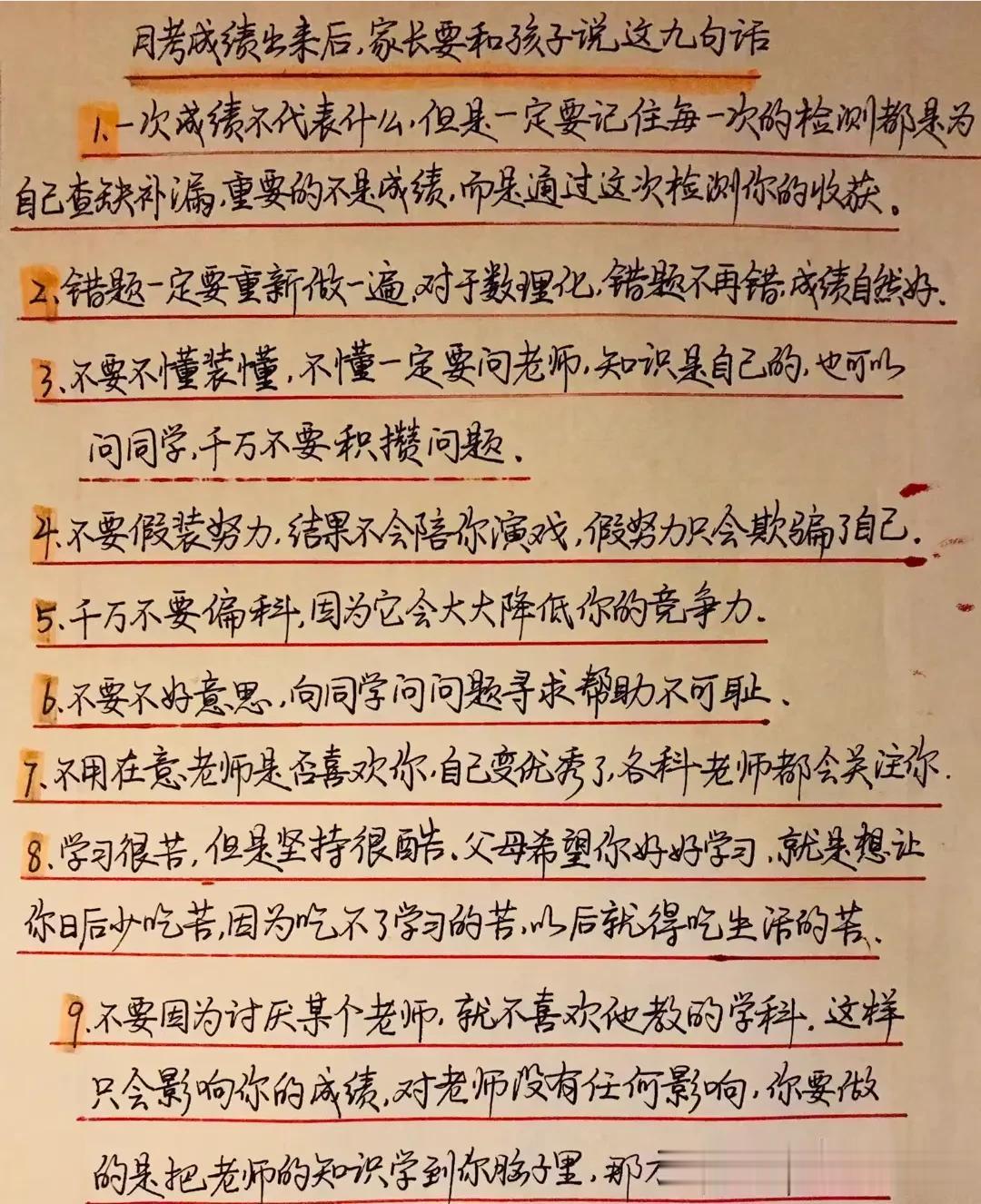 无论儿女多大,父母要经常把这些话说给孩子听,全都是学霸妈妈手写整理出来的,每一句都蕴含着巨大的人生智慧,胜过千万房产和存款,看完之后,才明白,原来小学霸的背后,总是站着一位优秀的妈妈,比如孩子完成作业,妈妈要知道的10种夸法;月考成绩出来后,家长要和孩子说这九句话;告诉孩子先完成作业的好处;培养孩子自信心常对孩子说这5句;不能外借的东西……父母的嘴是孩子最好的风水,想要孩子越来越优秀,一定要背下来!孩子受益一生! 能影响孩子一生的是情商培养,学习方法,解决沟通难题,赶紧保存下来,学一学,记一记,更多培养优秀孩子的技巧下方链接走起!! 学霸妈妈的49项修炼