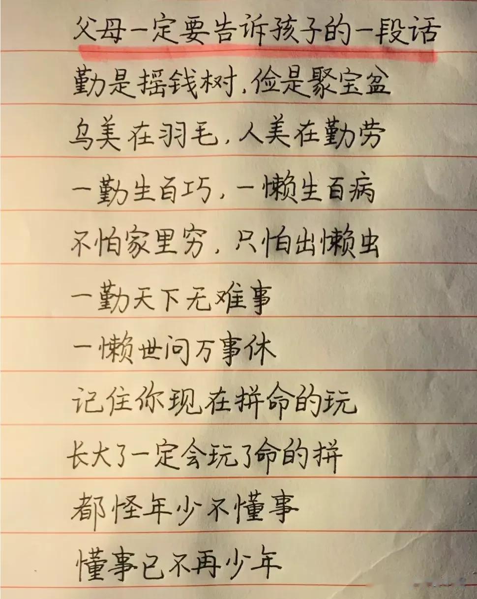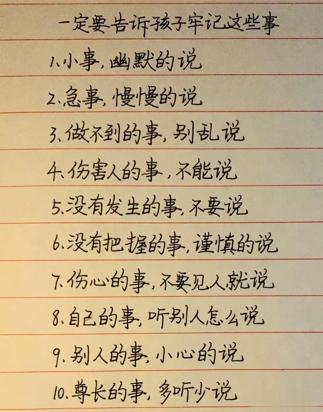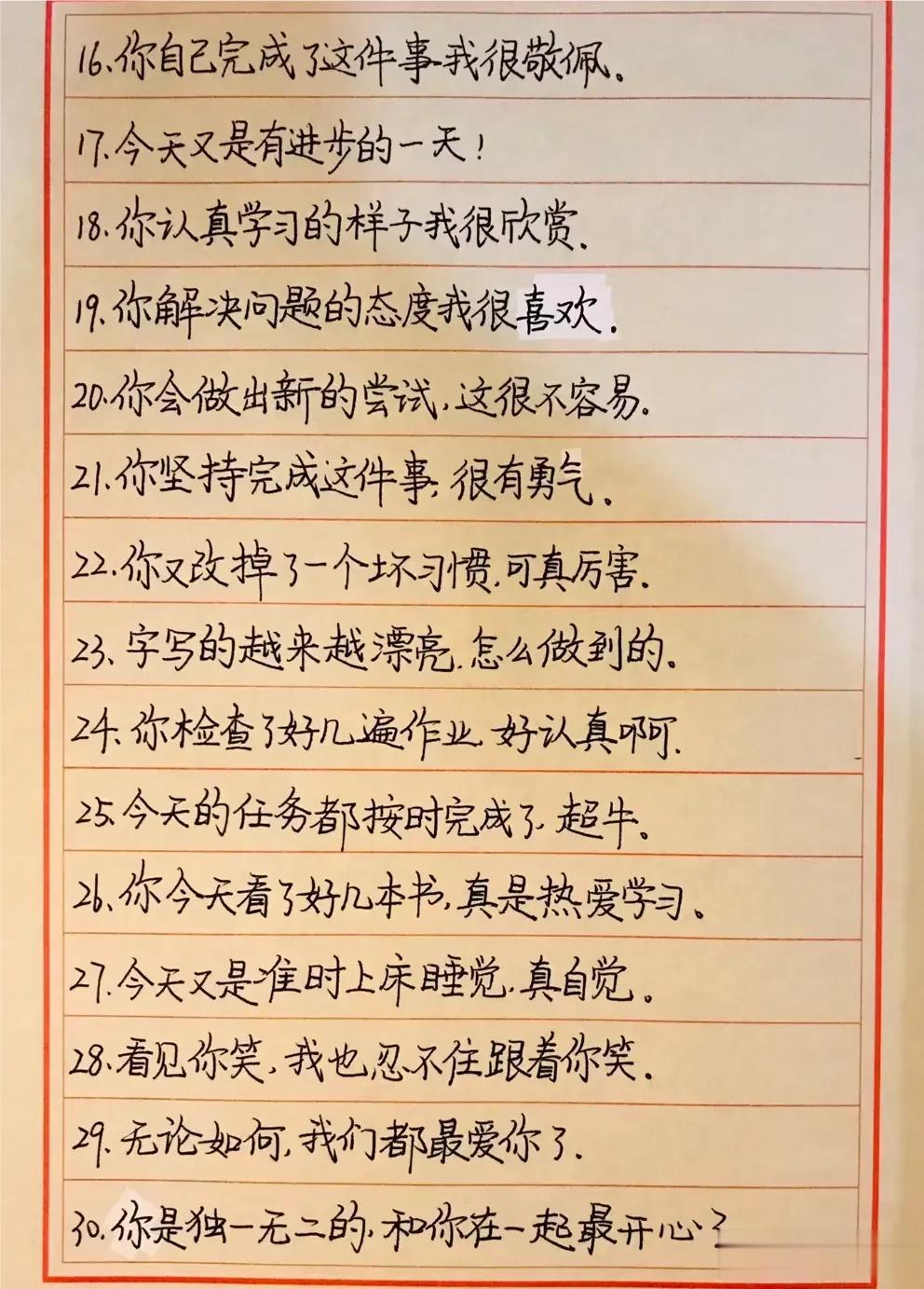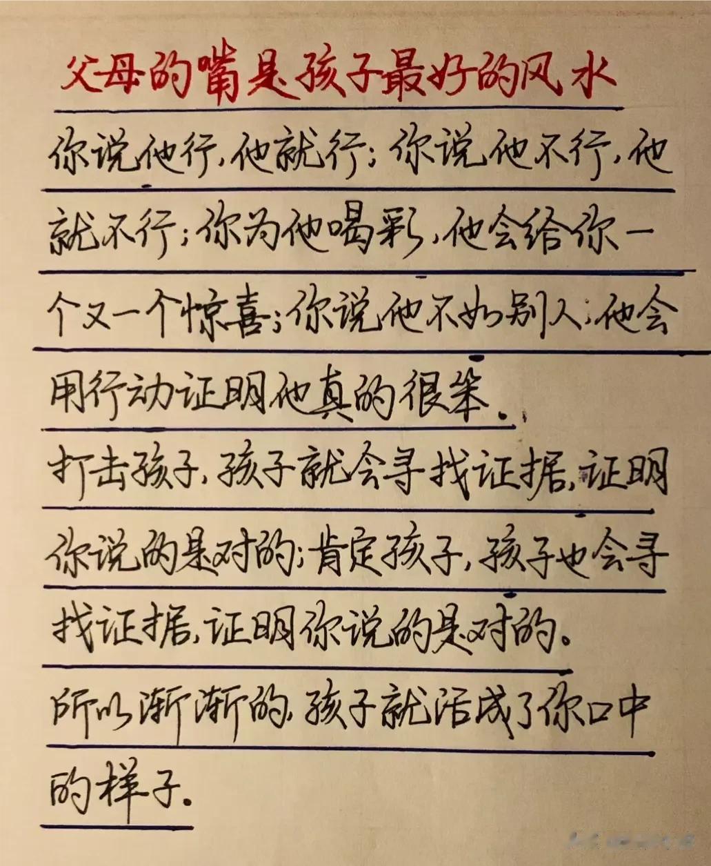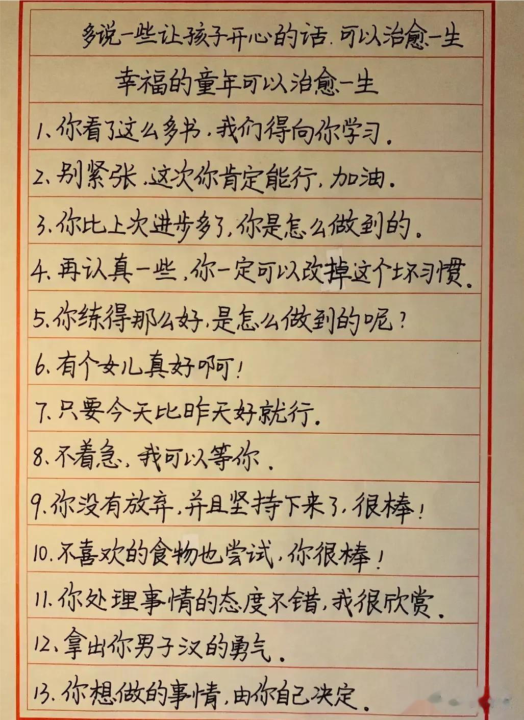无论儿女多大,父母要经常把这些话说给孩子听,全都是学霸妈妈手写整理出来的,每一句都蕴含着巨大的人生智慧,胜过千万房产和存款,看完之后,才明白,原来小学霸的背后,总是站着一位优秀的妈妈,比如孩子完成作业,妈妈要知道的10种夸法;月考成绩出来后,家长要和孩子说这九句话;告诉孩子先完成作业的好处;培养孩子自信心常对孩子说这5句;不能外借的东西……父母的嘴是孩子最好的风水,想要孩子越来越优秀,一定要背下来!孩子受益一生! 能影响孩子一生的是情商培养,学习方法,解决沟通难题,赶紧保存下来,学一学,记一记,更多培养优秀孩子的技巧下方链接走起!! 学霸妈妈的49项修炼
