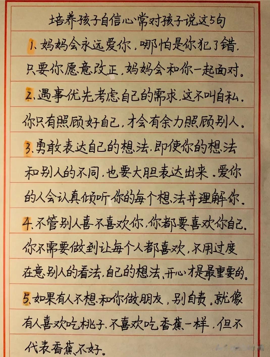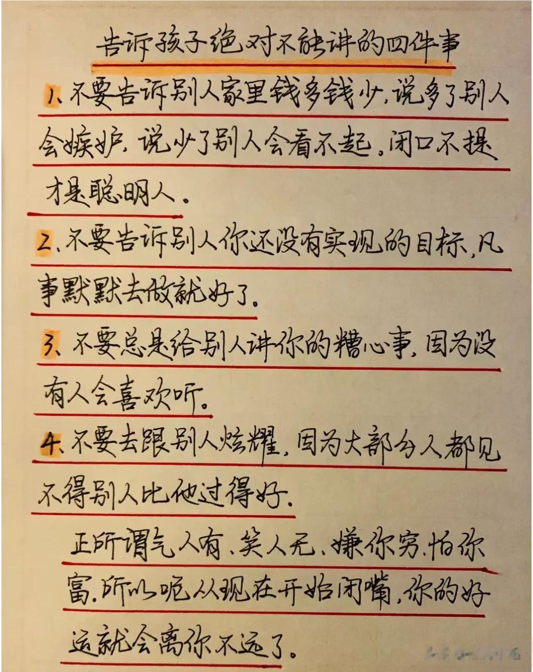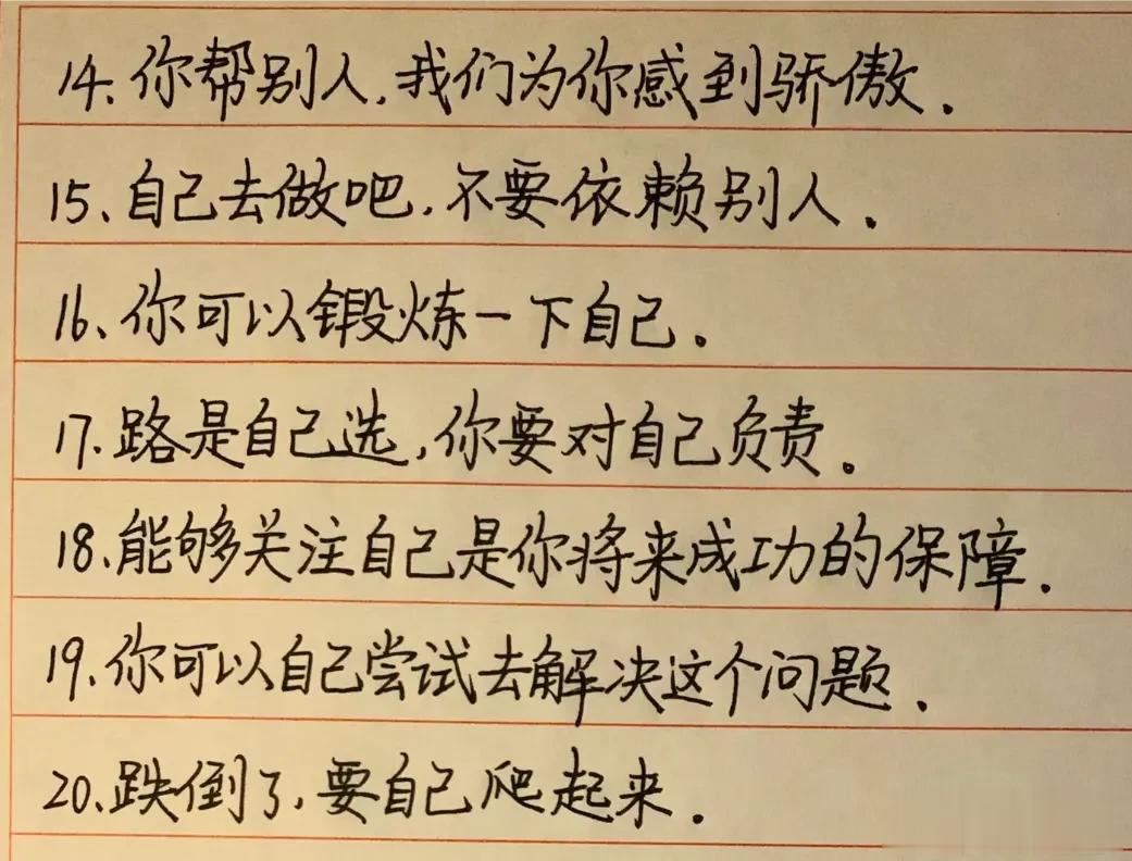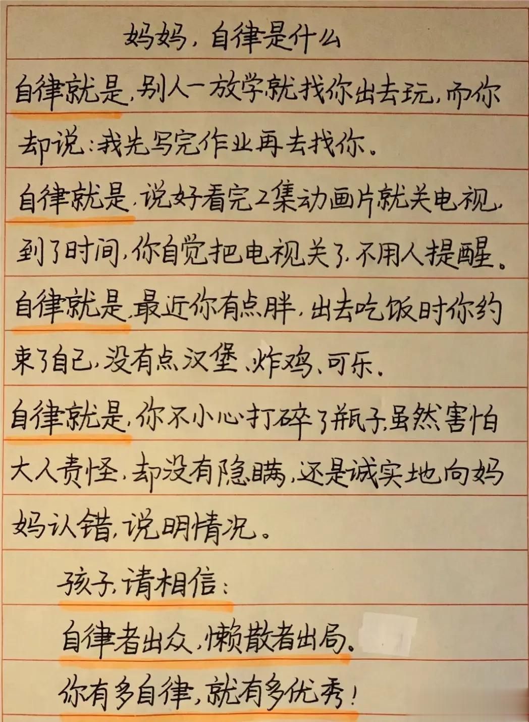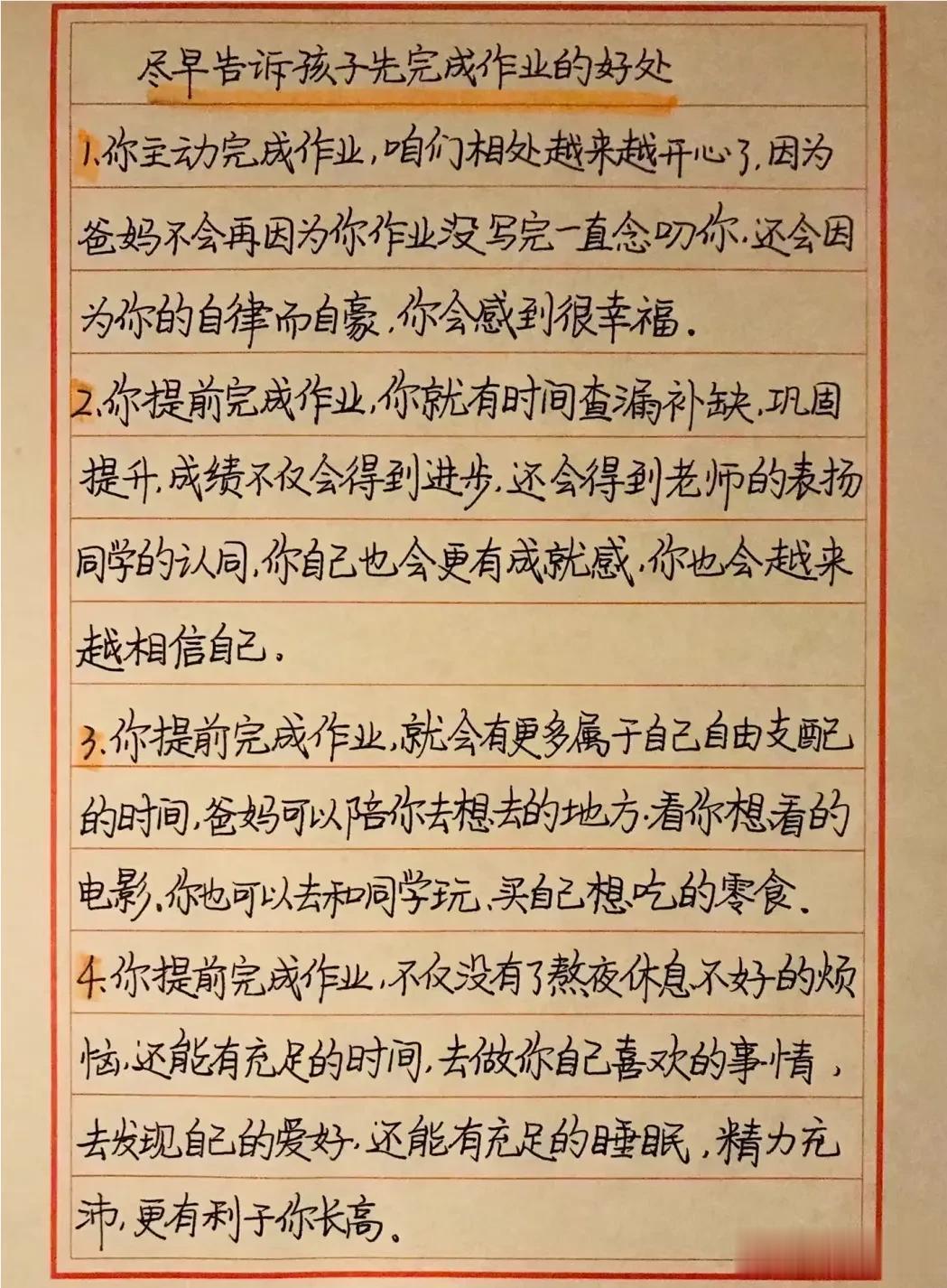 无论儿女多大,父母要经常把这些话说给孩子听,全都是学霸妈妈手写整理出来的,每一句都蕴含着巨大的人生智慧,胜过千万房产和存款,看完之后,才明白,原来小学霸的背后,总是站着一位优秀的妈妈,比如孩子完成作业,妈妈要知道的10种夸法;月考成绩出来后,家长要和孩子说这九句话;告诉孩子先完成作业的好处;培养孩子自信心常对孩子说这5句;不能外借的东西……父母的嘴是孩子最好的风水,想要孩子越来越优秀,一定要背下来!孩子受益一生! 能影响孩子一生的是情商培养,学习方法,解决沟通难题,赶紧保存下来,学一学,记一记,更多培养优秀孩子的技巧下方链接走起!! 学霸妈妈的49项修炼