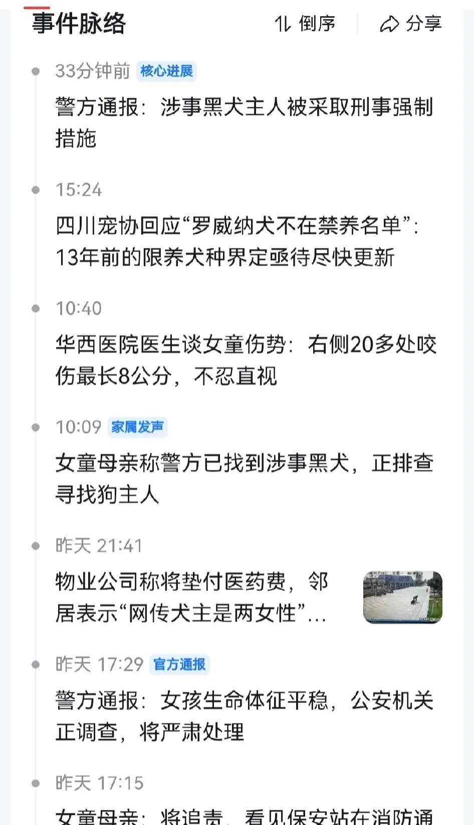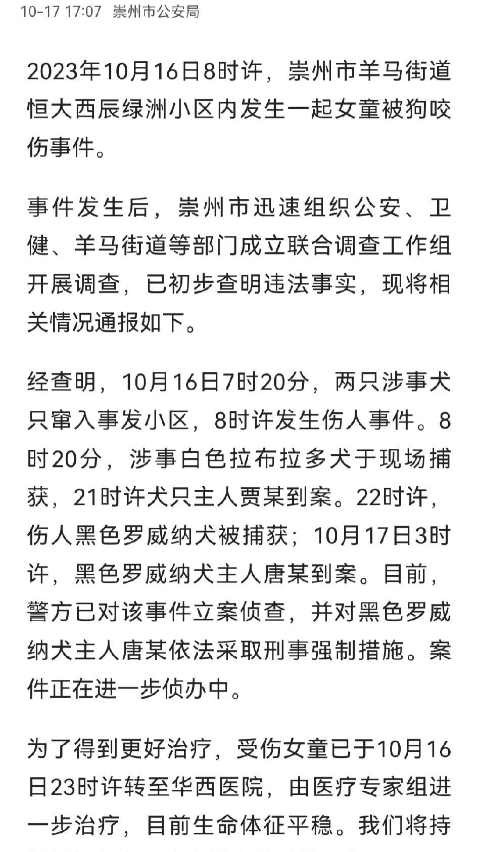 目前,警方已对该事件立案侦查,并对黑色罗威纳犬主人唐某依法采取刑事强制措施。不知道这是不是全国首次,要给崇州警方点赞。