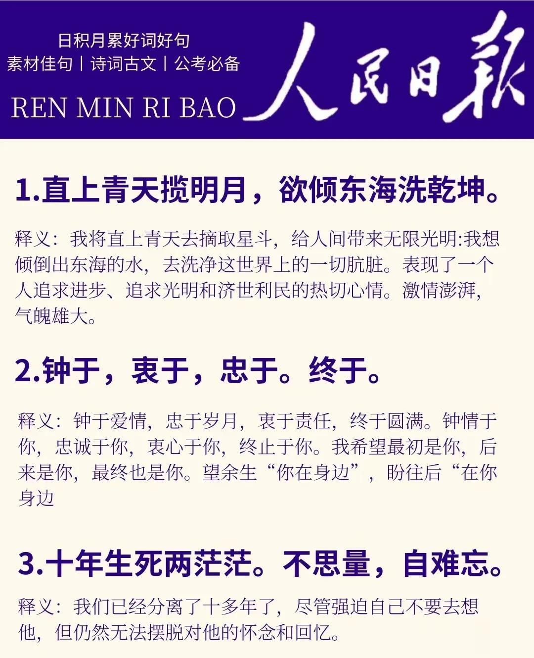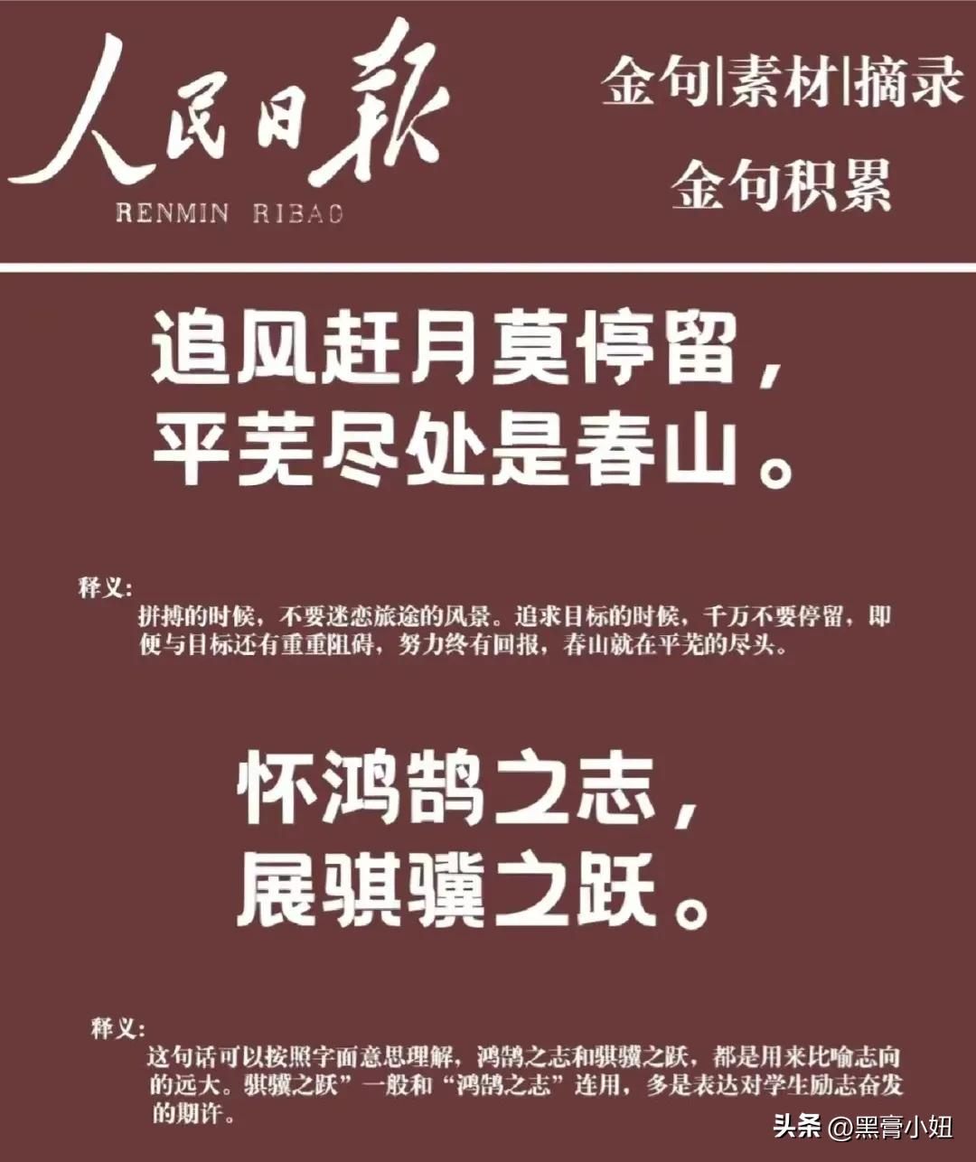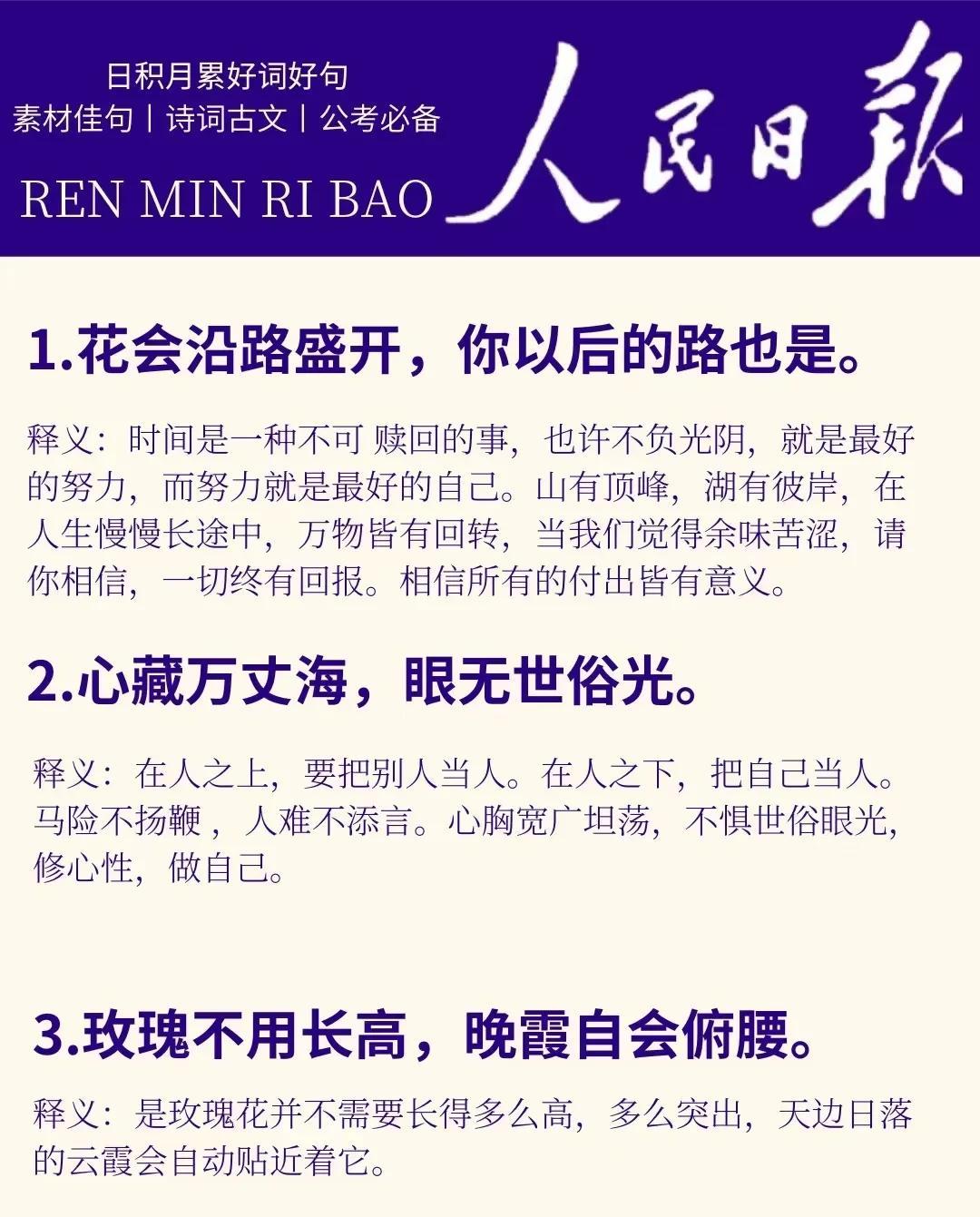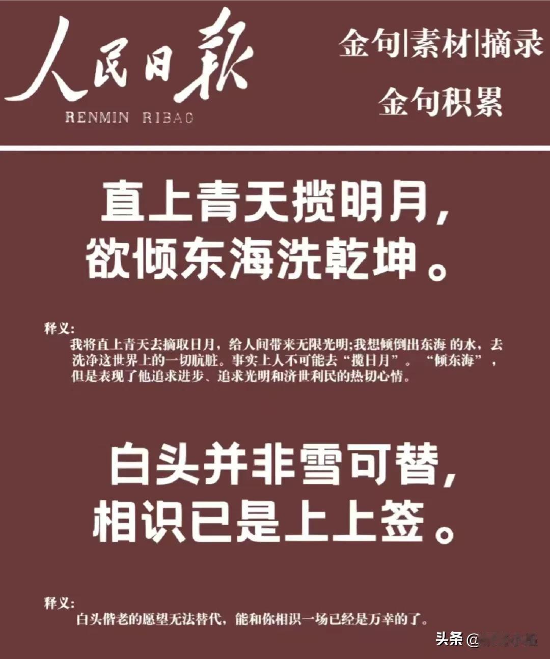 天呐,写的太好了,人民日报不愧是文案界的天花板,背下来你也能口吐莲花,腹有诗书气自华!每一句高级感满满,比如“初心不与年俱老,奋斗永似少年时!”,“追风赶月莫停留,平芙尽处是春山。”“直上青天揽明月,欲倾东海洗乾坤。” 这样的优秀素材,要是写进作文里,妥妥的满分之作,惊艳阅卷老师~ 语文的学习重在平时的点滴积累,没事让孩子多看一看,记一记,跟着人民日报练一练! 人民日报金句与使用