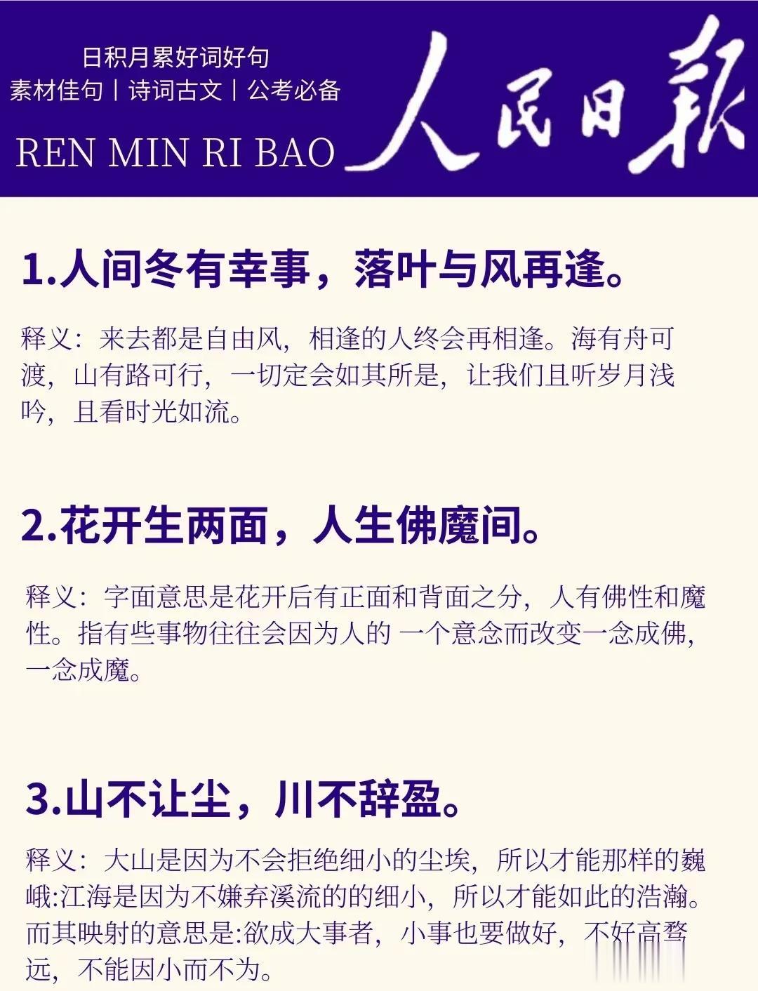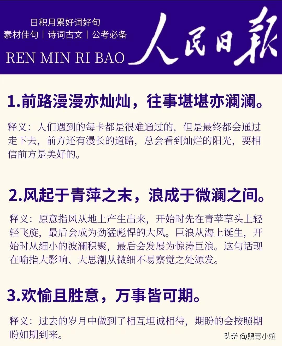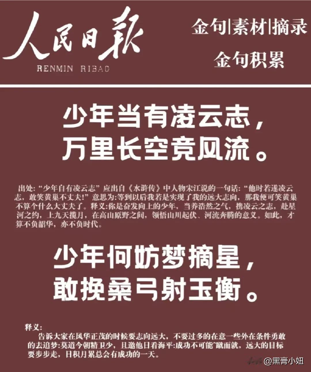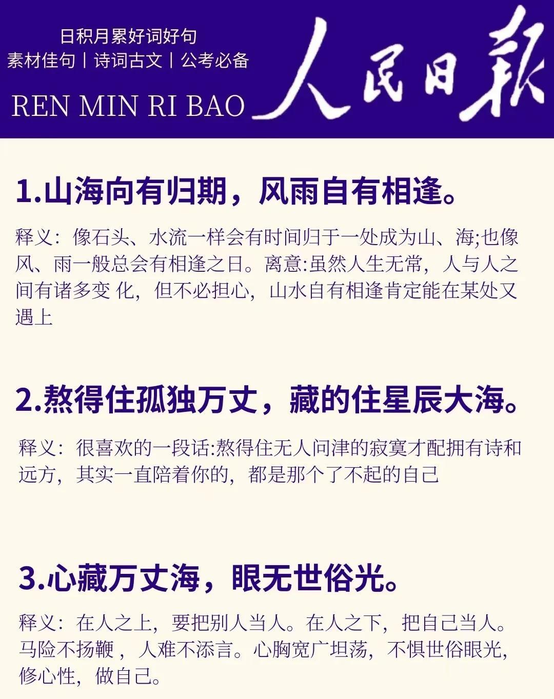 天呐,写的太好了,人民日报不愧是文案界的天花板,背下来你也能口吐莲花,腹有诗书气自华!每一句高级感满满,比如“初心不与年俱老,奋斗永似少年时!”,“追风赶月莫停留,平芙尽处是春山。”“直上青天揽明月,欲倾东海洗乾坤。” 这样的优秀素材,要是写进作文里,妥妥的满分之作,惊艳阅卷老师~ 语文的学习重在平时的点滴积累,没事让孩子多看一看,记一记,跟着人民日报练一练! 人民日报金句与使用