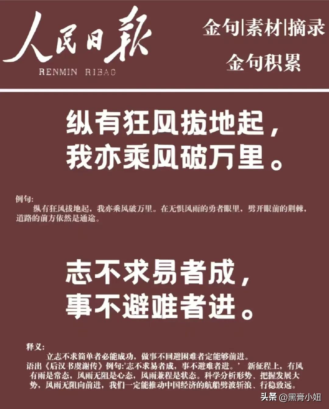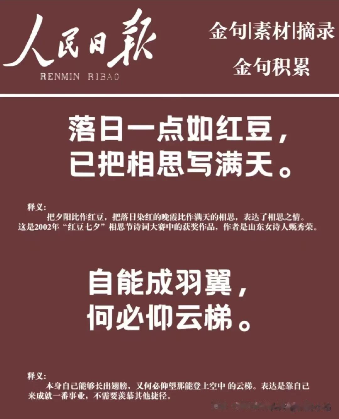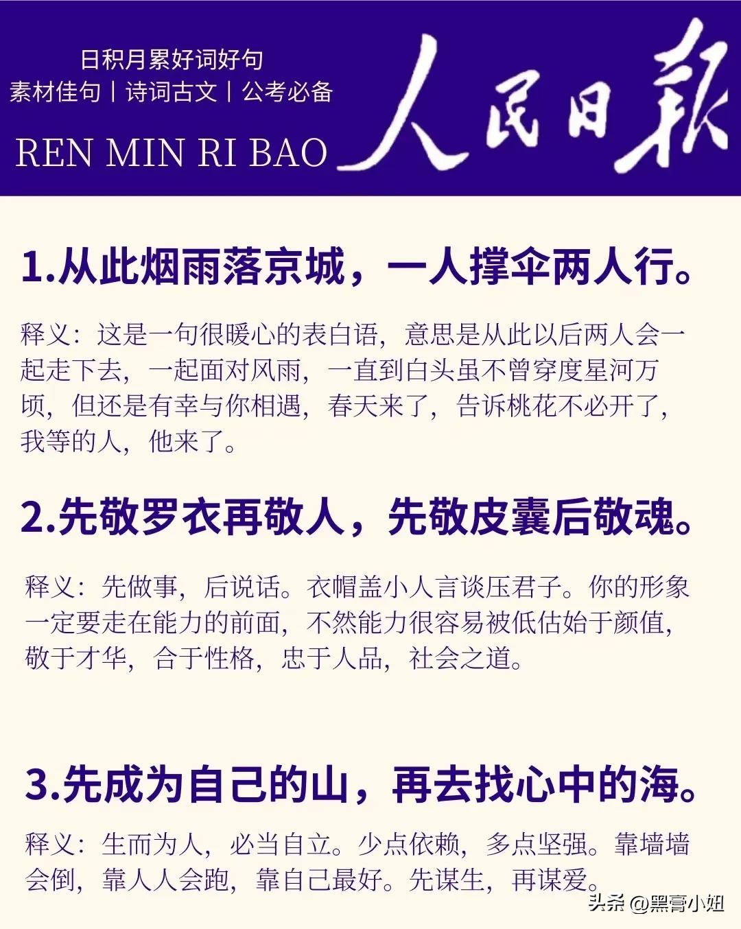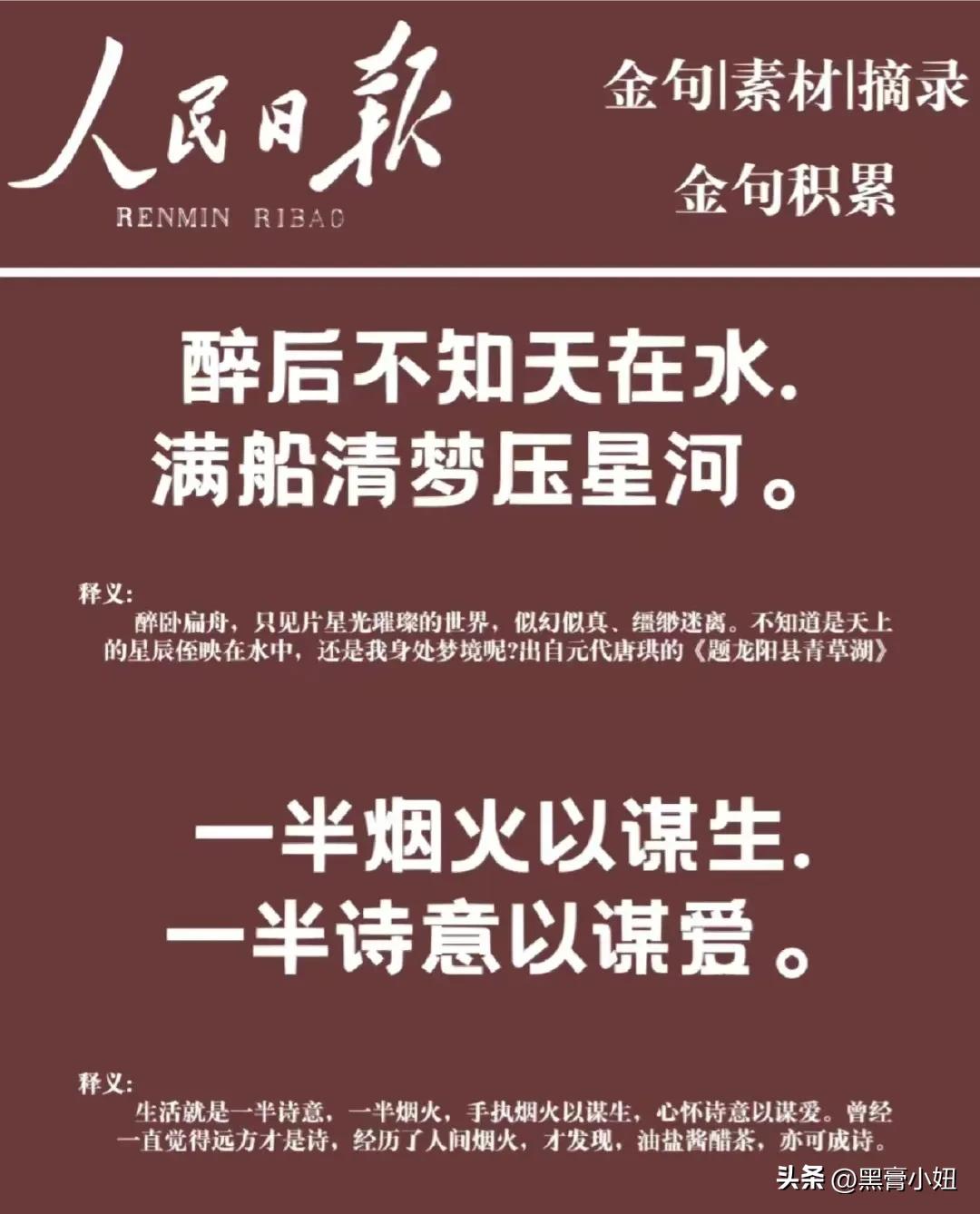 天呐,写的太好了,人民日报不愧是文案界的天花板,背下来你也能口吐莲花,腹有诗书气自华!每一句高级感满满,比如“初心不与年俱老,奋斗永似少年时!”,“追风赶月莫停留,平芙尽处是春山。”“直上青天揽明月,欲倾东海洗乾坤。” 这样的优秀素材,要是写进作文里,妥妥的满分之作,惊艳阅卷老师~ 语文的学习重在平时的点滴积累,没事让孩子多看一看,记一记,跟着人民日报练一练! 人民日报金句与使用