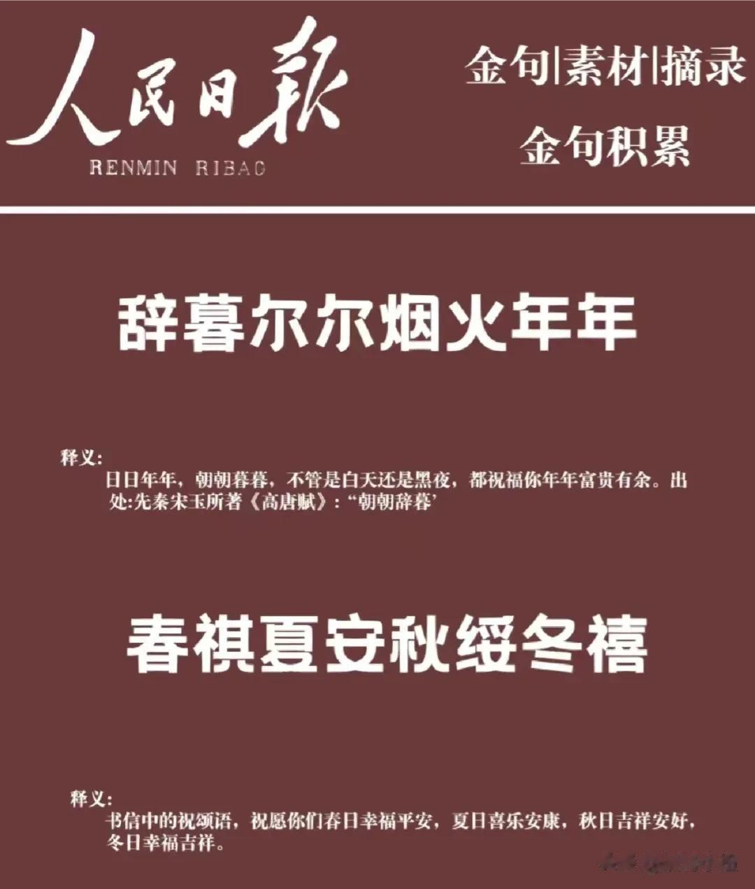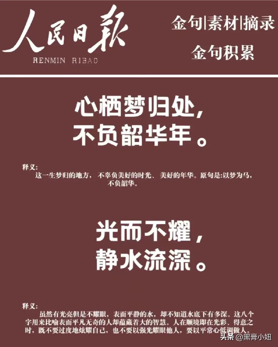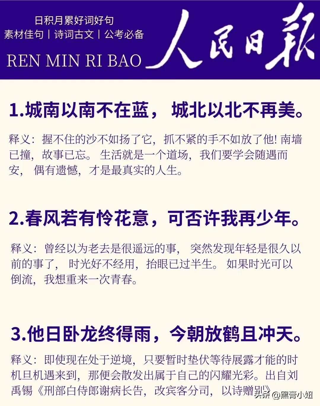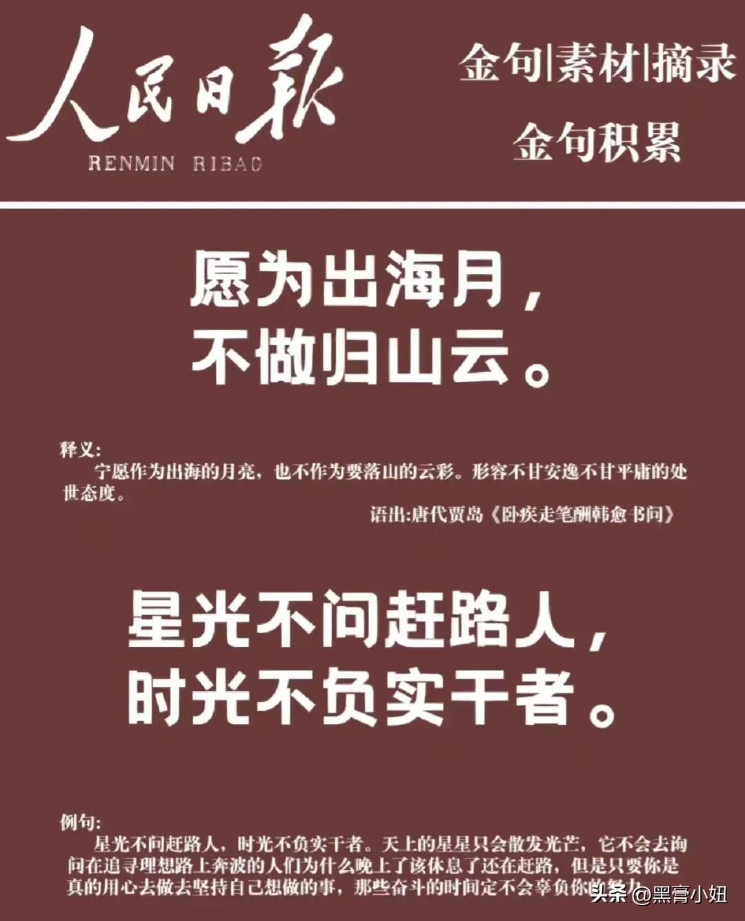 天呐,写的太好了,人民日报不愧是文案界的天花板,背下来你也能口吐莲花,腹有诗书气自华!每一句高级感满满,比如“初心不与年俱老,奋斗永似少年时!”,“追风赶月莫停留,平芙尽处是春山。”“直上青天揽明月,欲倾东海洗乾坤。” 这样的优秀素材,要是写进作文里,妥妥的满分之作,惊艳阅卷老师~ 语文的学习重在平时的点滴积累,没事让孩子多看一看,记一记,跟着人民日报练一练! 人民日报金句与使用