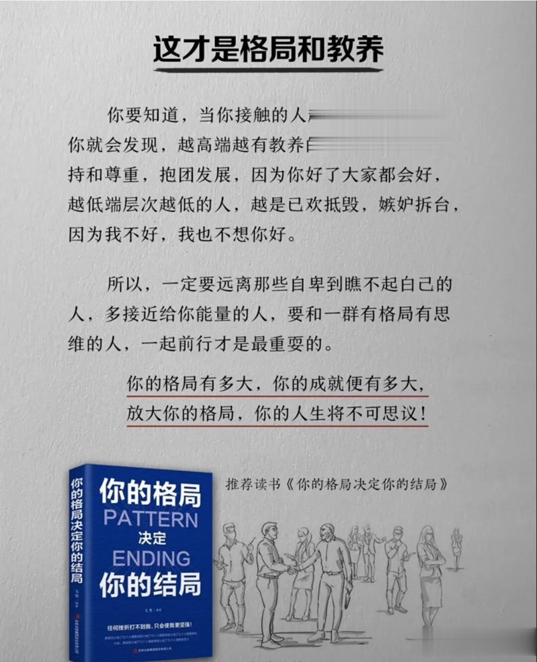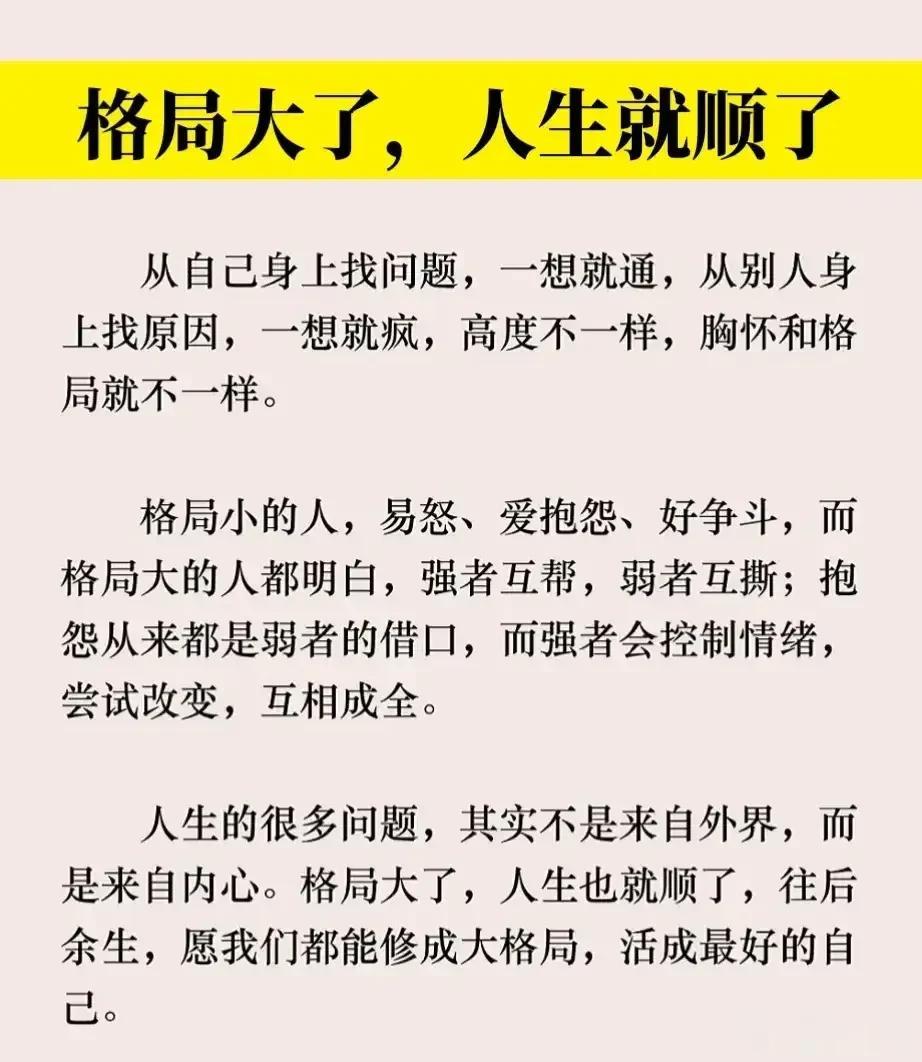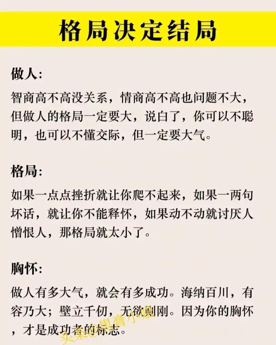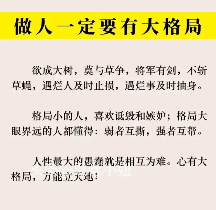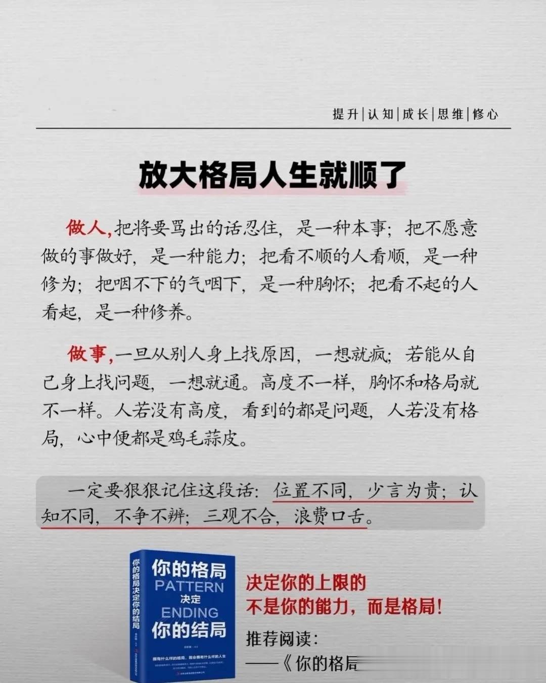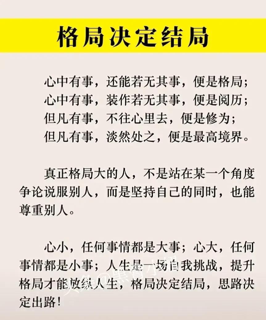 一位资深学者的一段话:你的格局越大,你的人生就越顺!看完之后,豁朗开朗!原来那些成大事的人,都具有大格局,道路才越走越宽。眼界更宽更广,能沉得住气,更好的规划未来。 决定你的上限,不是你的能力,而是格局。 一定要狠狠记住这段话:位置不同,少言为贵;认知不同,不争不辨;三观不合,浪费口舌。 决定我们命运的不是环境,而是心态。大千世界芸芸众生,不同的人有着不同的命运,而格局则能左在我们的命运。格局并不是先天带来的而是后天形成的。赶紧来提升自己的格局与命运吧! 你的格局决定你的结局