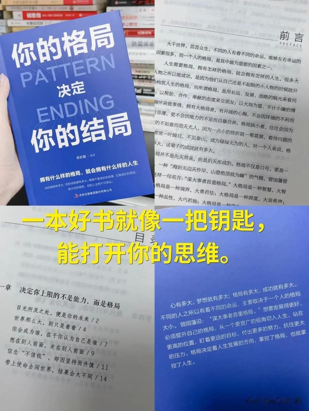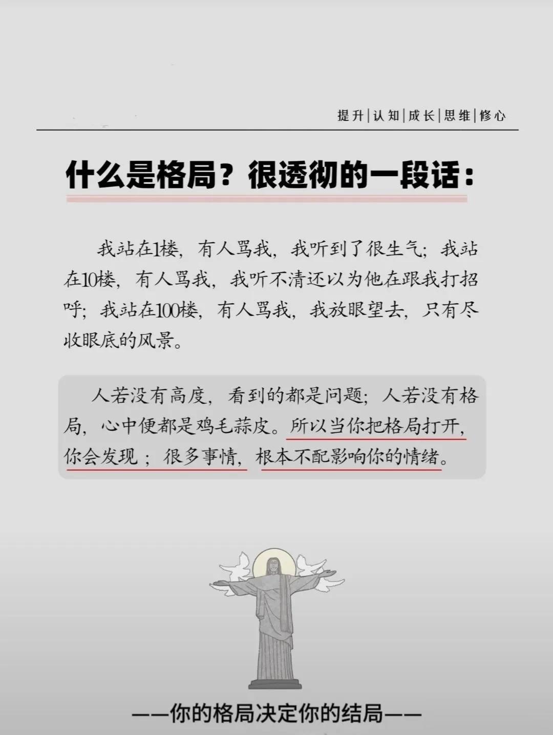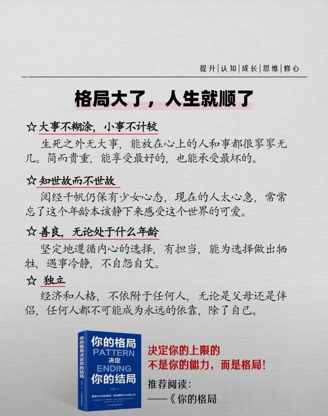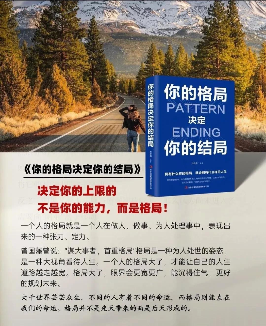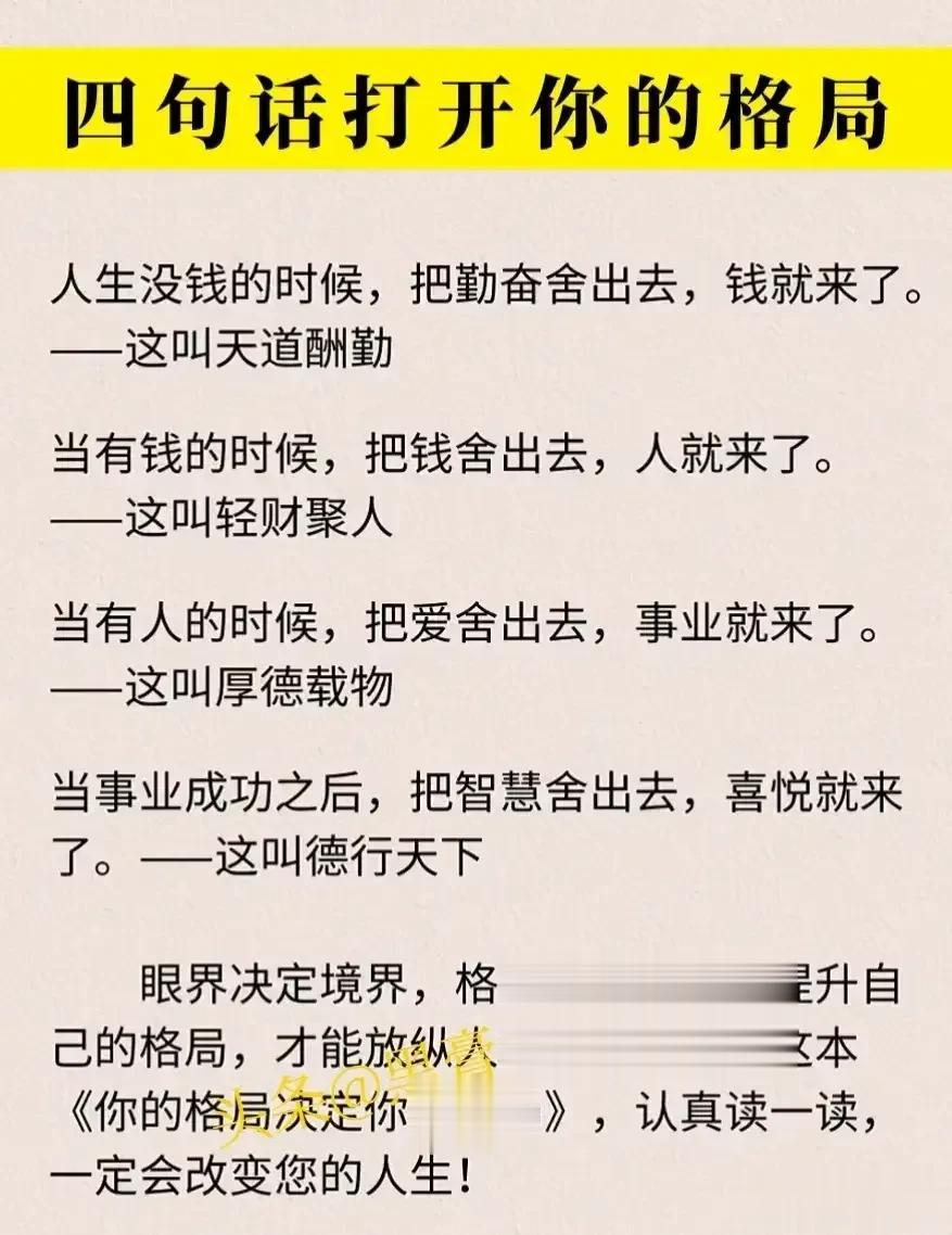 一位资深学者的一段话:你的格局越大,你的人生就越顺!看完之后,豁朗开朗!原来那些成大事的人,都具有大格局,道路才越走越宽。眼界更宽更广,能沉得住气,更好的规划未来。 决定你的上限,不是你的能力,而是格局。 一定要狠狠记住这段话:位置不同,少言为贵;认知不同,不争不辨;三观不合,浪费口舌。 决定我们命运的不是环境,而是心态。大千世界芸芸众生,不同的人有着不同的命运,而格局则能左在我们的命运。格局并不是先天带来的而是后天形成的。赶紧来提升自己的格局与命运吧! 你的格局决定你的结局