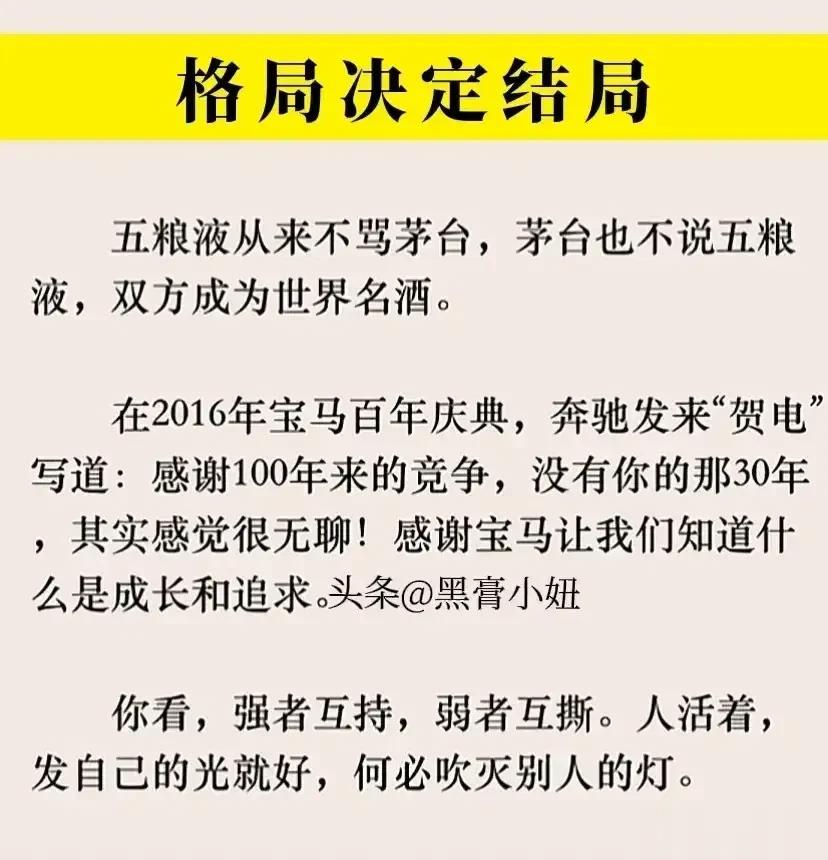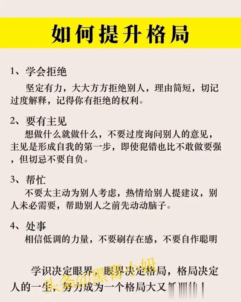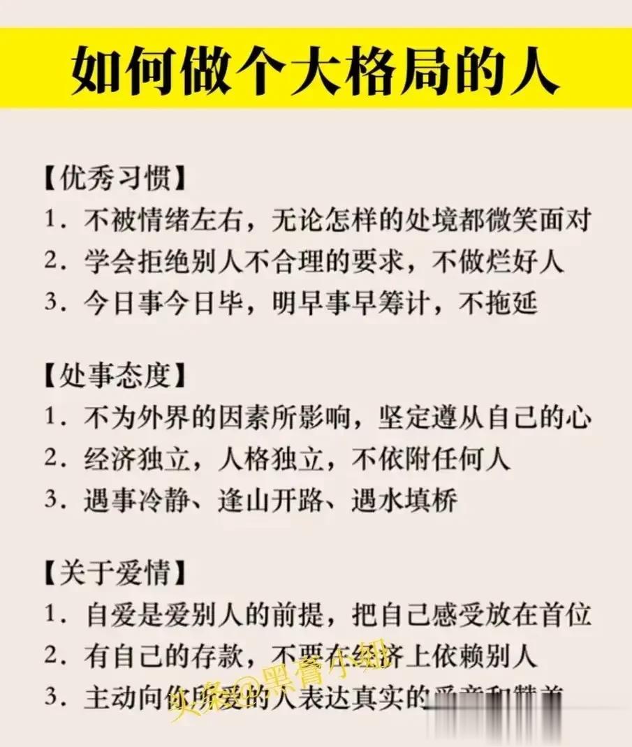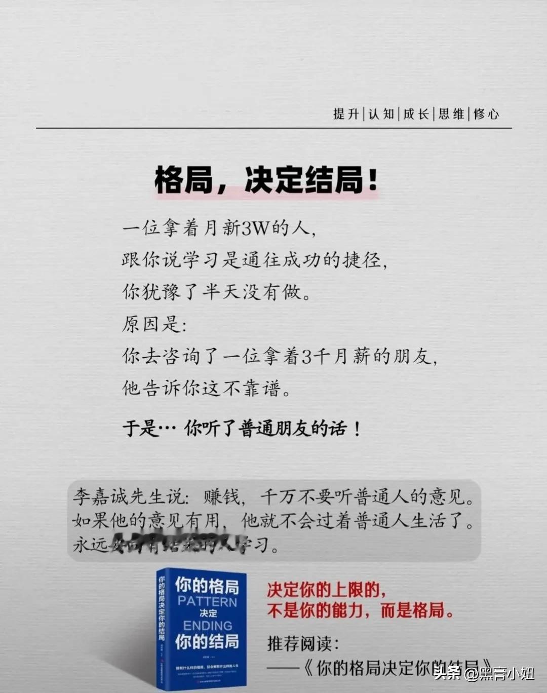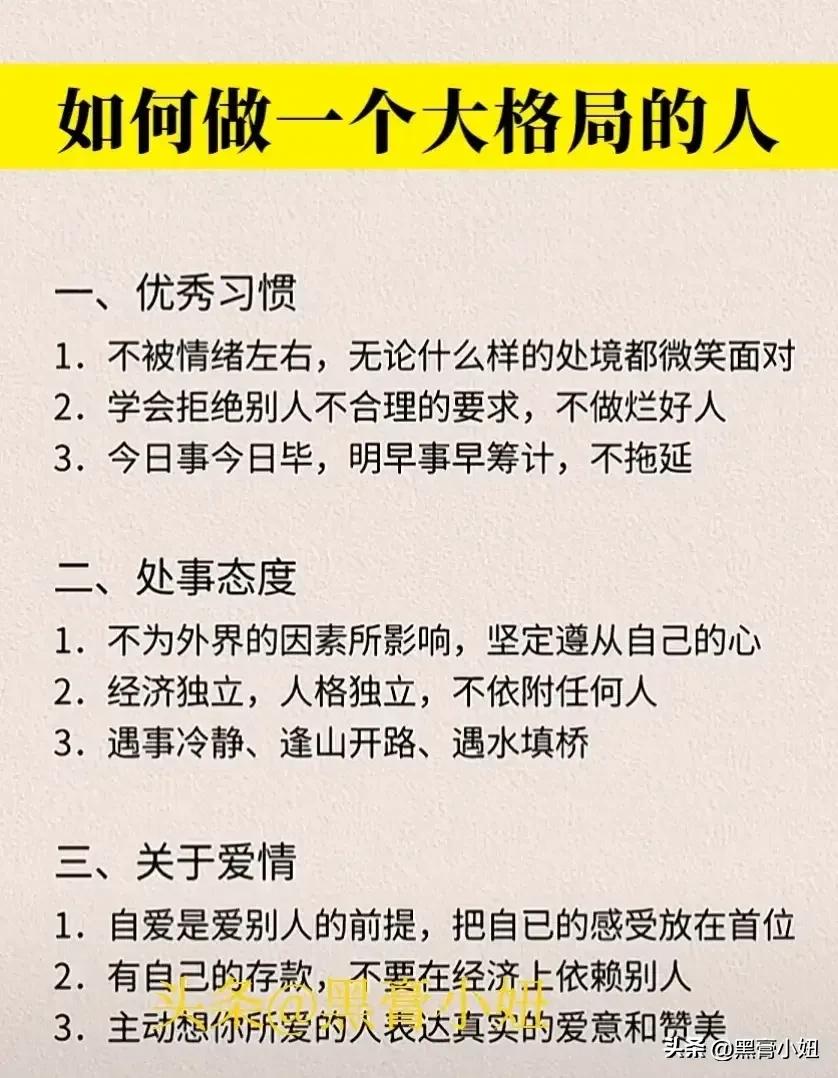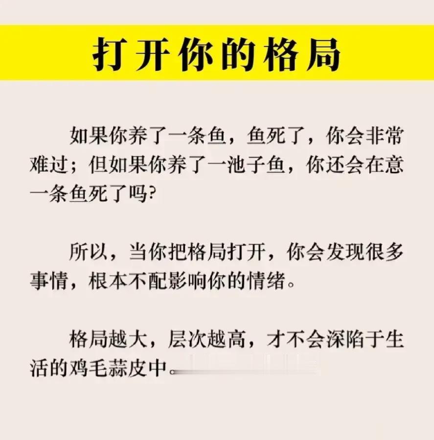 一位资深学者的一段话:你的格局越大,你的人生就越顺!看完之后,豁朗开朗!原来那些成大事的人,都具有大格局,道路才越走越宽。眼界更宽更广,能沉得住气,更好的规划未来。 决定你的上限,不是你的能力,而是格局。 一定要狠狠记住这段话:位置不同,少言为贵;认知不同,不争不辨;三观不合,浪费口舌。 决定我们命运的不是环境,而是心态。大千世界芸芸众生,不同的人有着不同的命运,而格局则能左在我们的命运。格局并不是先天带来的而是后天形成的。赶紧来提升自己的格局与命运吧! 你的格局决定你的结局