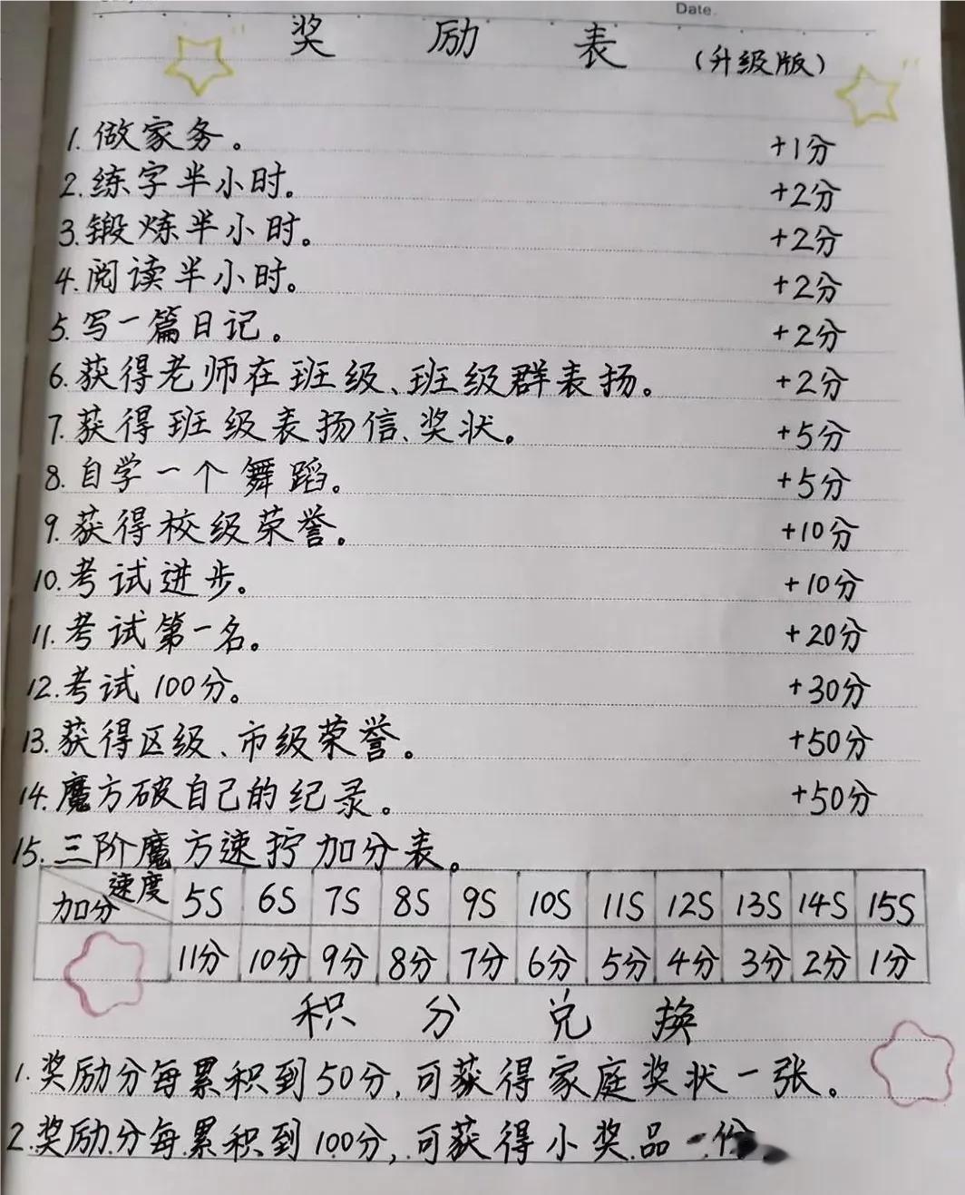 这位妈妈太牛了,亲自给孩子手写了一份奖励表,并详细写明了奖励明细和积分兑换要求,孩子执行后,越来越优秀,不仅生活习惯好了,学习习惯也得上一个质的提升!家有孩子的父母,值得借鉴!好的习惯从小养成,父母不要错过最佳的教育时机! 小学成长自律表奖励
