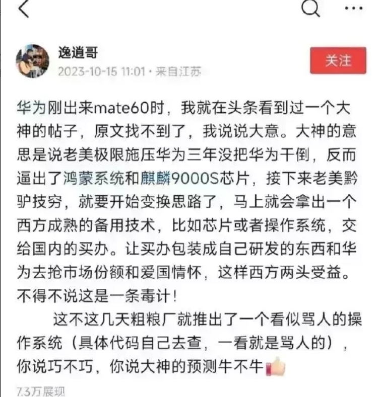 因为这个消息刚刚是华为成功突破美国围堵打压后出来的,所以说网络上铺天盖地都是嘲讽小米就是一个买办,雷军“雷布斯”变成了“雷传志”!