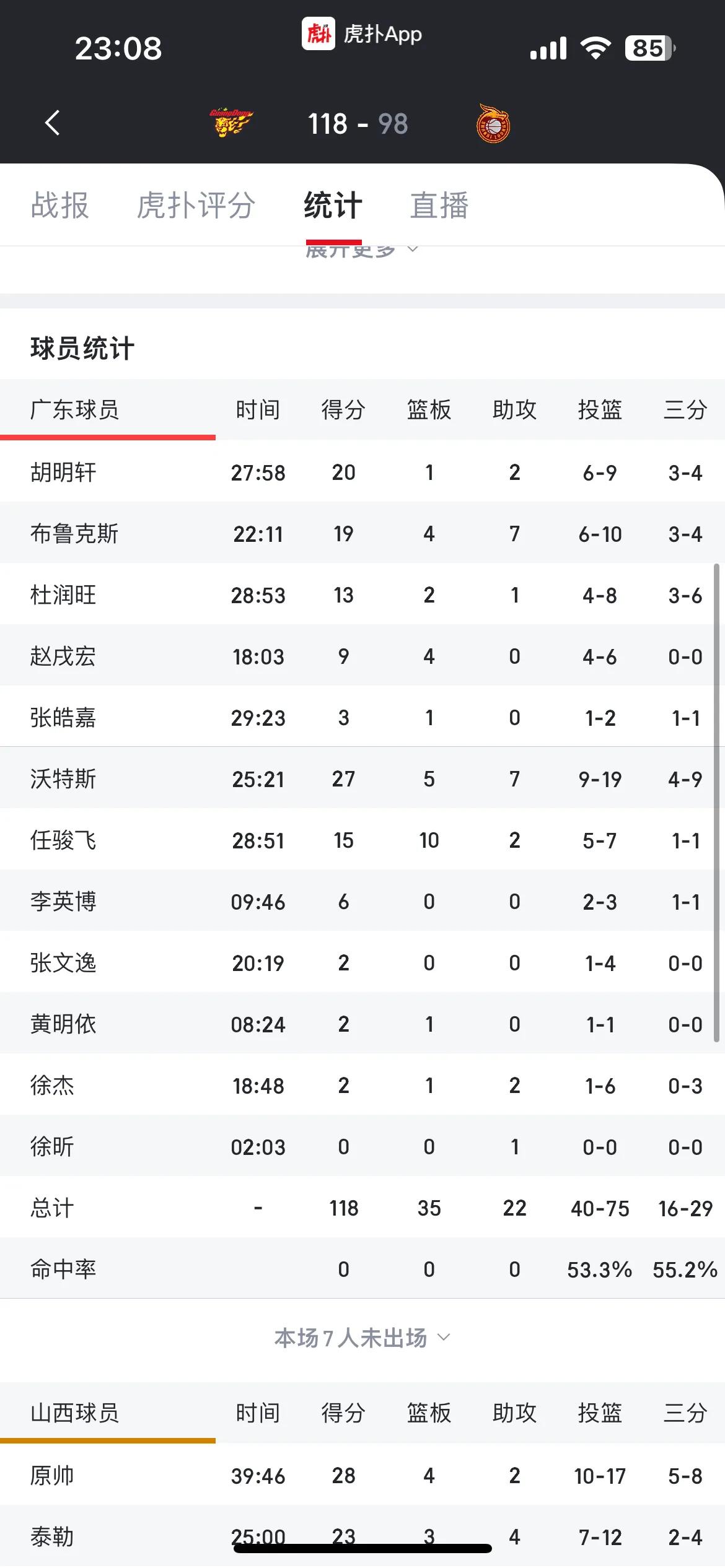 CBA广东118比98战胜山西迎来开门红,说明三点: 1.广东队捡到宝了,波多黎各沃特斯延续男篮世界杯的优秀表现。水哥+马尚这赛季广东外援组合应该是全联盟最强了。 2.胡明轩和杜润旺进步明显,在赵睿离队、阿联退役、周琦养伤的情况下,他们需要承担更多国内球员得分的责任。 3.内线和替补依然非常空虚。在遇到实力不强的山西,内线球员的得分依然较为寒酸,仍靠二飞撑场面,首发的中锋赵戌宏是一个我也没有听过的名字,表现还行。但两位前锋张皓嘉和张文逸(也是第一次听说)的数据非常灾难。