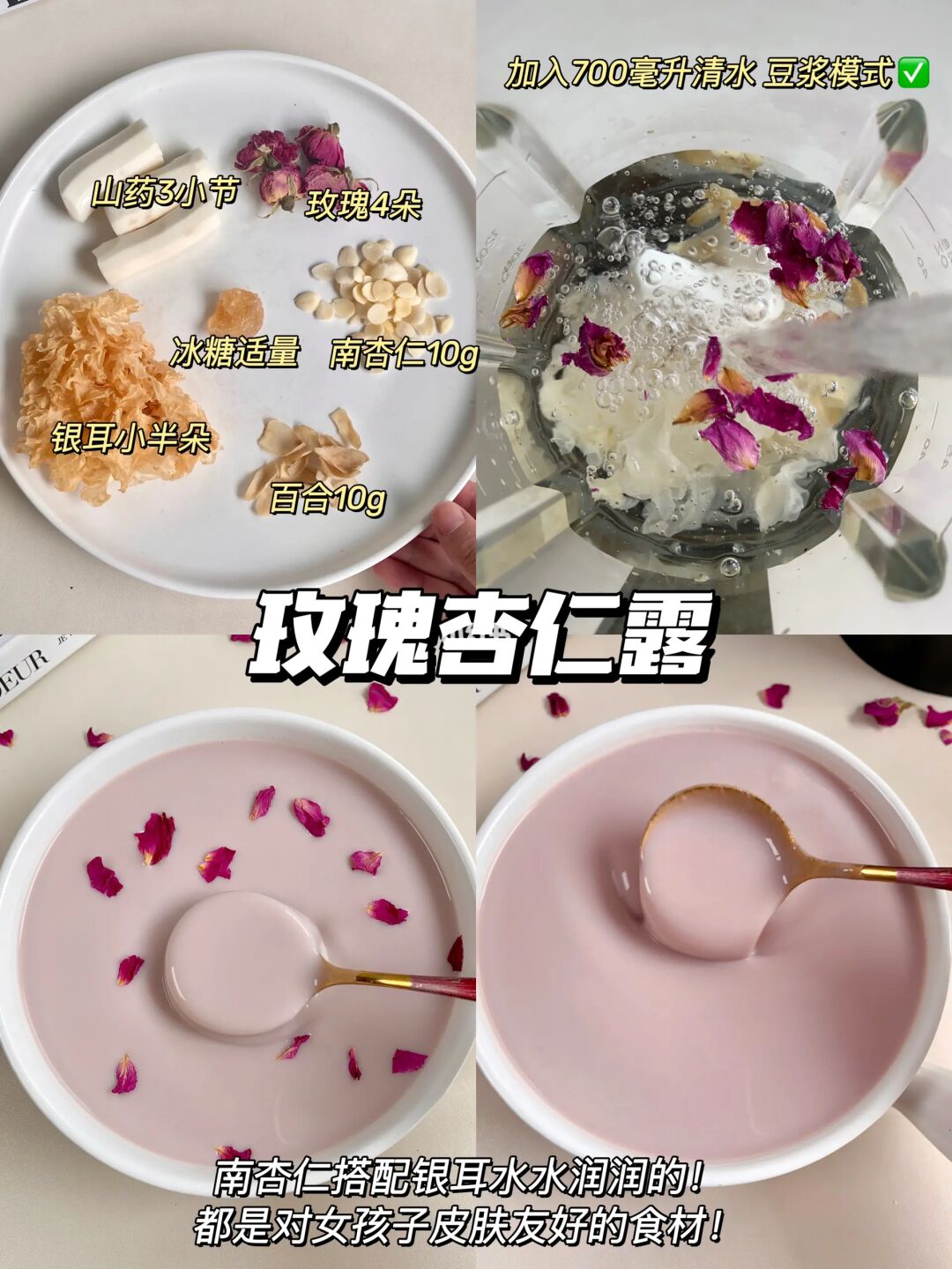 银耳小半朵➕南杏仁10g➕百合10g➕玫瑰4朵➕山药3小节