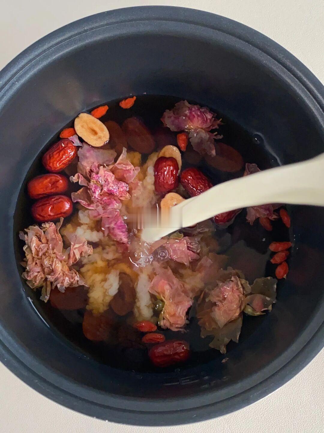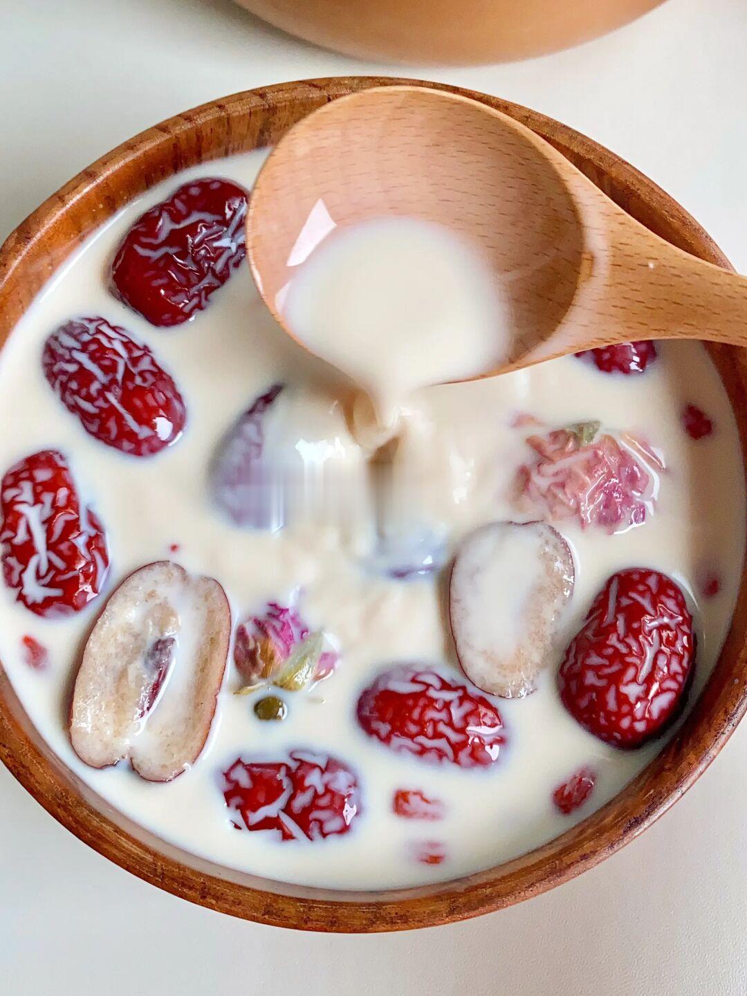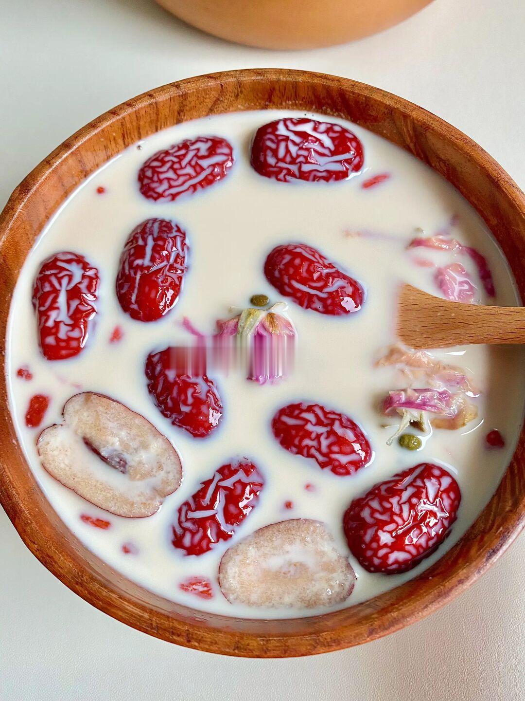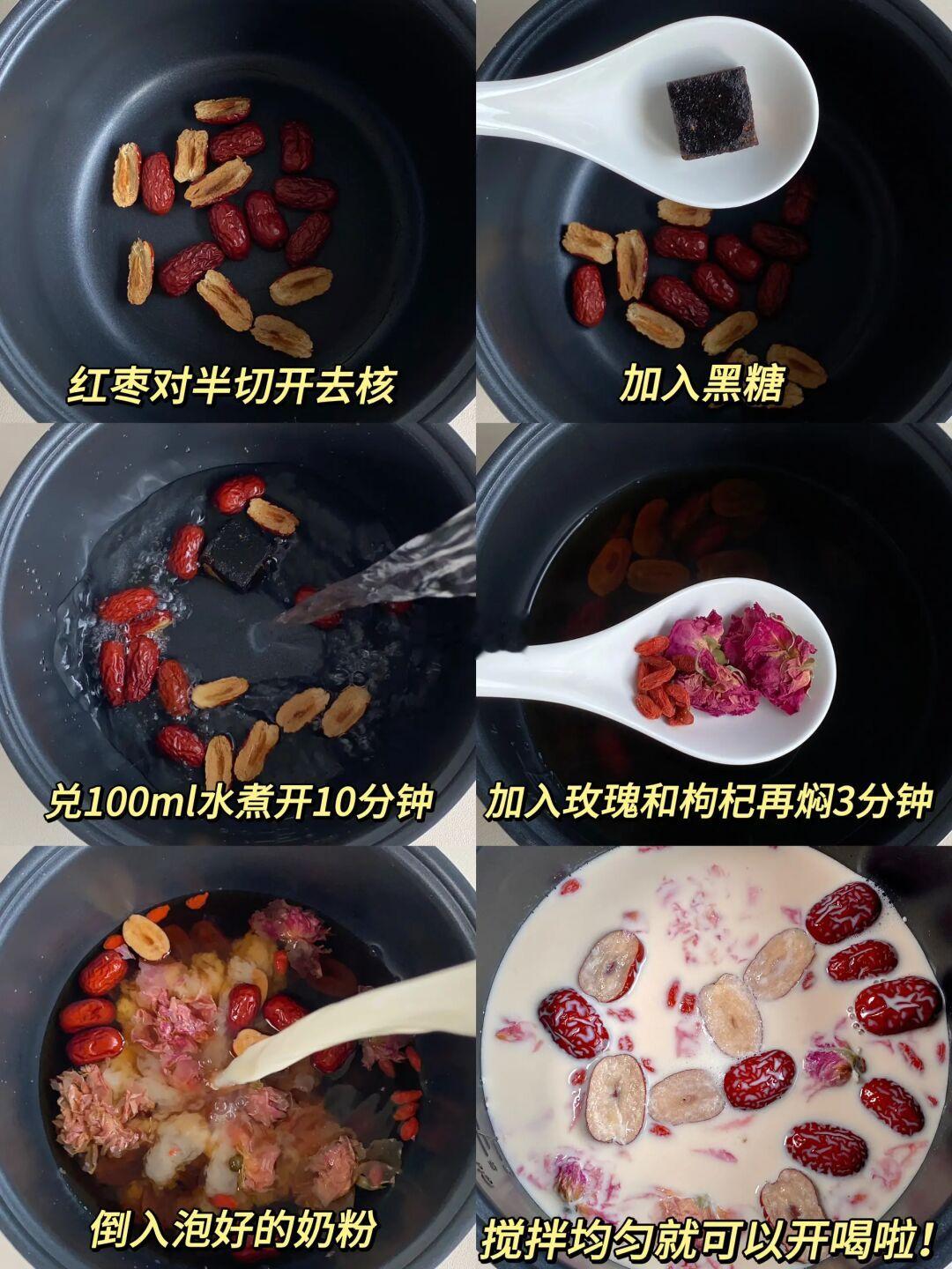 🥣做法:红枣切片去核,和黑糖放入锅中加100ml清水煮开3分钟,再加入玫瑰和枸杞焖泡3分钟,最后倒入泡好的奶粉搅拌即可