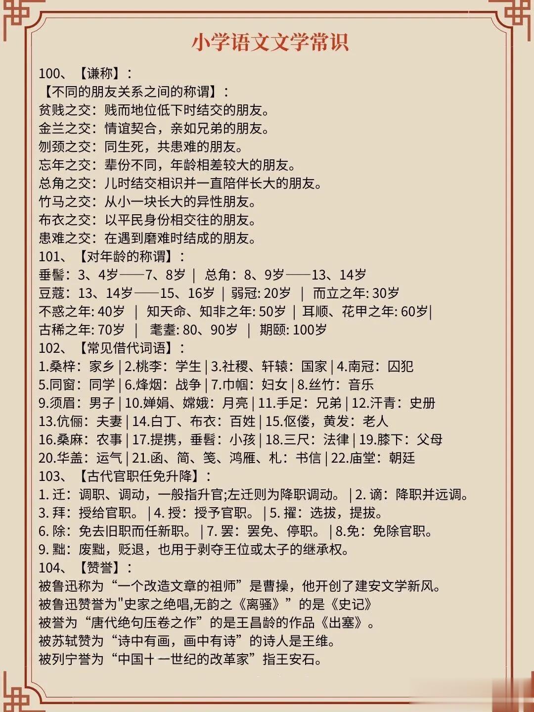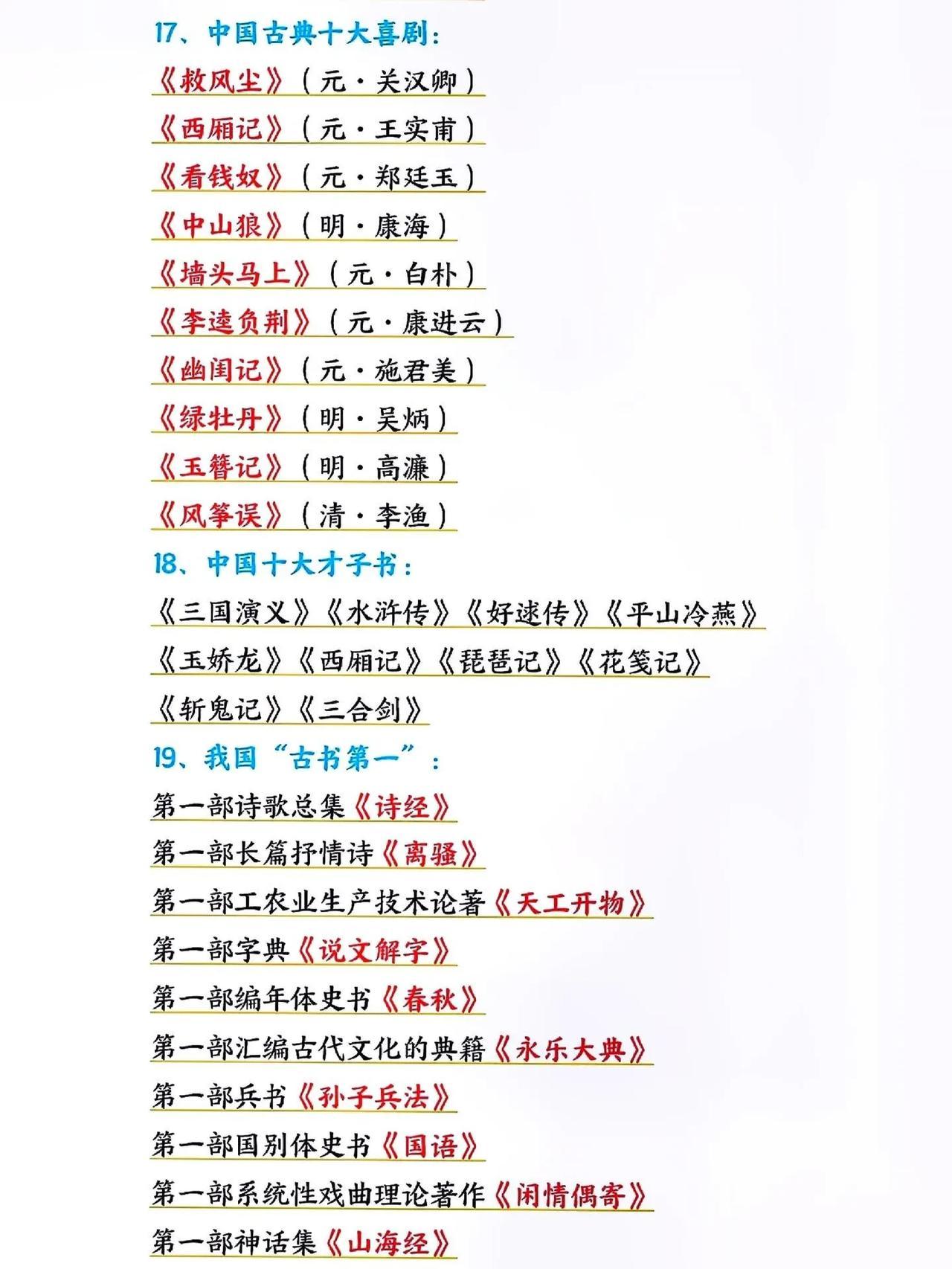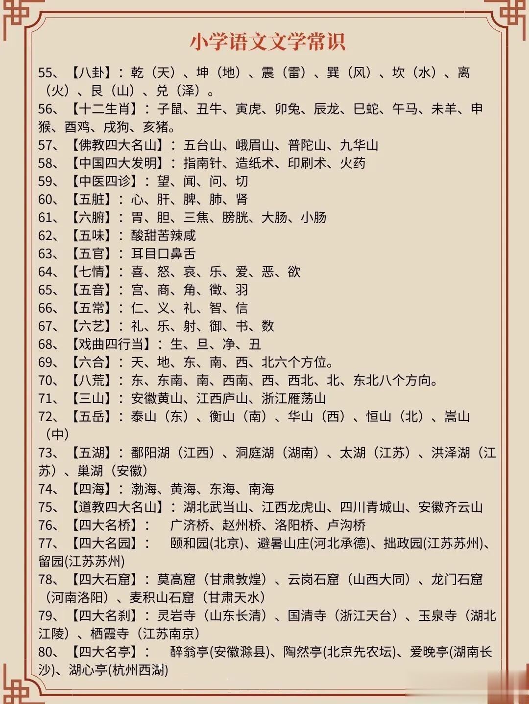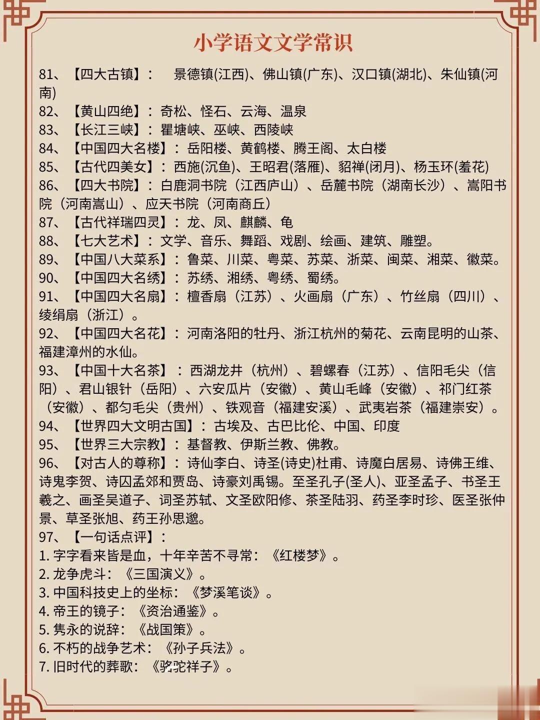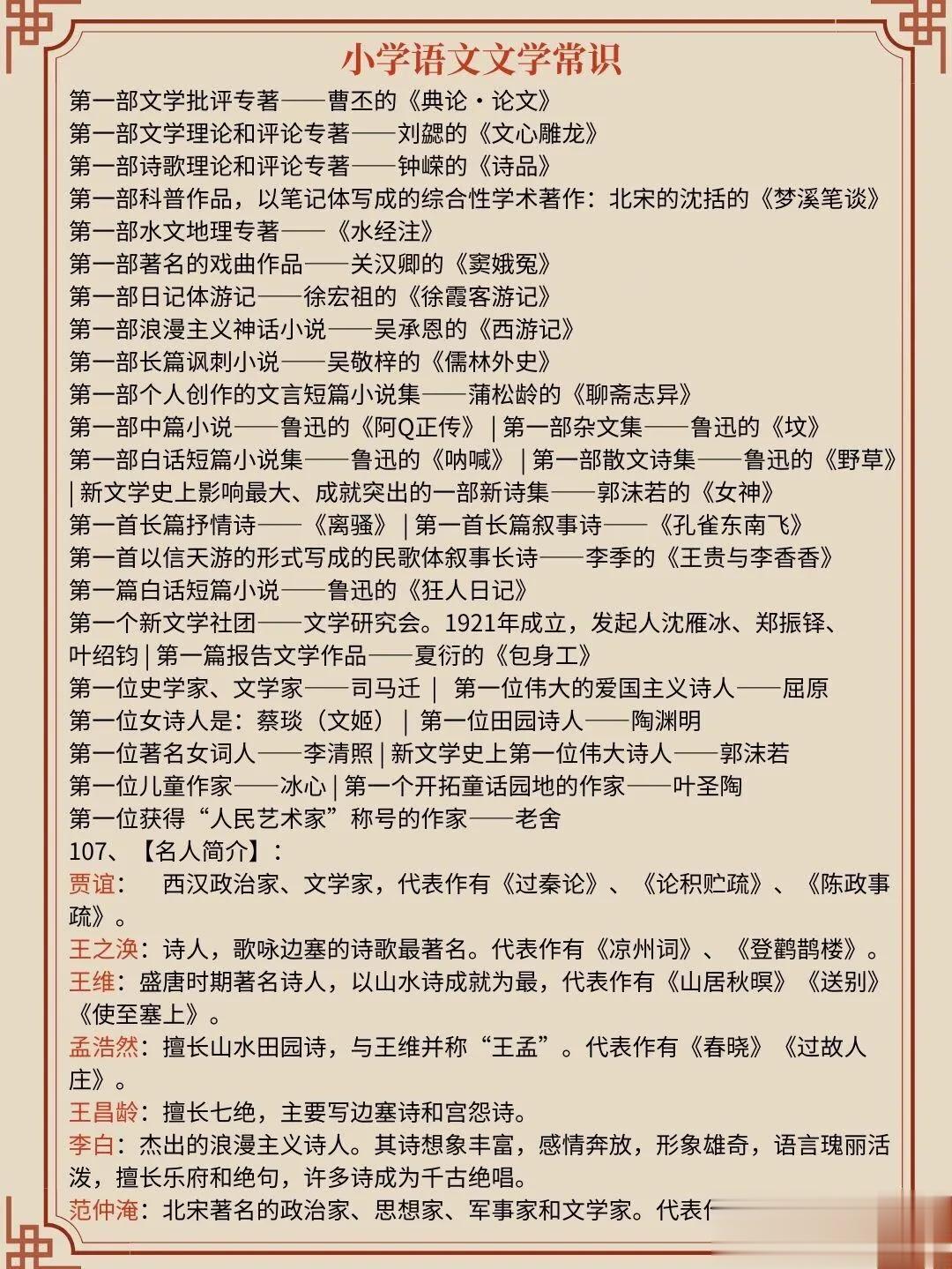 一份超全的国学文学知识大全,全都是考试常考的题目,没有比这更全面得了,小初高都能用上哦!家长们替孩子保存下来,语文是一个需要长期积累的科目,让孩子从小多多积累文学常识,不仅能帮助孩子提高语文成绩,初高中还能节省时间学习其他科目! “大语文”时代,加强了对语文文学常识的考查力度,常见的考试形式有填空题、选择题、判断题等。没事少玩手机,多记一记,那些学霸,早就倒背如流了! 小学文学常识积累大全