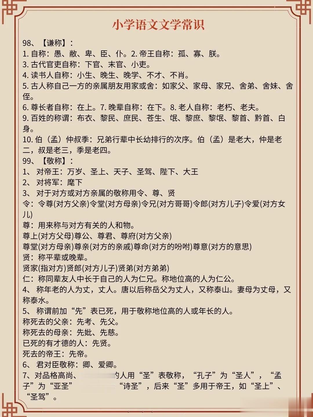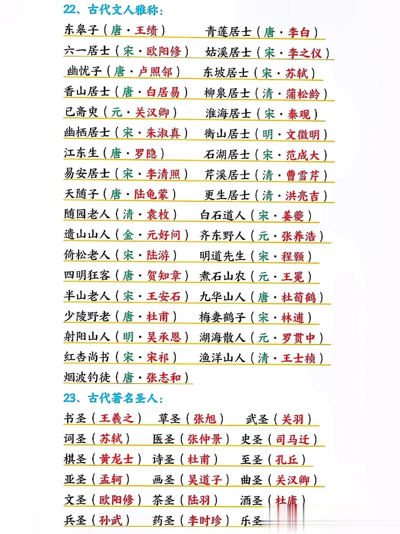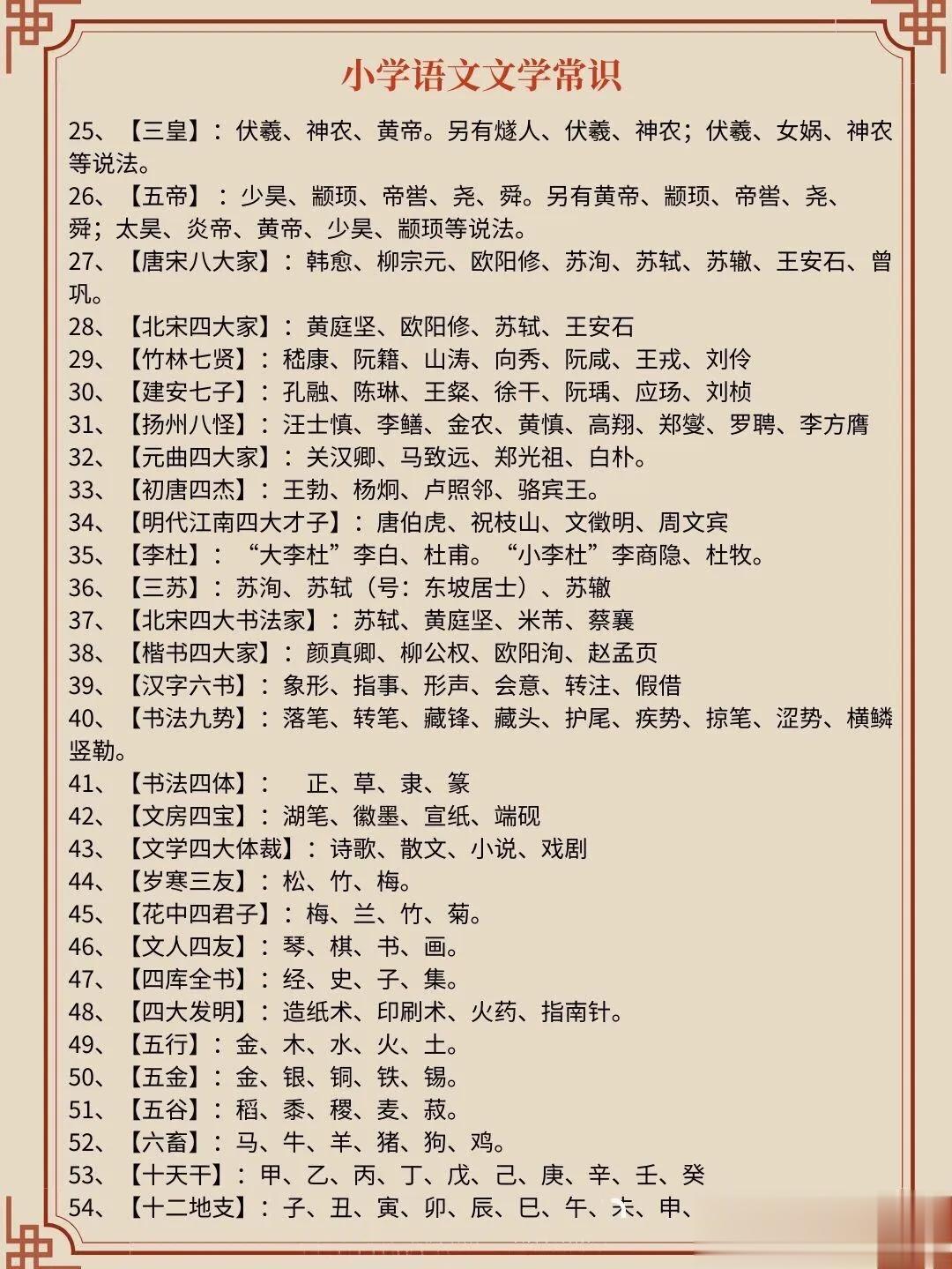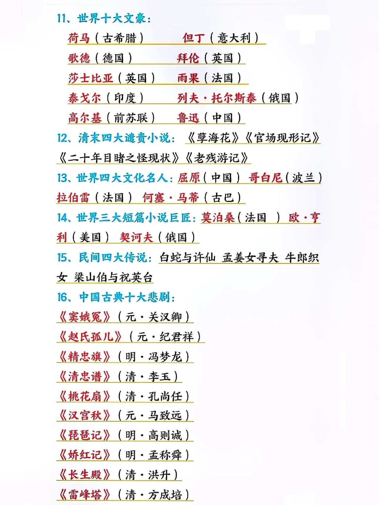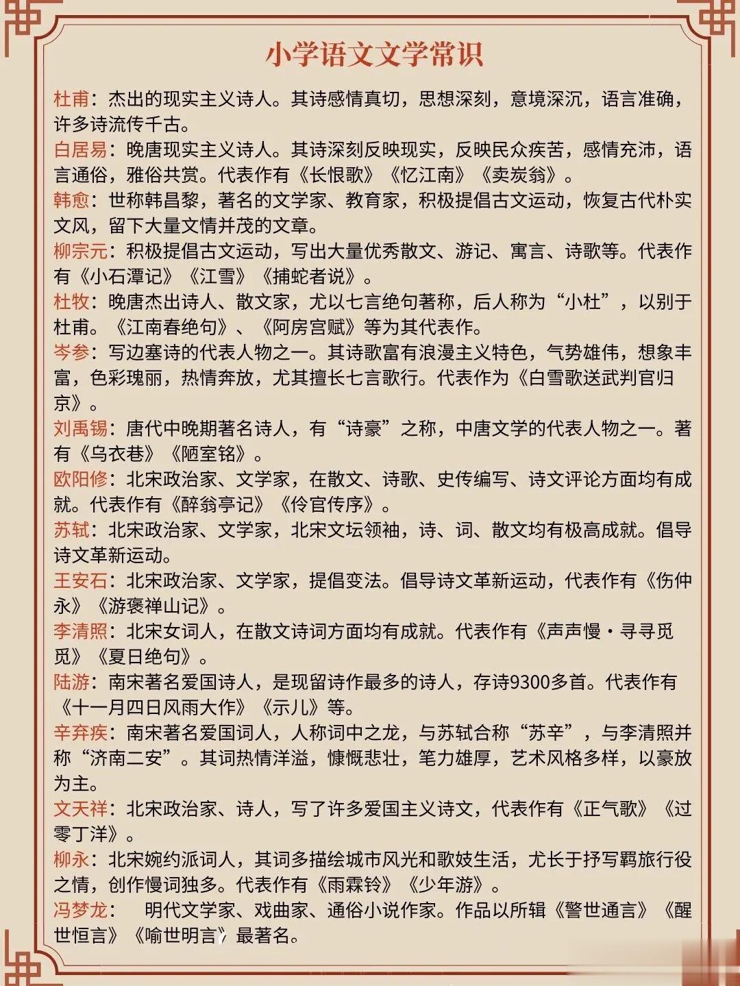 一份超全的国学文学知识大全,全都是考试常考的题目,没有比这更全面得了,小初高都能用上哦!家长们替孩子保存下来,语文是一个需要长期积累的科目,让孩子从小多多积累文学常识,不仅能帮助孩子提高语文成绩,初高中还能节省时间学习其他科目! “大语文”时代,加强了对语文文学常识的考查力度,常见的考试形式有填空题、选择题、判断题等。没事少玩手机,多记一记,那些学霸,早就倒背如流了! 小学文学常识积累大全