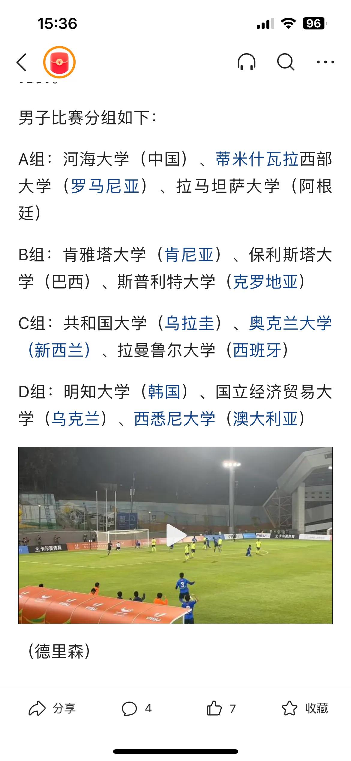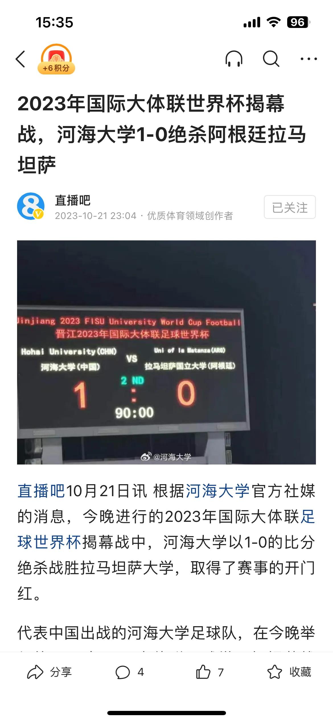 你敢相信吗?中国男足战胜了阿根廷!这是真的,不过不是男足国家队,是男足大学生队。在昨晚进行的2023年国际大体联世界杯(相当于足球版的大运会、大学生版的世界杯)中,代表中国出战的河海大学伊1比0击败来自阿根廷的拉马坦萨大学,取得开门红!这证明我们中国并不是没有踢球厉害的人,只是有一些没有从事职业足球。 国际大体联世界杯是从大运会分离出来的一项独立赛事,原来大运会是有男足的,后来国际大体联另外设立了这个国际大体联世界杯,大运会就没有男足了。所以这项赛事的含金量至少不低于大运会!恭喜中国男足大学生队!