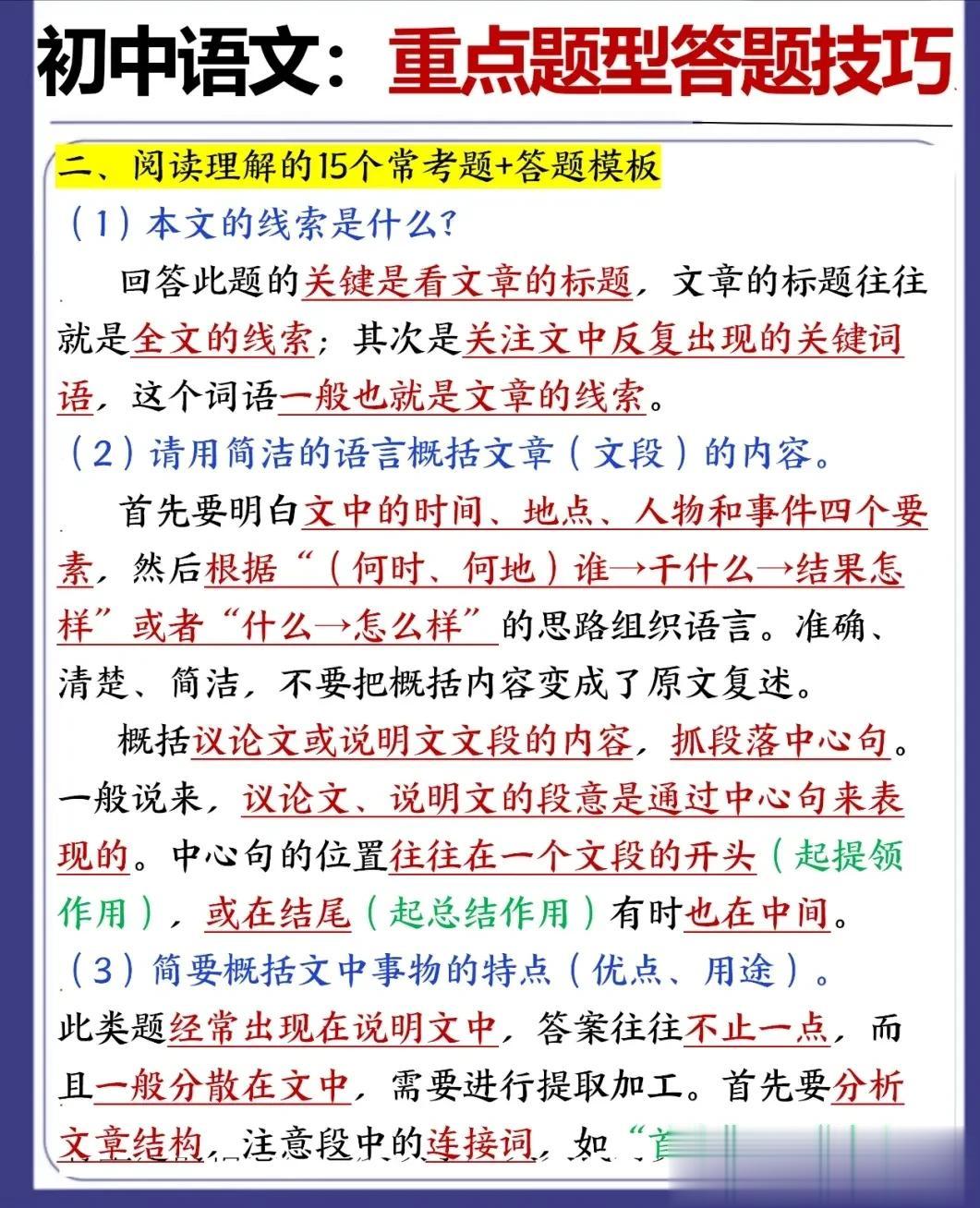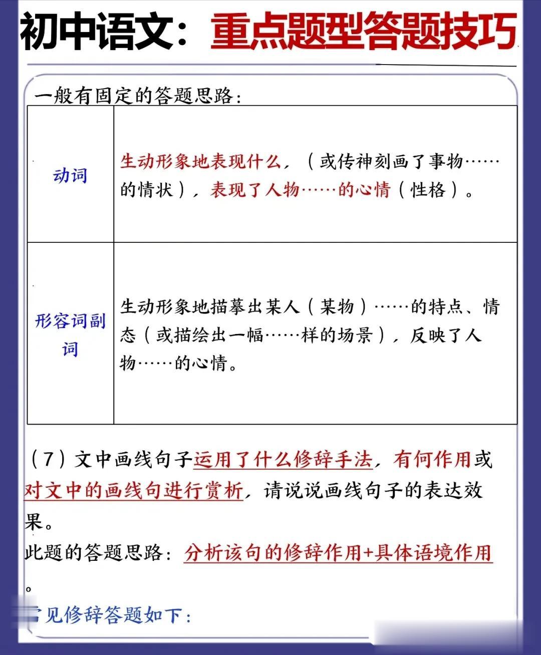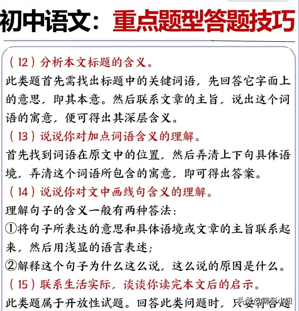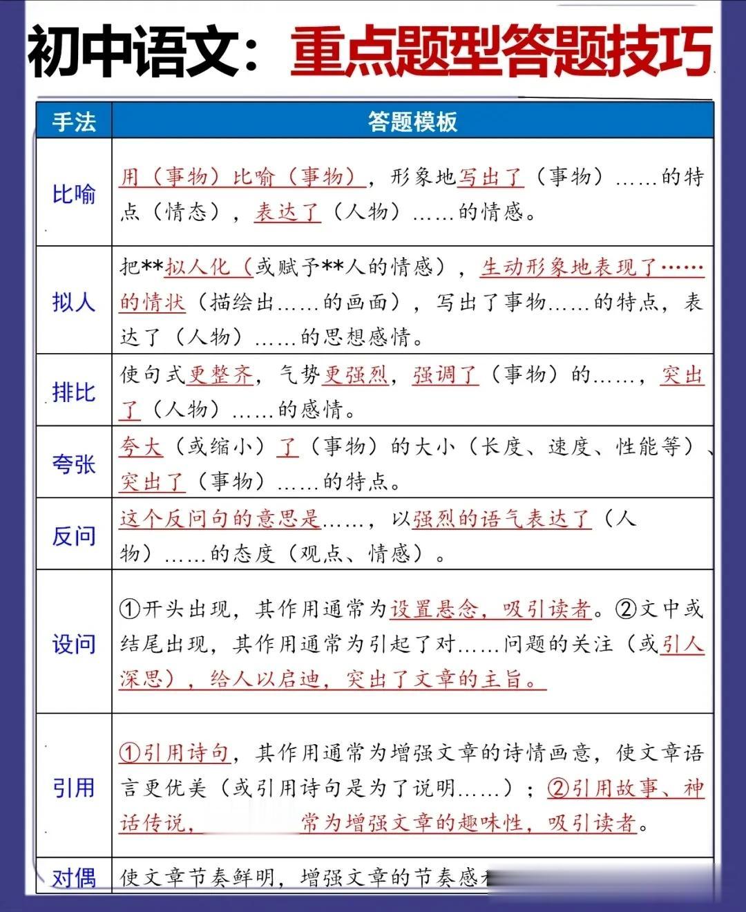 我的天呐!终于有人把初中语文重点题型答题技巧全都总结出来了!真的太全面了,让孩子把7-9年级通用模板背下来,考试再也不怕阅读理解和诗歌鉴赏啦!每天让孩子背一背学一学,考试用得到! 那些语文学霸从来不丢分,他们早就把这份答题模板倒背如流了,家里有孩子的,无论是基础差还是基础好的孩子都可以使用。只要孩子能够吃透这些做题方法,相信他们在语文成绩上一定会有所提高。 语文阅读答题技巧模板