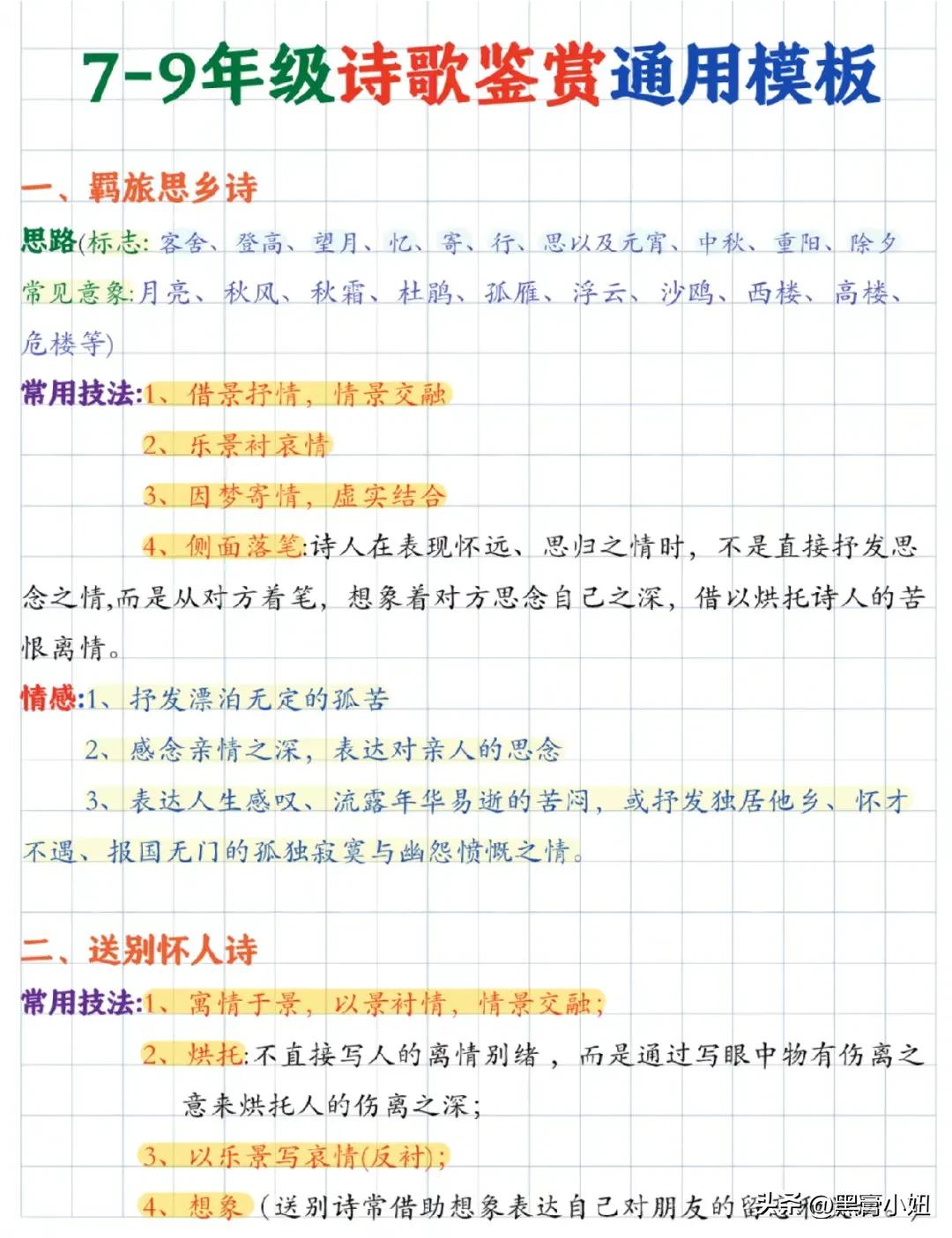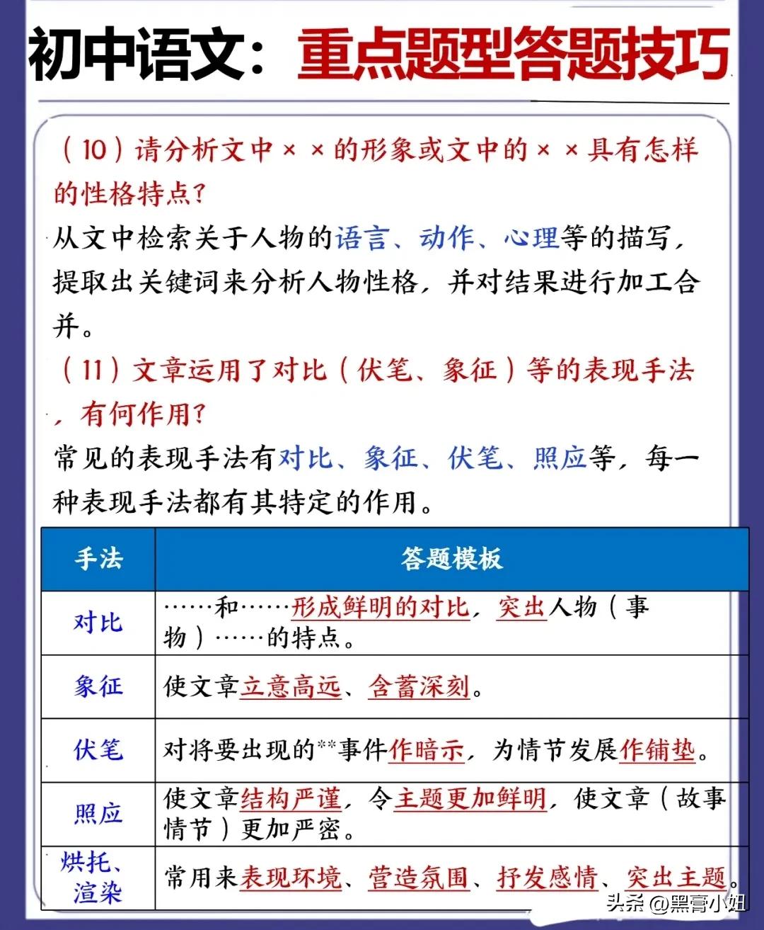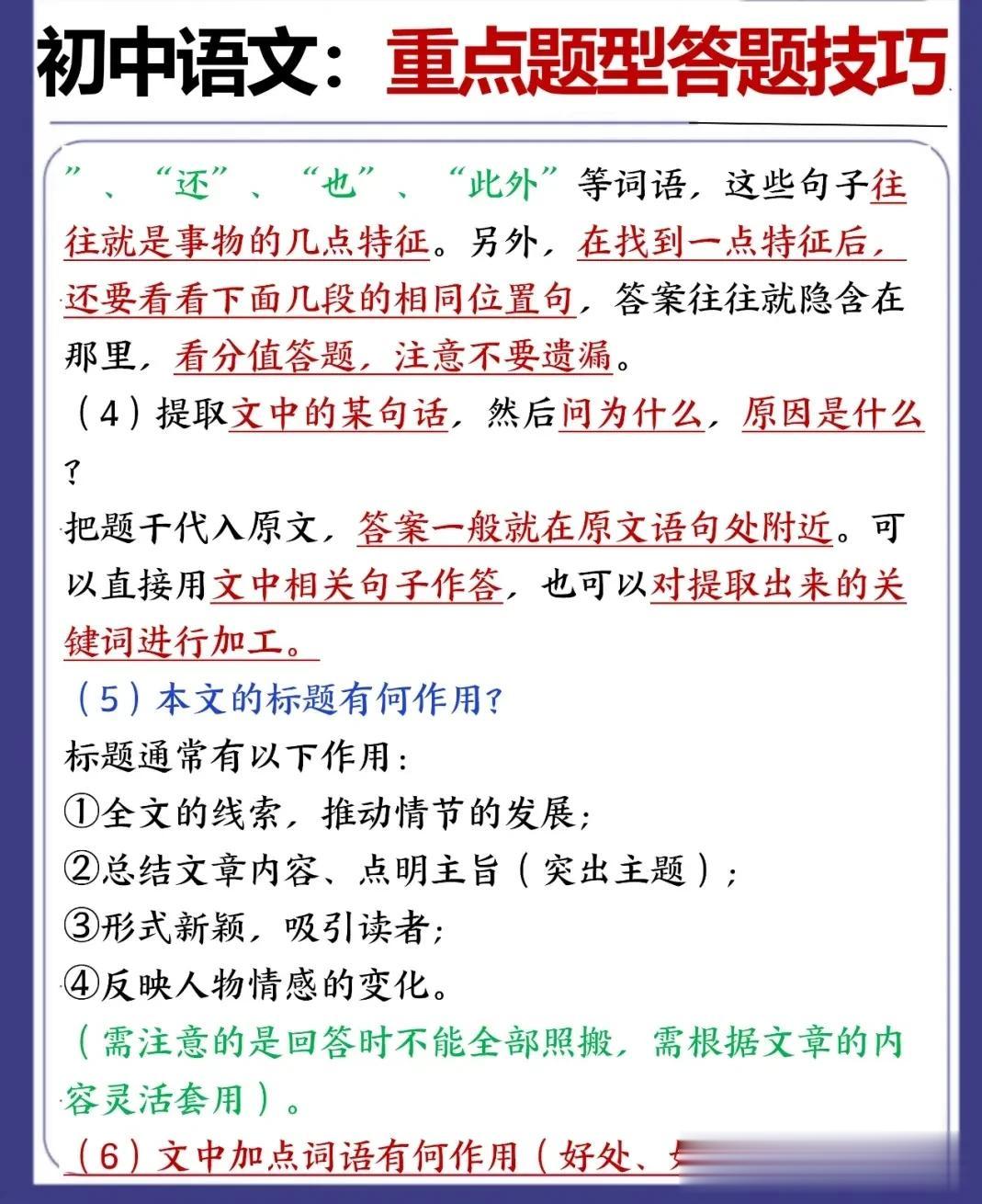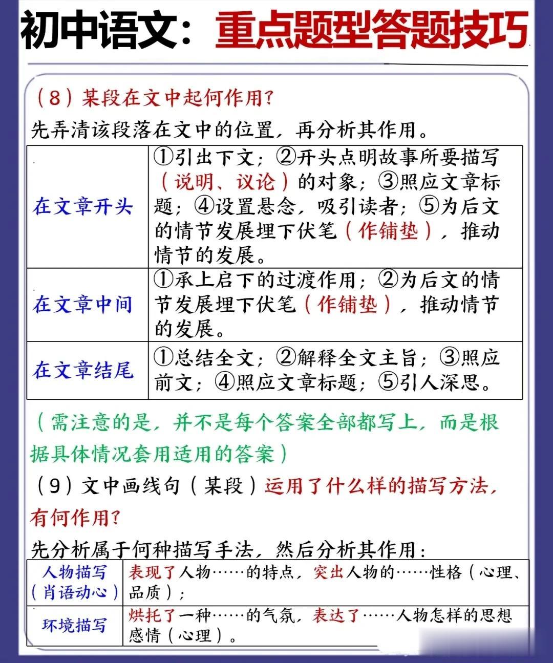 我的天呐!终于有人把初中语文重点题型答题技巧全都总结出来了!真的太全面了,让孩子把7-9年级通用模板背下来,考试再也不怕阅读理解和诗歌鉴赏啦!每天让孩子背一背学一学,考试用得到! 那些语文学霸从来不丢分,他们早就把这份答题模板倒背如流了,家里有孩子的,无论是基础差还是基础好的孩子都可以使用。只要孩子能够吃透这些做题方法,相信他们在语文成绩上一定会有所提高。 语文阅读答题技巧模板