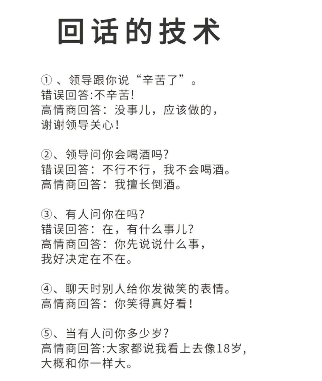 天哪,到今天才知道,会回话的人到底有多厉害!原来高情商会接话的男人,让女人离不开你,让领导欣赏你,器重你!学会回话的万能公式,让你轻松应对各种场合的对话,让你在生活中幸福美满,工作中左右逢源。赶紧来狠狠提升情商与口才!! 在日常生活和工作中,许多人都遭遇过被言语攻击、被拒绝、被问及隐私、被指使……愤怒、难堪、憋屈,但是因为不知道如何回话,只能选择忍气吞声、逃避或者是违心接受。为了解决不懂回话带来的困扰。 回话的技术沟通智慧