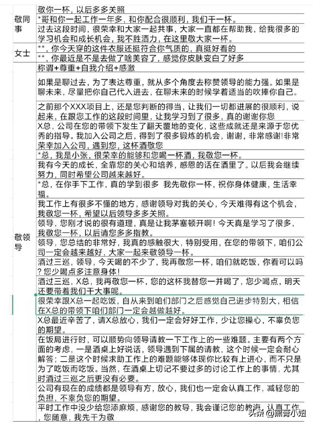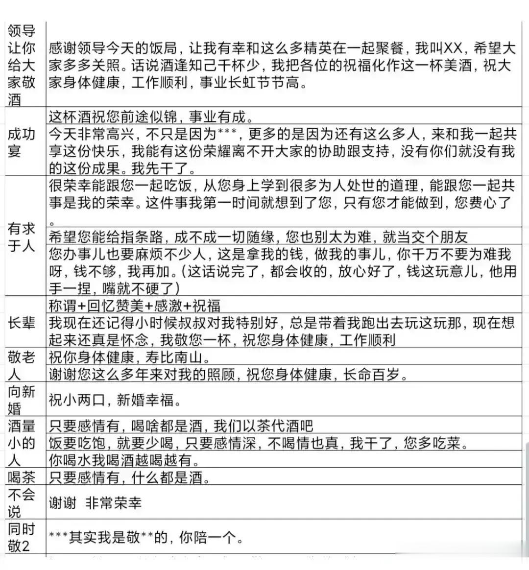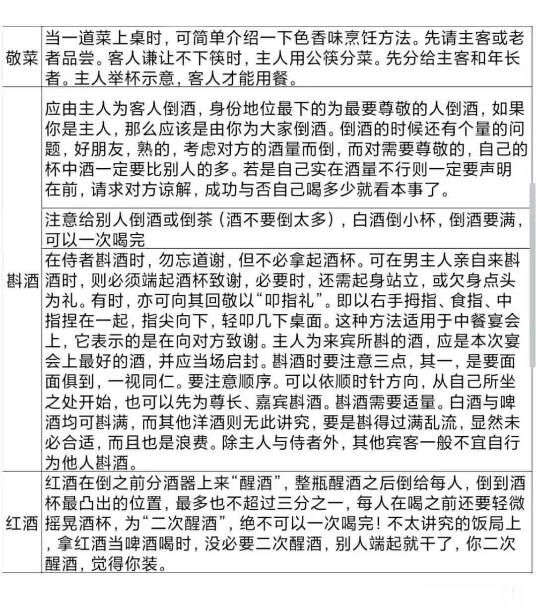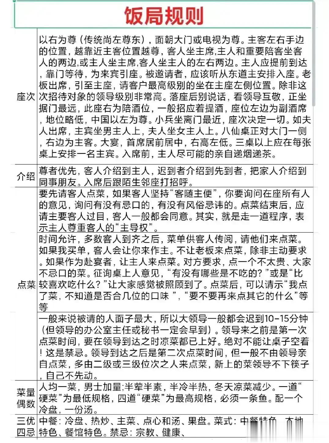 天呐!第一次见到这么完整的中国式饭局礼仪座位图和饭局规则,不管男女,学会了让你轻松应对各种饭局应酬。 那些在社会上混的好的人,早就对这些应酬的门道摸得一清二楚了!什么商宴、单位聚餐、家庭家宴、朋友聚会,公司聚会,入座、点菜、敬酒、说话、举止,都有讲究等,多了解一些中国式礼仪规矩,掌握应酬技巧,升职加薪就不远了,能助你越混越好。 中国式应酬说话办事