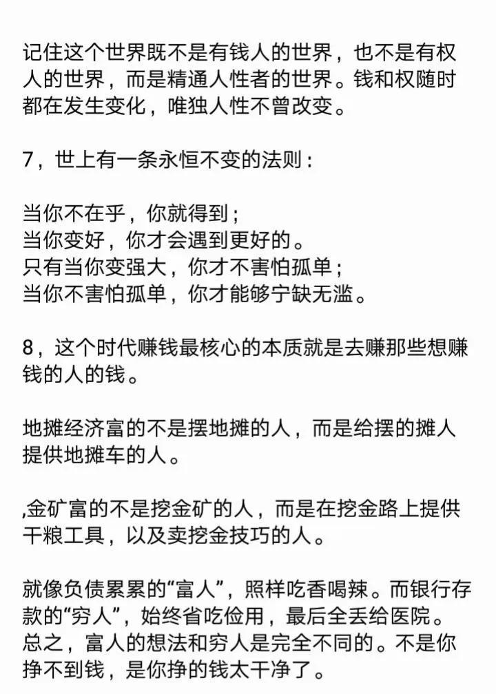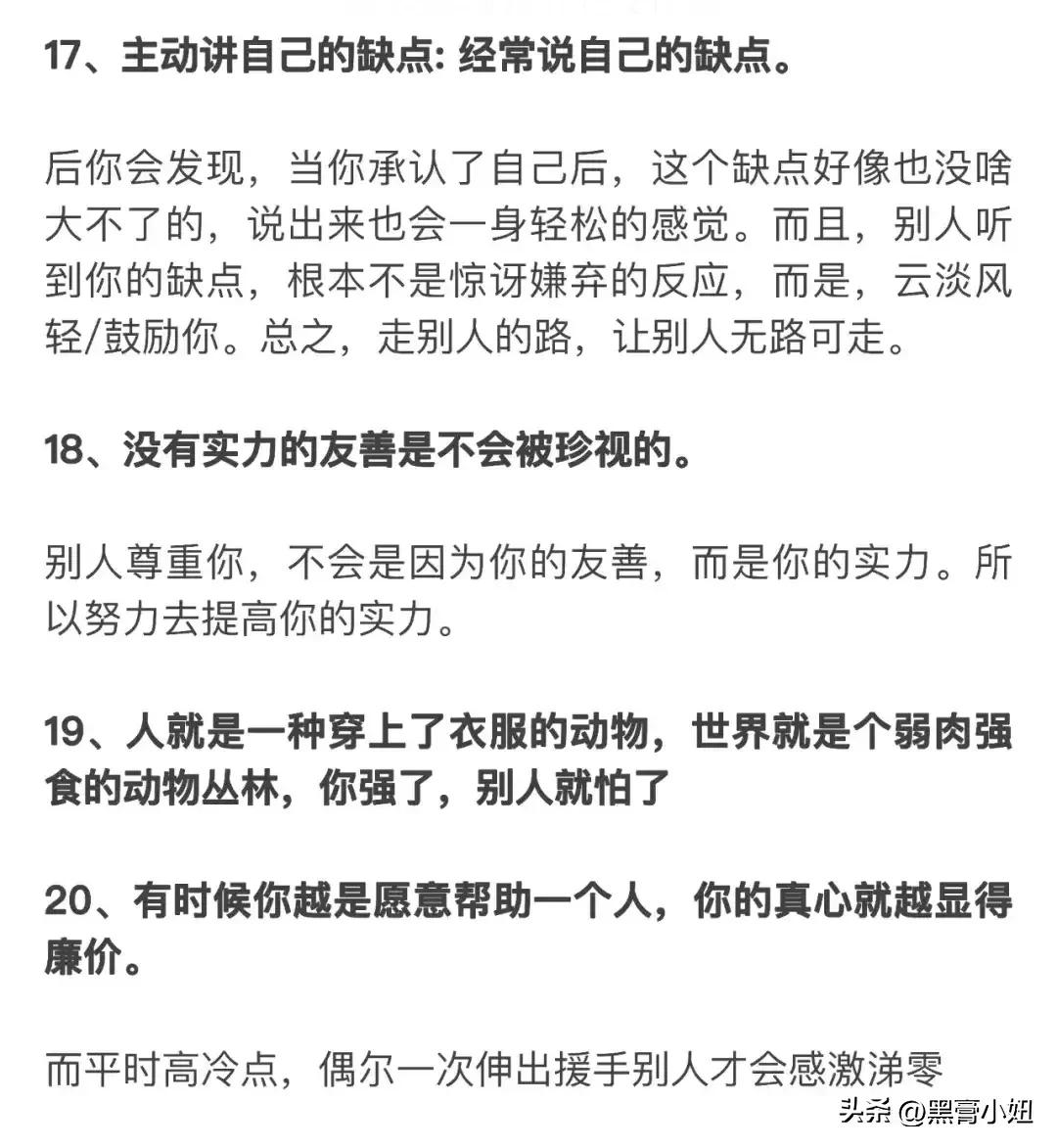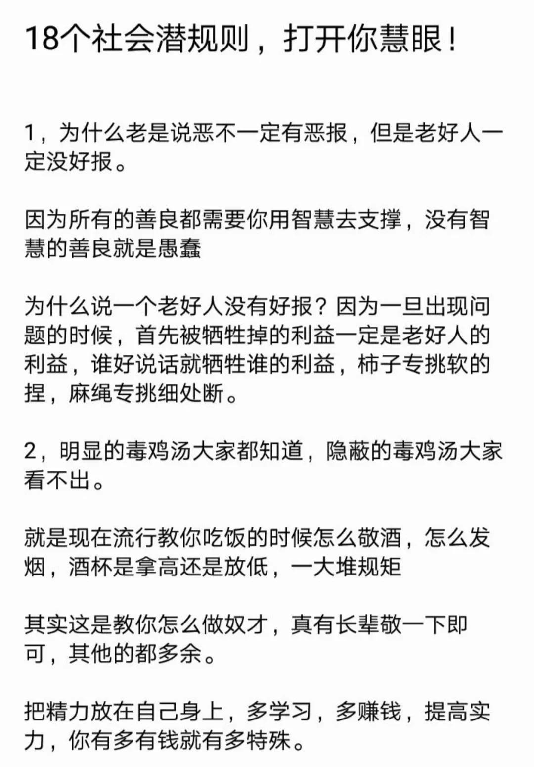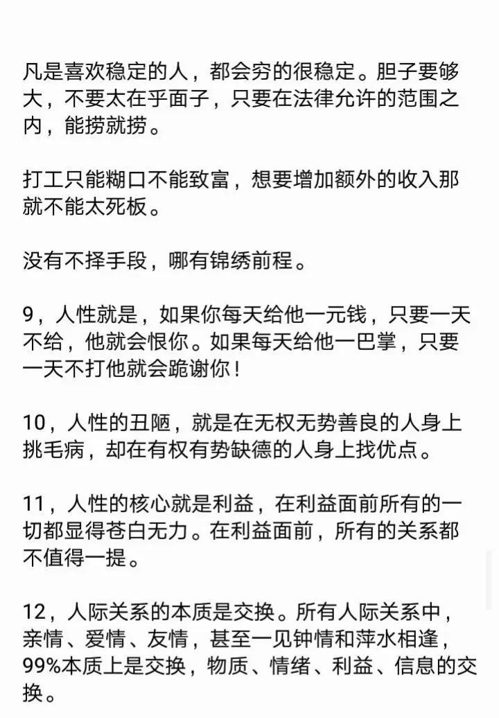 教大家一个心理博弈术,学会了再也没人敢欺负你!18个社会潜规则,打开你慧眼!23个例子告诉你,人性到底有多可怕?看完你就明白了,没有不择手段,哪有锦绣前程。 利益的最大获得者,是不守规矩和利用规矩的人! 人的本质来说是利己的,我们看到的利他,其实只是正和博弈的手段而己,手段不能归为本质,成功最大的特征就是无情的自私。 …… 这就是人性! 这就是人性句句扎心