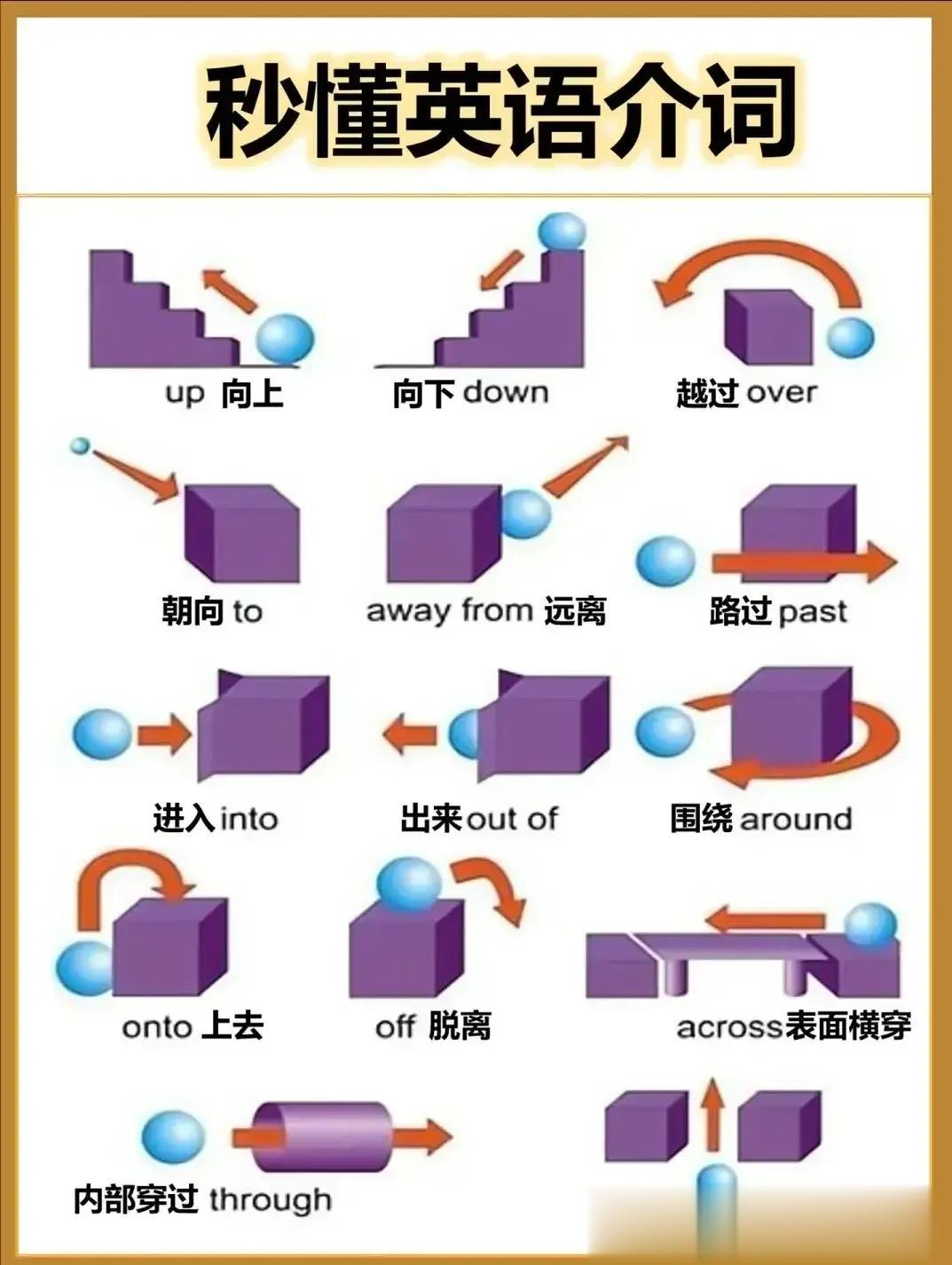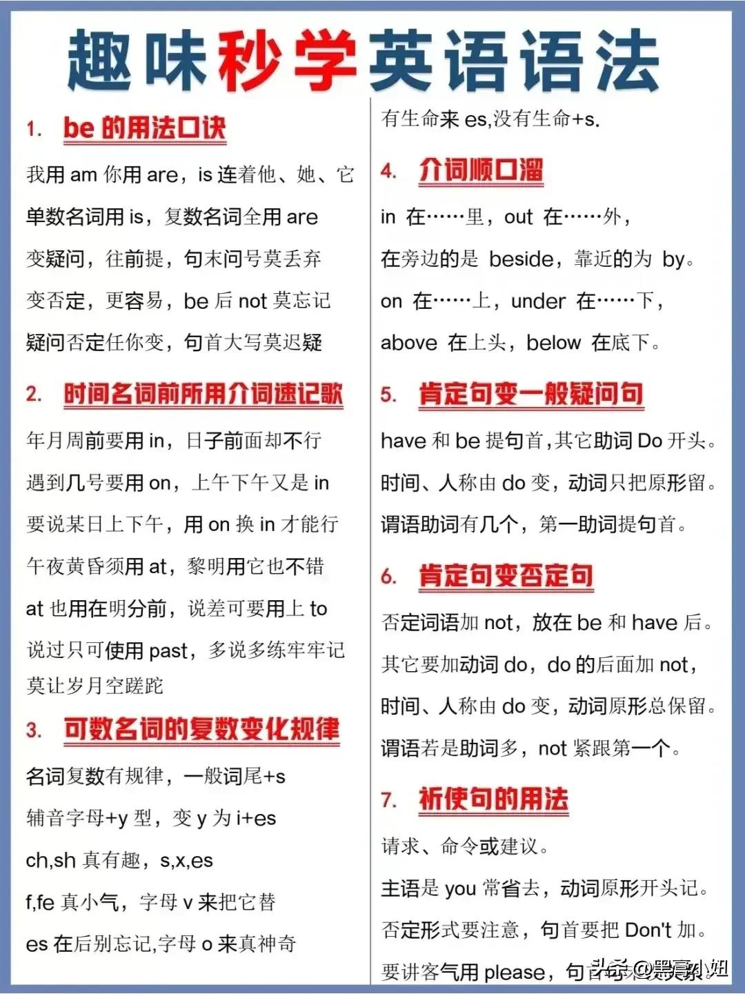 天啦!原来学英语这么简单,难怪学霸次次拿高分!原来是早就把这些英语语法顺口溜背的滚瓜烂熟,还把容易混淆的介词用图演示出来,还分类梳理的一清二楚!看完之后,真的太震惊了,连没学过英语的都看懂了!家有孩子的赶紧收藏!把这 18张图中的知识背熟,也能稳上110+! 英语语法
