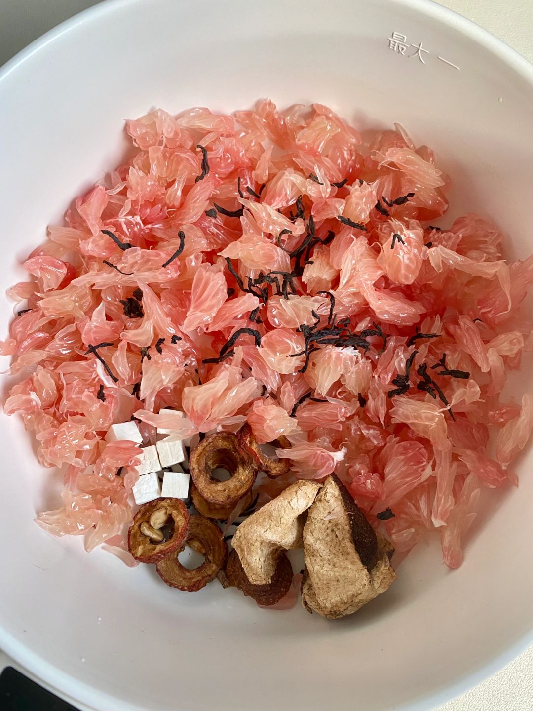 姐妹们,秋冬天一定要多喝柚子陈皮水!! 清爽又刮由解腻!一周喝2-3次,真的🈶️用!! 对小肚肚很友好!酸酸甜甜的百喝不腻! 📝:红心柚子、陈皮、茯苓、山楂、红茶 🥣:红心柚掰碎,所有食材一起放入锅中,兑水煮开15分钟即可,喝完可以复泡! 每次大餐后喝上一杯真的很舒服😌 一杯热热的下肚,暖呼呼的还很好喝!