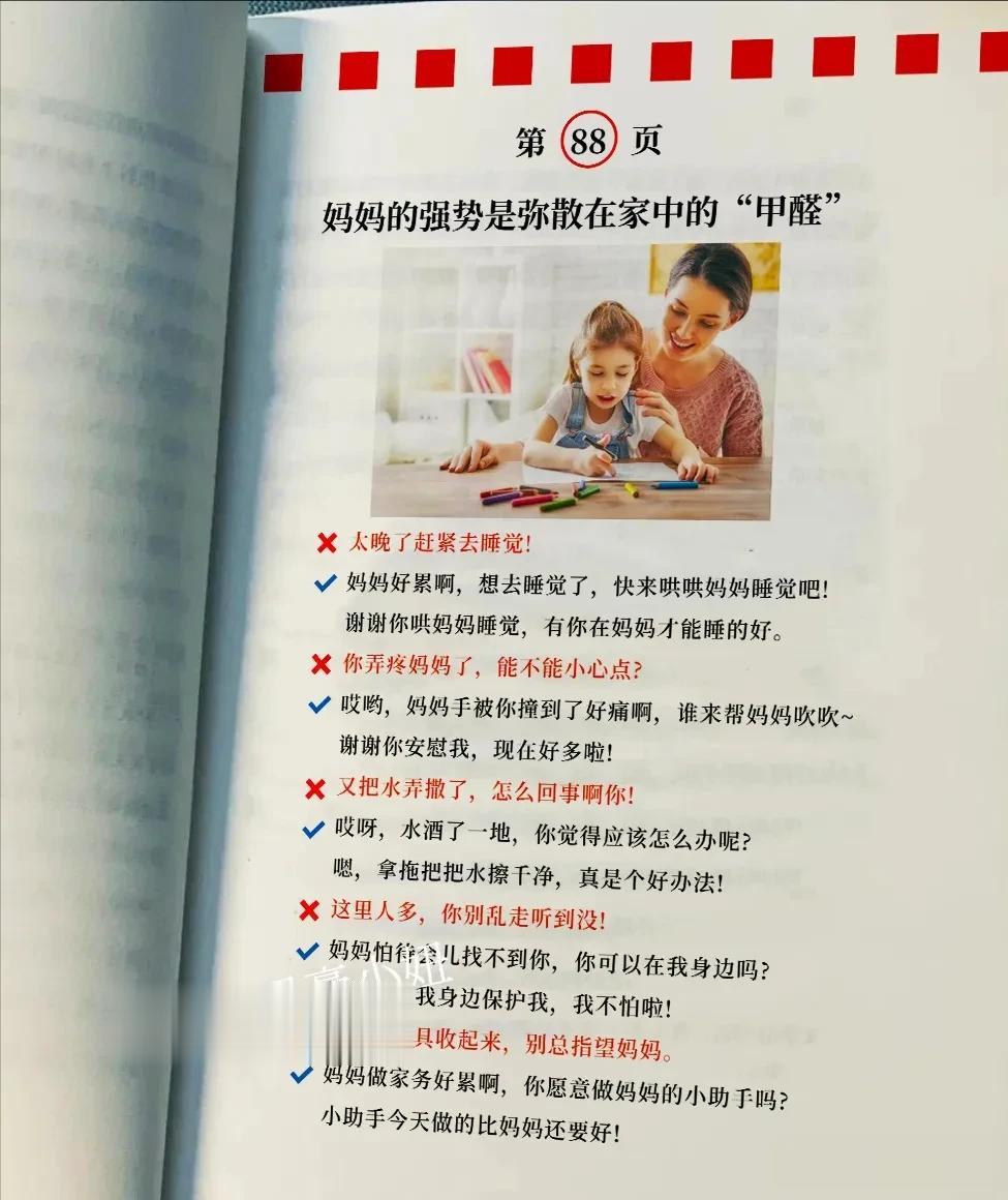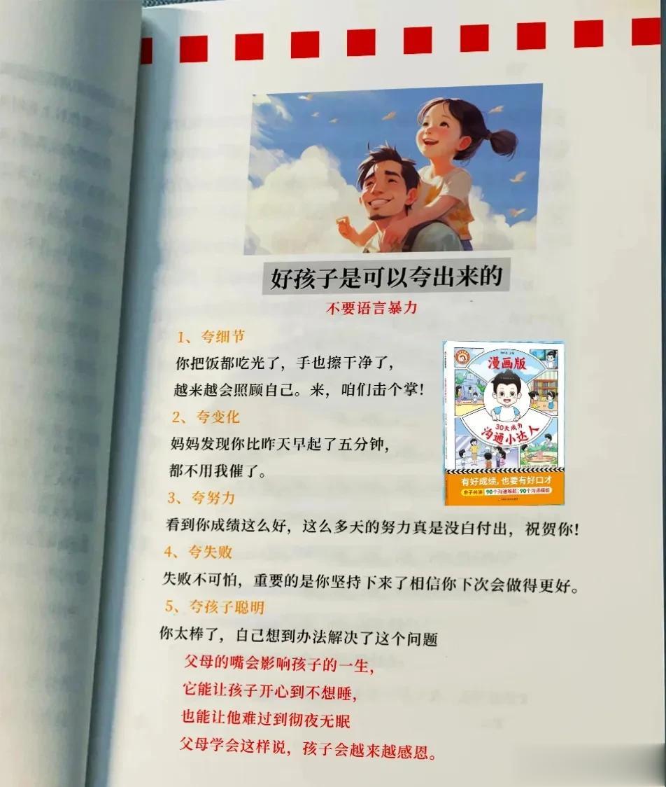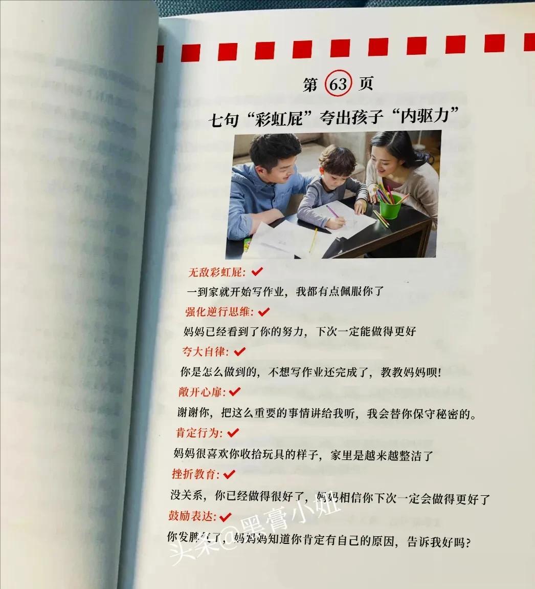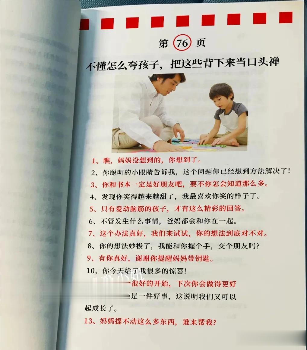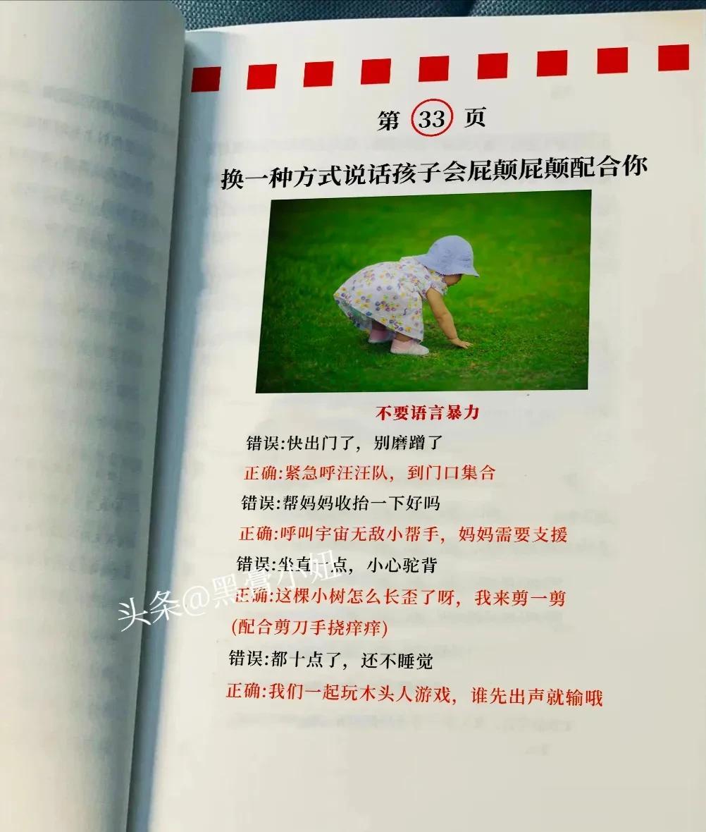 一位985学霸妈妈直言:换种方式说话,孩子会屁颠屁颠配合你!这就是亲子关系语言的力量,好孩子都是夸出来的,夸出孩子“内驱力”,夸出“优良作风”,夸出“好习惯”,夸出……不懂怎么夸孩子,把这些背下来当口头禅! 不要语言暴力! 比如帮妈妈收拾一下好吗? 改为:呼叫宇宙无敌小帮手,妈妈需要支援! 快出门了,别磨蹭了! 改为:紧急呼叫汪汪队到门口集合. 坐直一点,小心驼背 改为:这颗小树怎么长走了,我来剪一剪 (配合剪刀手挠痒痒~) 撒谎时:嘴里没有一句实话!长大还了得? 改为:你害怕被指责,害怕我不爱你,所以没说真话,我相信你不是故意的。 你怎么这么颦,我是为了你好 改为:你可以说不,但我想听听原因 就知道哭,哭有什么用 改为:等你不哭了,我们再来解决问题 这么简单,你怎么总做不好 改为:我看到你已经非常努力了 你能不能小心点 改为:我相信你不是意的 …… 父母的嘴会影响孩子的一生,让孩子成为一位会沟通、有教养的优秀孩子,推荐下方这本书来养成!常见难题全覆盖,解决方案助修炼!孩子看了之后更听话了,大人看了之后,知道怎么培养孩子了。 学霸妈妈的修炼