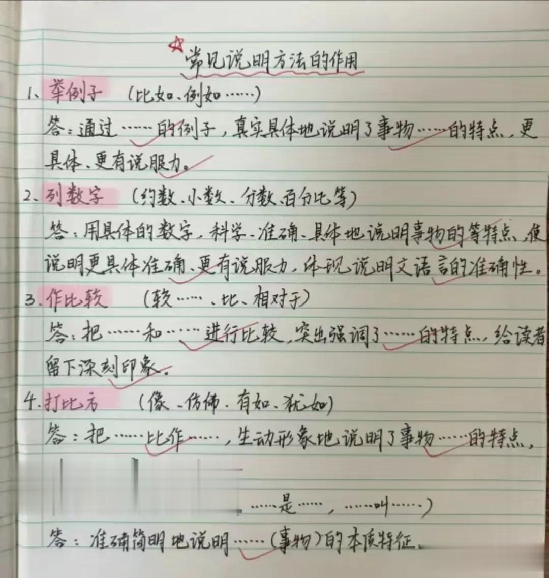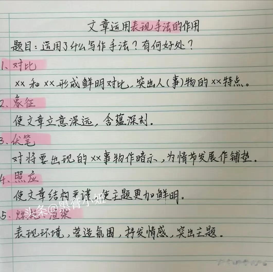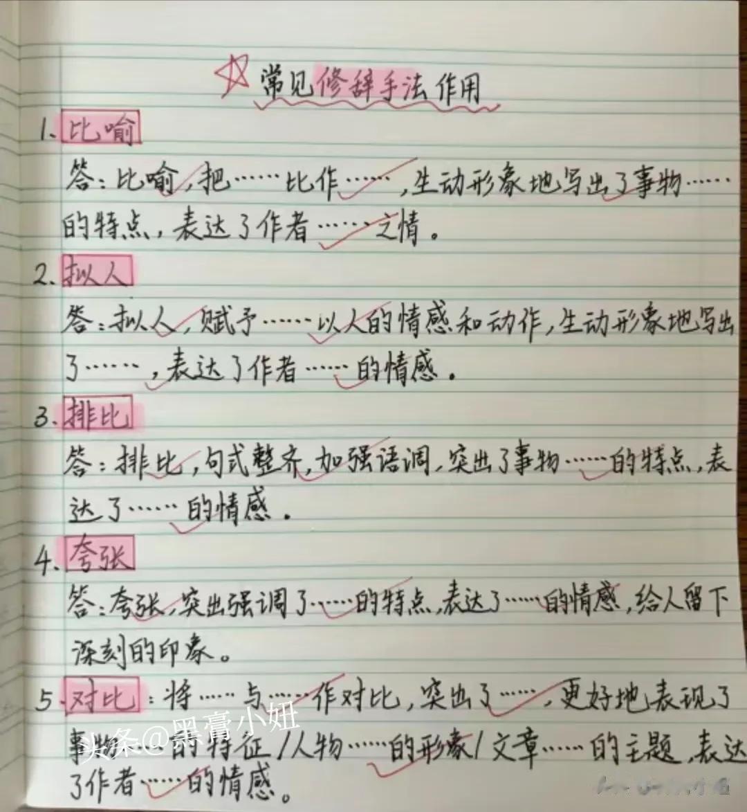 我滴天呐!“简直太卷了”!一位从教20年的资深语文老师,竟然将语文重要的知识点和答题技巧全都要求孩子们摘抄背下来!看完之后,太震惊了!全都是每次考试要考的,比如常见说明方法的作用、标题的作用、修辞手法的作用、破折号的作用、省略号的作用、文章运用表现手法的作用、段落的作用等等,答题步骤清晰规范!教会方法,授之以渔!孩子才会成绩稳步提升!家有孩子的赶紧收藏保存下来!小初高语文都能用上! 小学基础知识答题技巧