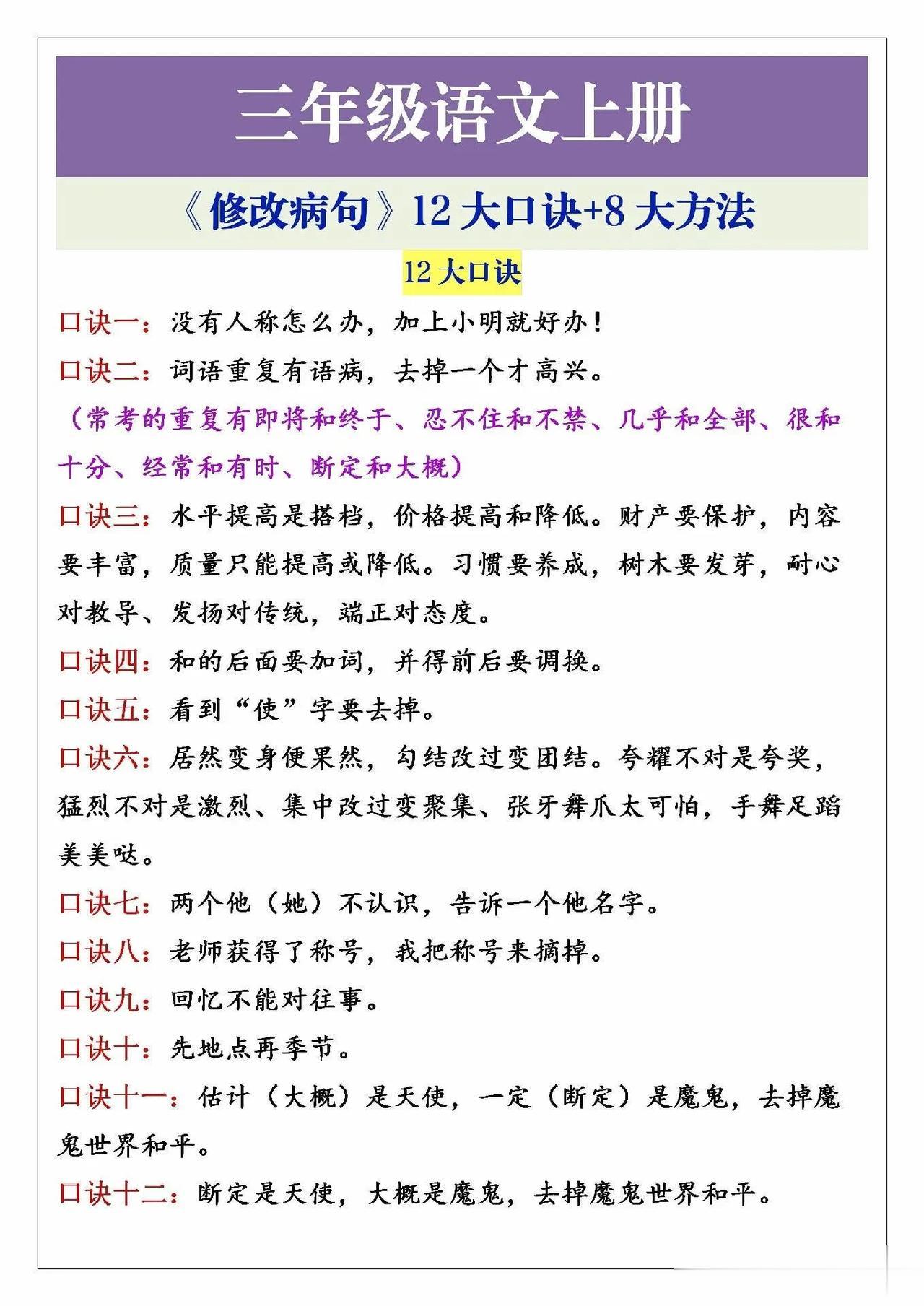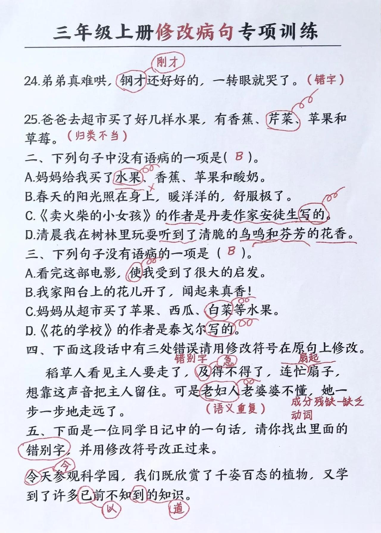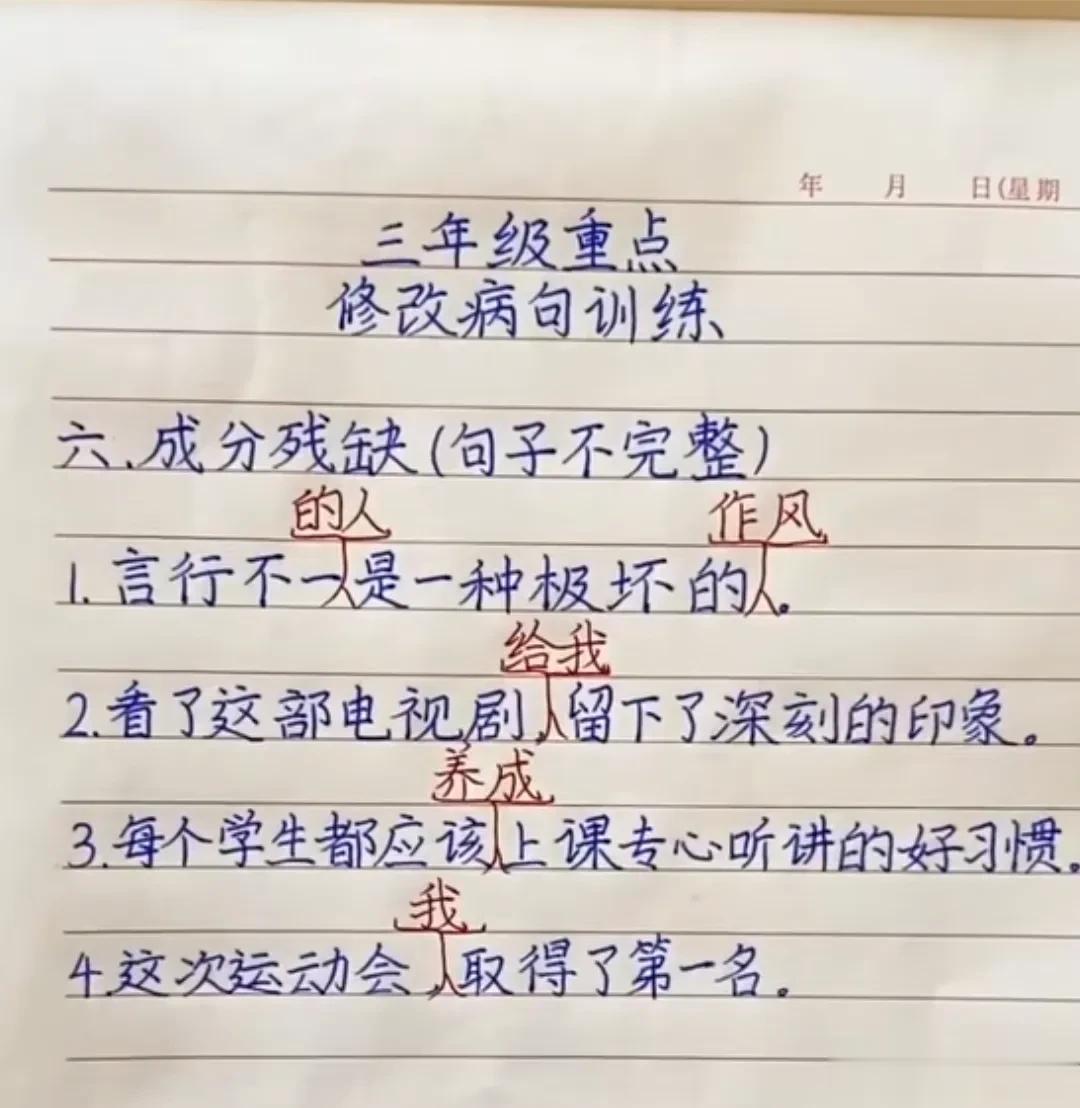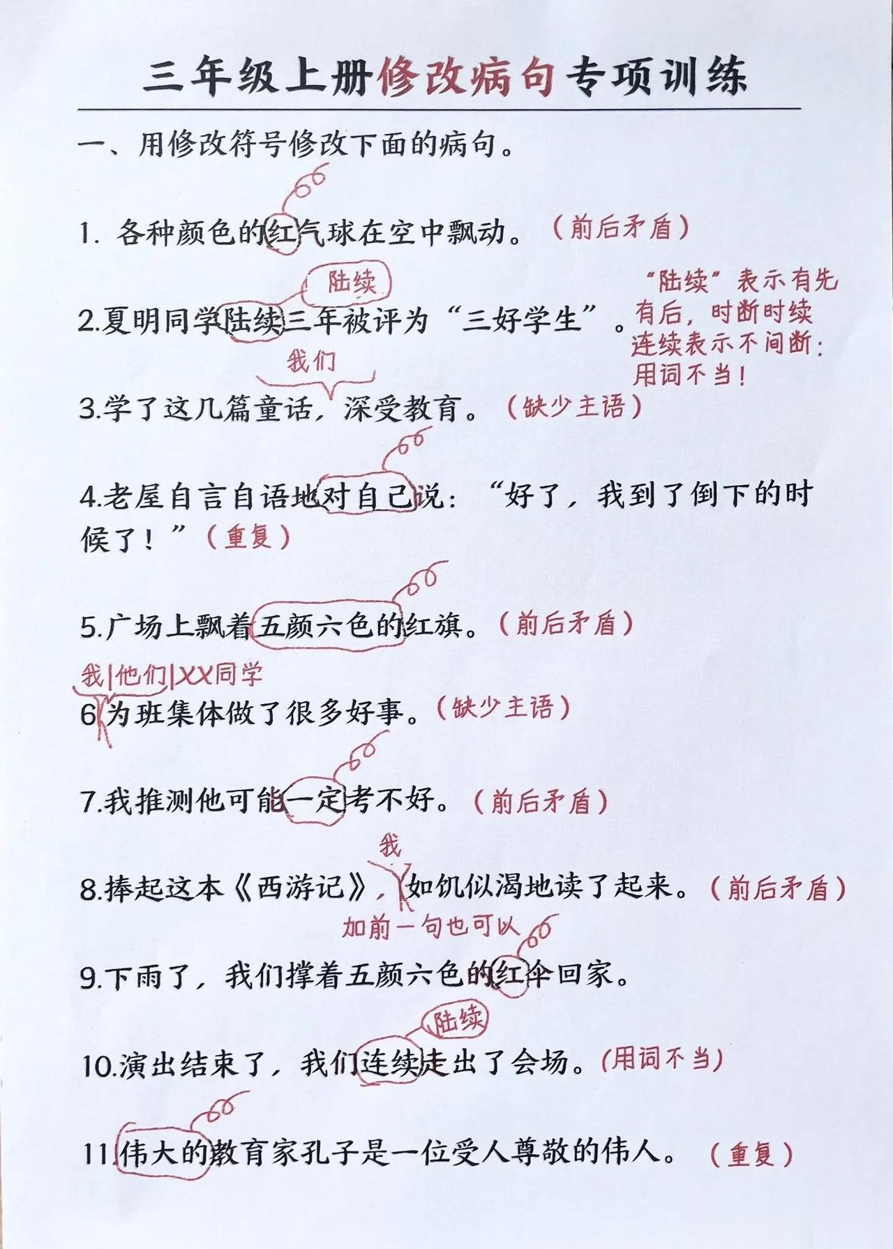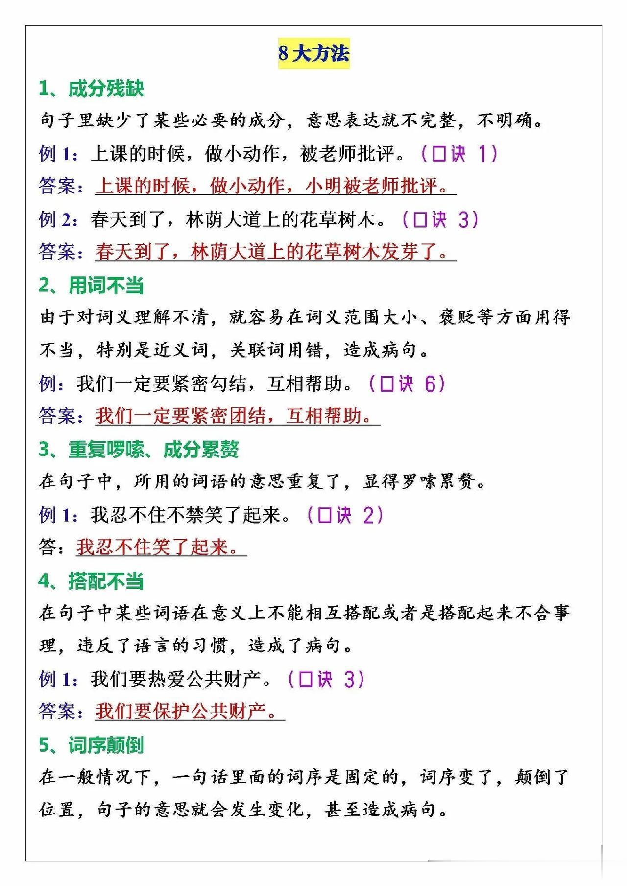 “太卷了”!三年级孩子竟然将常见的八种修改病句的方法和例题全都手写整理出来,这是我见过最全最完整的笔记,有方法有口诀有例题,家有孩子的保存,考试拿高分! 句式训练大全同步习作