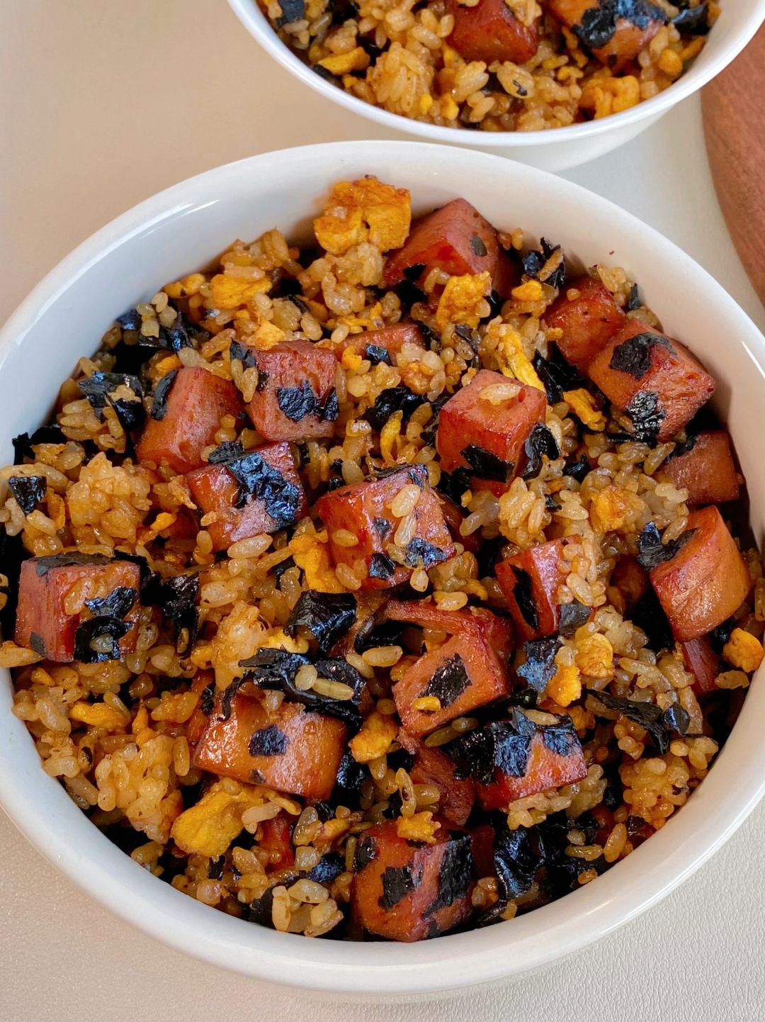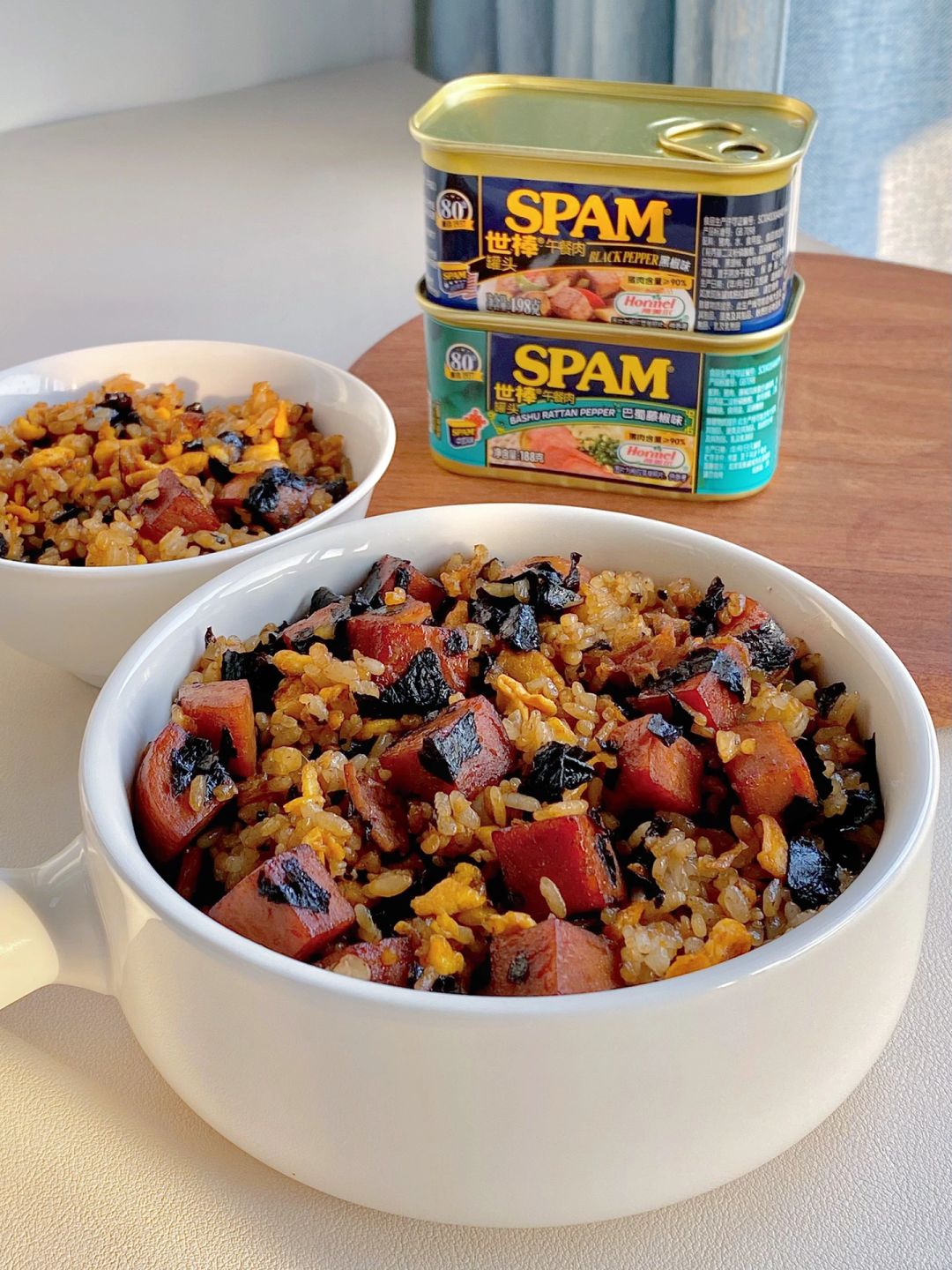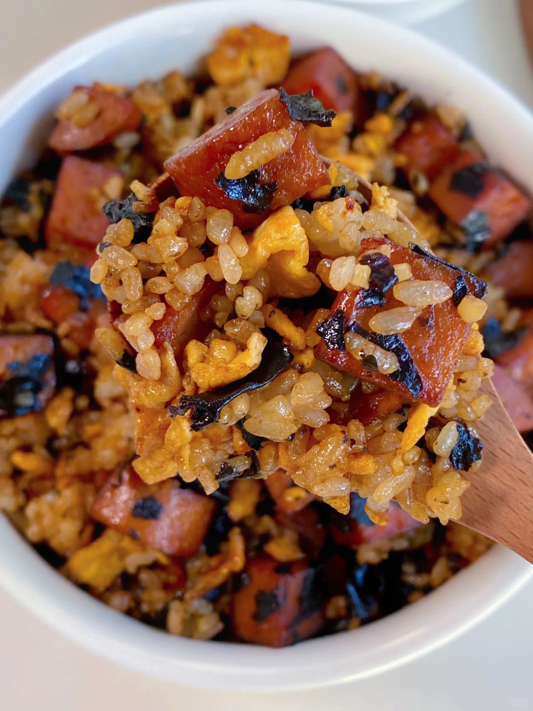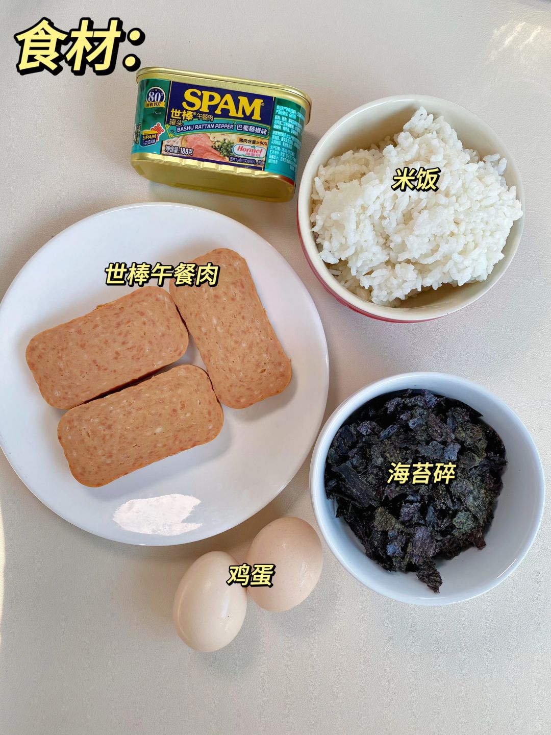🥣食材:鸡蛋、午餐肉、海苔碎、剩米饭