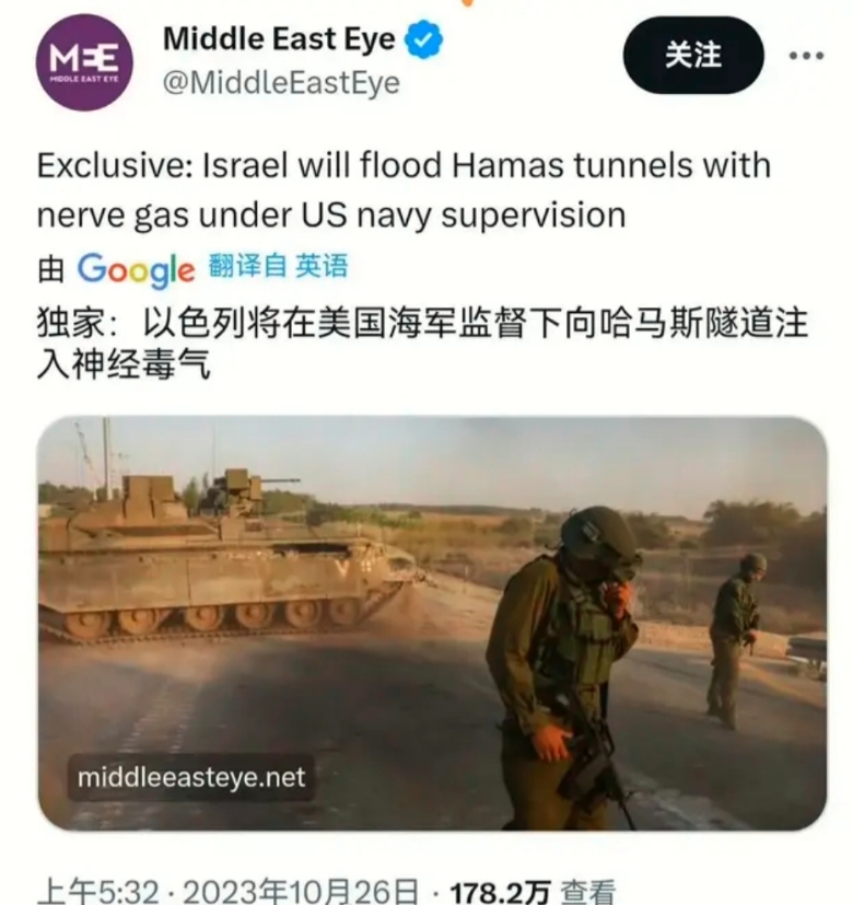 好家伙,中东之眼官方账号独家披露,以色列将在美国海军的指导下向哈马斯隧道注入神经毒气。