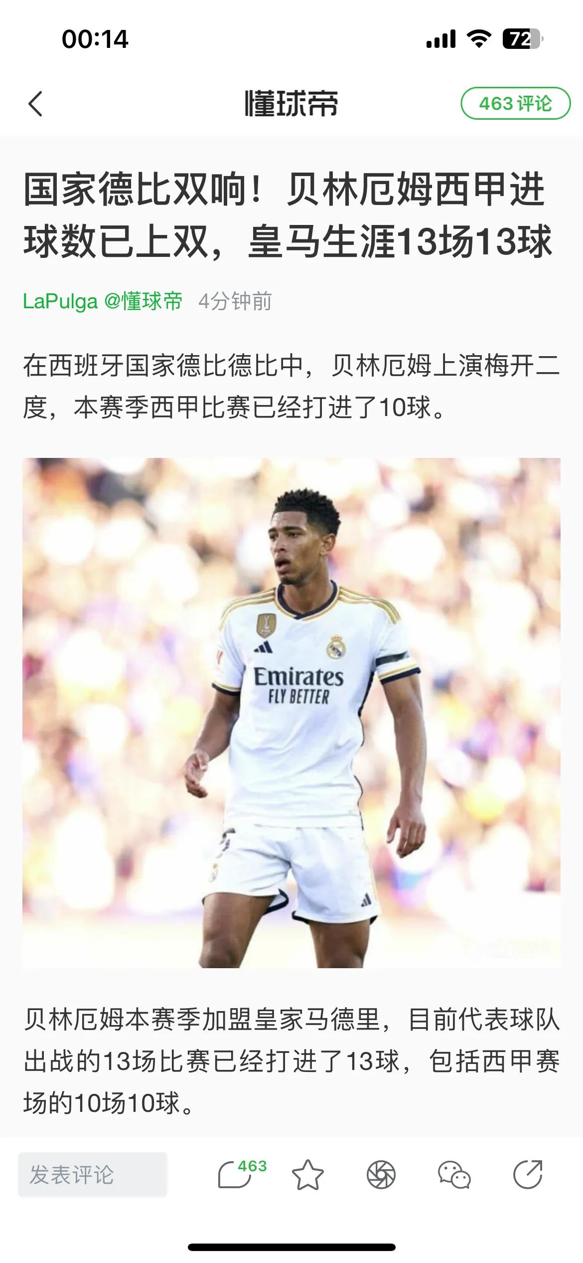 皇马新国王登基!贝林厄姆太强了,强到爆炸啊!在西班牙国家德比中梅开二度+绝杀的完美表现,宣告贝林厄姆正式成为未来金球奖大热人选!加盟皇马之后13场13球,皇马几乎成为贝林厄姆一个人的球队!梅罗老去之后,以后足坛并不是哈兰德大战姆巴佩的双雄争霸,贝林厄姆将会和他们开展三国大战!就本赛季的表现来说,贝林厄姆甚至要明显超过他们!