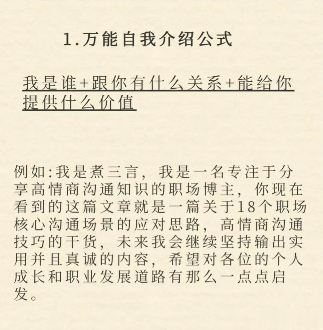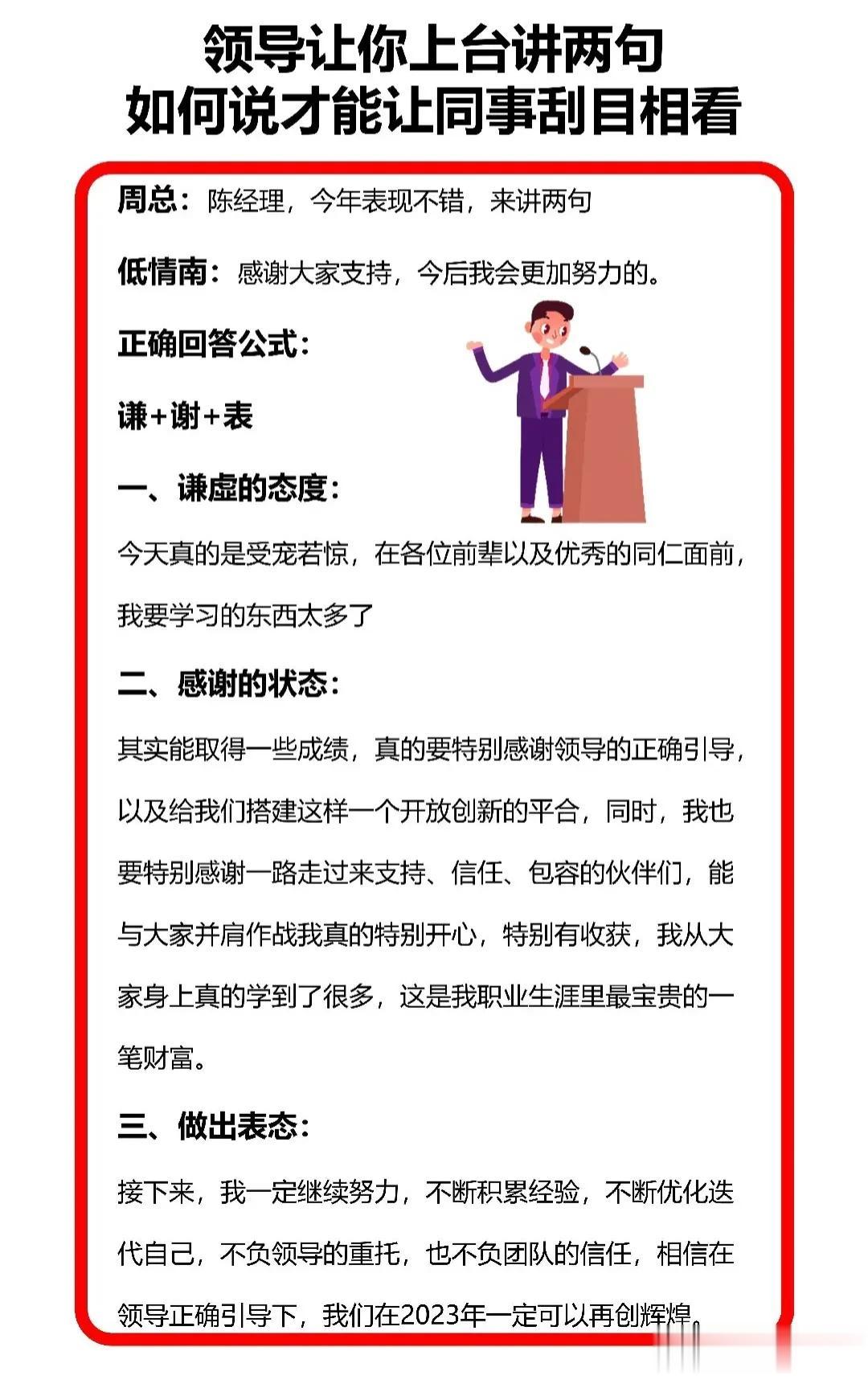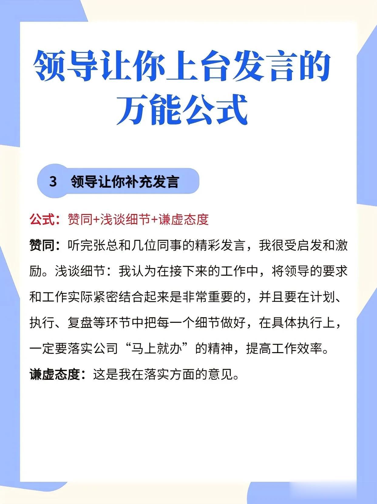 天呐!第一次见到这么全的即兴发言和说话沟通公式,一开口就赢了,简直是秒杀同龄人!什么自我介绍公式、倾听公式、万能附和公式、反套路公式、夸人公式、沟通公式、转移话题公式、被领导表扬发言公式、年会发言公式等等,简直是方方面面的全整理在这了,想提高说话技巧和发言能力的,看这篇就够了! 无论生活还是工作中,表达能力都是非常重要的技能,你看看身边的大领导,有哪位不是发言高手。赶紧系统的学起来! 脱稿演讲与即兴发言