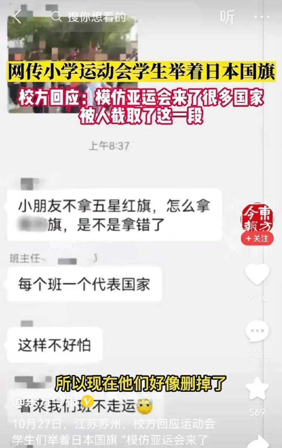 首先校长开除,班主任及相关人员统统开除! 江苏苏州一小学学生开运动会举着日本国旗,学校就是这样教育学生的吗?勿忘国耻牢记使命就是这样牢记的吗? 学校的回应是学生们在模仿亚运会来了很多国家一个班代表一个国家被人截取了这一段。 江苏的教育管理部门一定要出来做个解释对这学校相关人员做出严肃的处理。 学生们戴着红领巾举着药膏旗这对得起牺牲的先烈们吗?