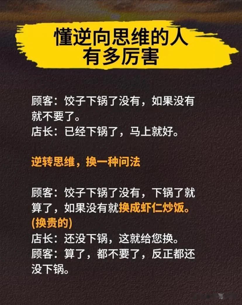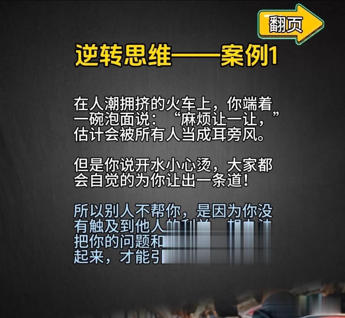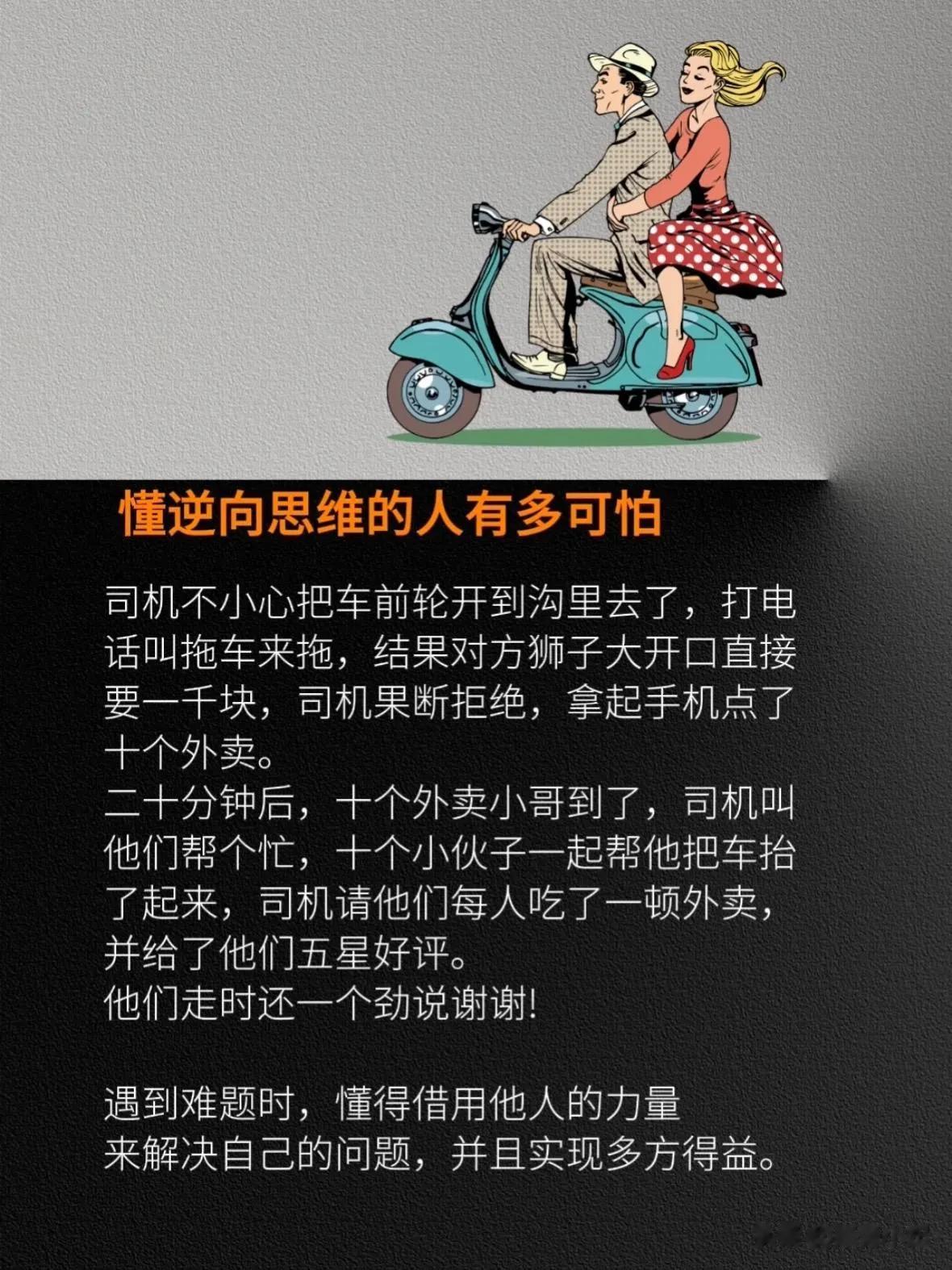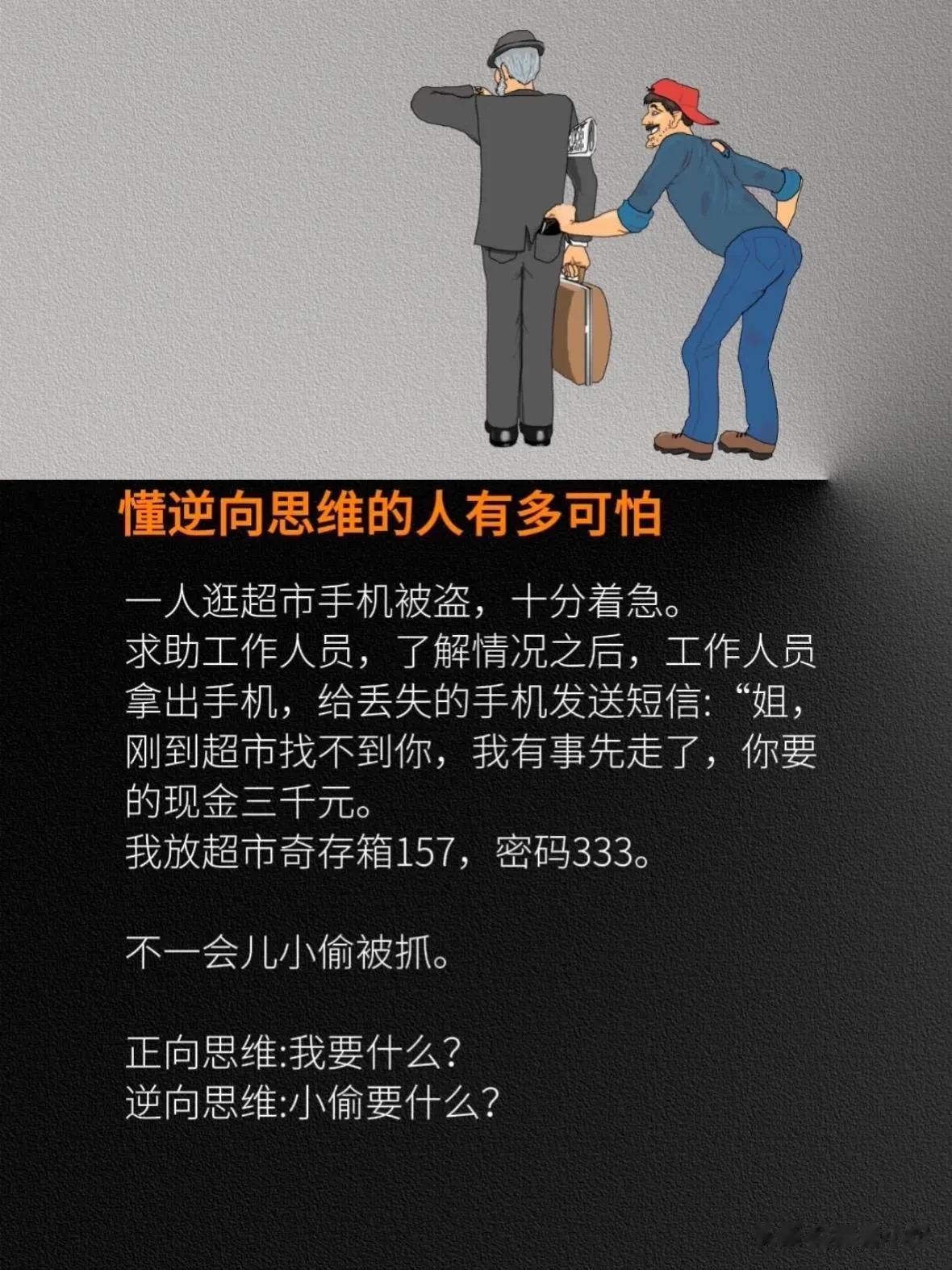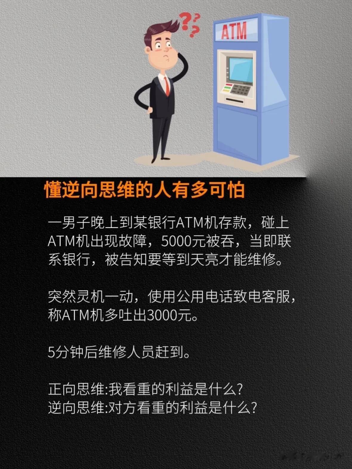 “太牛了!”这真的是我见过最牛的逆向思维神操作,看完这12个小故事,简直惊掉你下巴,原来逆转思维能力越强,成功的概率就越高,能出其不意的解决各种问题! 比如第一个故事,一男子晚上到某银行ATM机存款,碰上ATM机出现故障,5000元被吞,用一招就让工作人员5分钟赶到。 正向思维:我看重的利益是什么? 逆向思维:对方看重的利益是什么? 轻而易举就把问题解决了 …… 没事多看一看这些逆向思维的小故事,多学一学用逆转思维去思考与解决问题,尤其是当正向思维行不通时,要善用逆向思维,你会发现不知不觉就轻松解决了很多的难题与困惑。 逆转思维成功思维训练