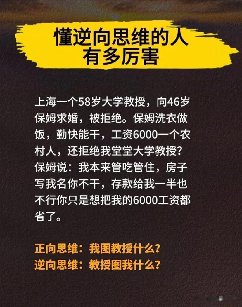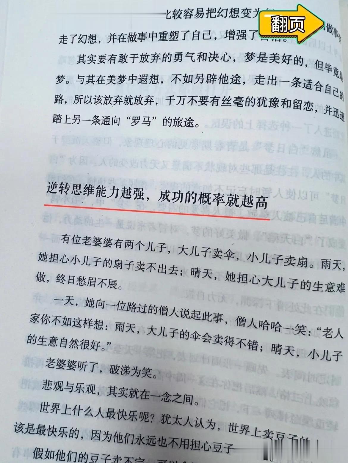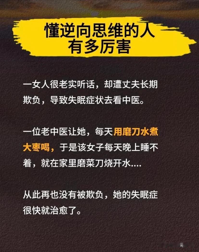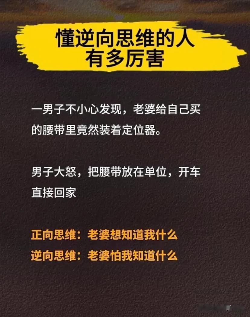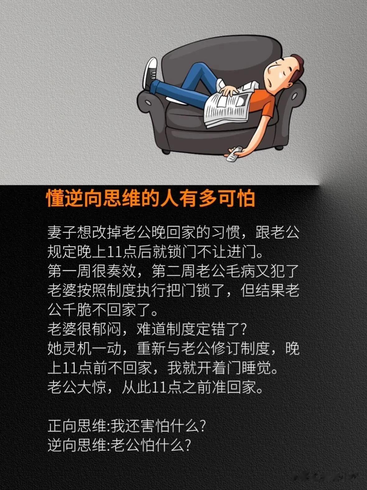 “太牛了!”这真的是我见过最牛的逆向思维神操作,看完这12个小故事,简直惊掉你下巴,原来逆转思维能力越强,成功的概率就越高,能出其不意的解决各种问题! 比如第一个故事,一男子晚上到某银行ATM机存款,碰上ATM机出现故障,5000元被吞,用一招就让工作人员5分钟赶到。 正向思维:我看重的利益是什么? 逆向思维:对方看重的利益是什么? 轻而易举就把问题解决了 …… 没事多看一看这些逆向思维的小故事,多学一学用逆转思维去思考与解决问题,尤其是当正向思维行不通时,要善用逆向思维,你会发现不知不觉就轻松解决了很多的难题与困惑。 逆转思维成功思维训练