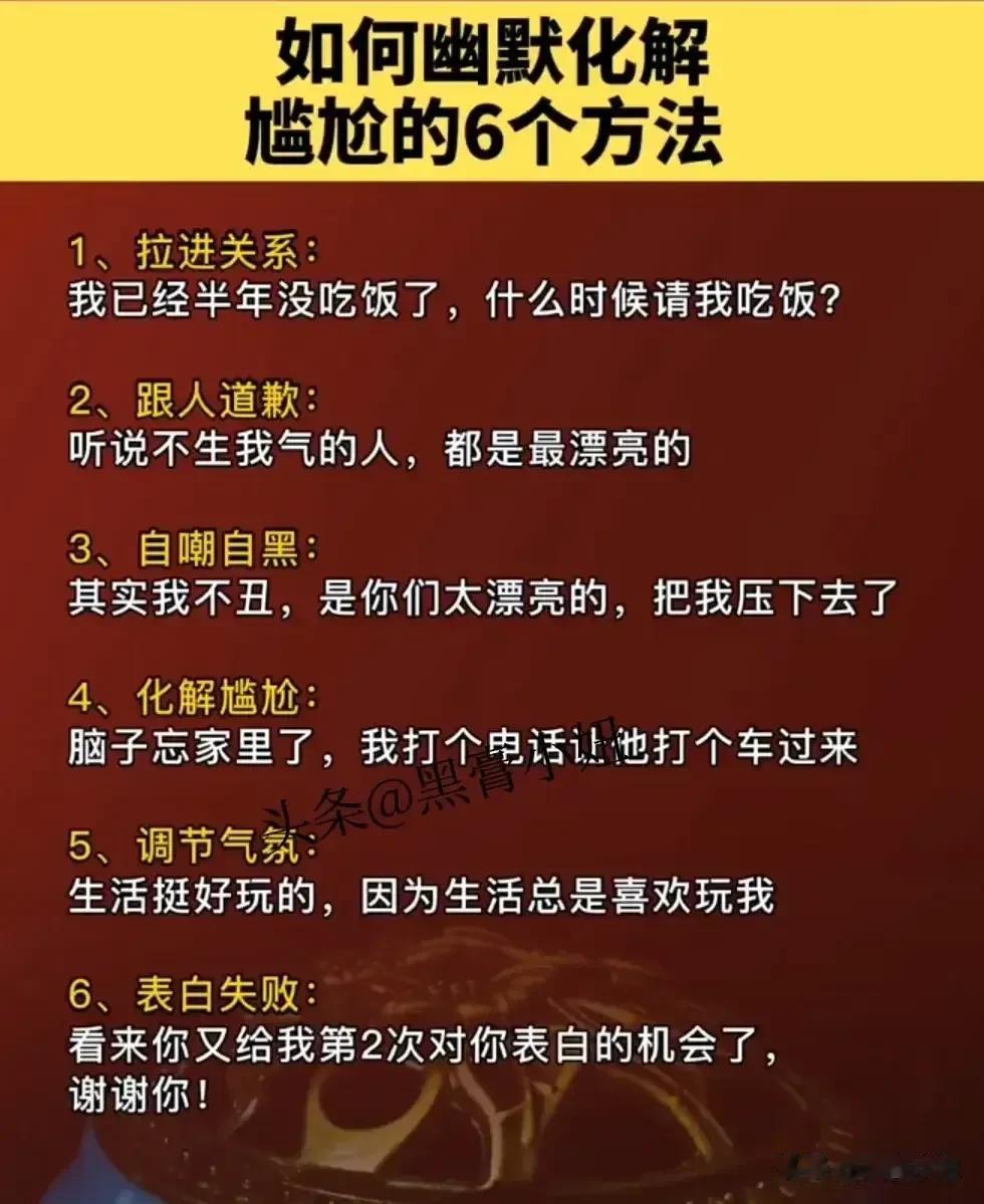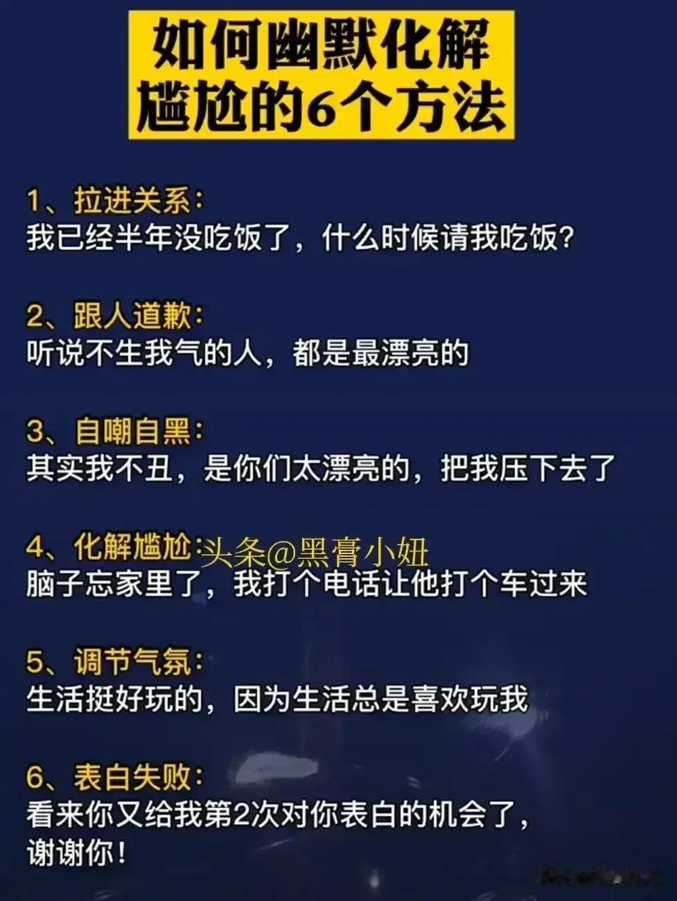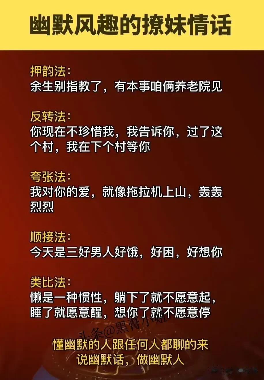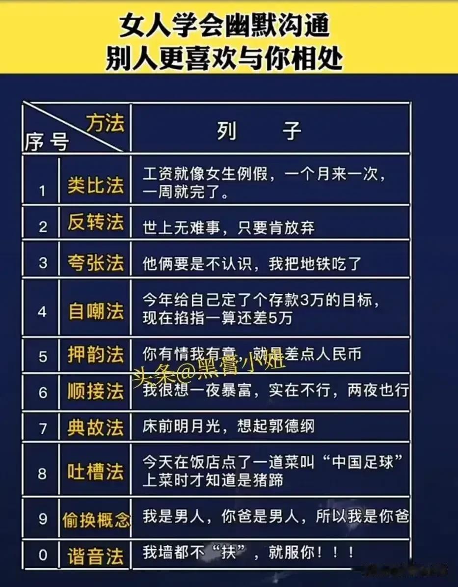 幽默的沟通方式是为了缓解尴尬,也是为人处事的一种智慧!你有多幽默,就有多讨人喜欢,包含提升幽默口才的方法,幽默化解尴尬的方法、幽默风趣的撩妹情话、套路对象的幽默对话、幽默回怼“哦” “额” “恩”,以及沟通社交技巧,赶紧收藏学习!让你大受欢迎的沟通技巧,说幽默话,做幽默人。 类比法:工资就像女生例假,一个月来一次,一周就完了。 反转法:世上无难事,只要肯放弃 夸张法:他俩要是不认识,我把地铁吃了 自嘲法:今年给自己定了个存款3万的目标,现在掐指一算还差5万 夸张法:要不是空气免费,我都活不到现在 典故法:我不是草船,你的贱别往我这里放 …… 幽默感是可以练出来的,只要掌握对了方法,你也可以很幽默,在哪都能受欢迎。更多幽默话术和技巧在下方链接! 幽默沟通学