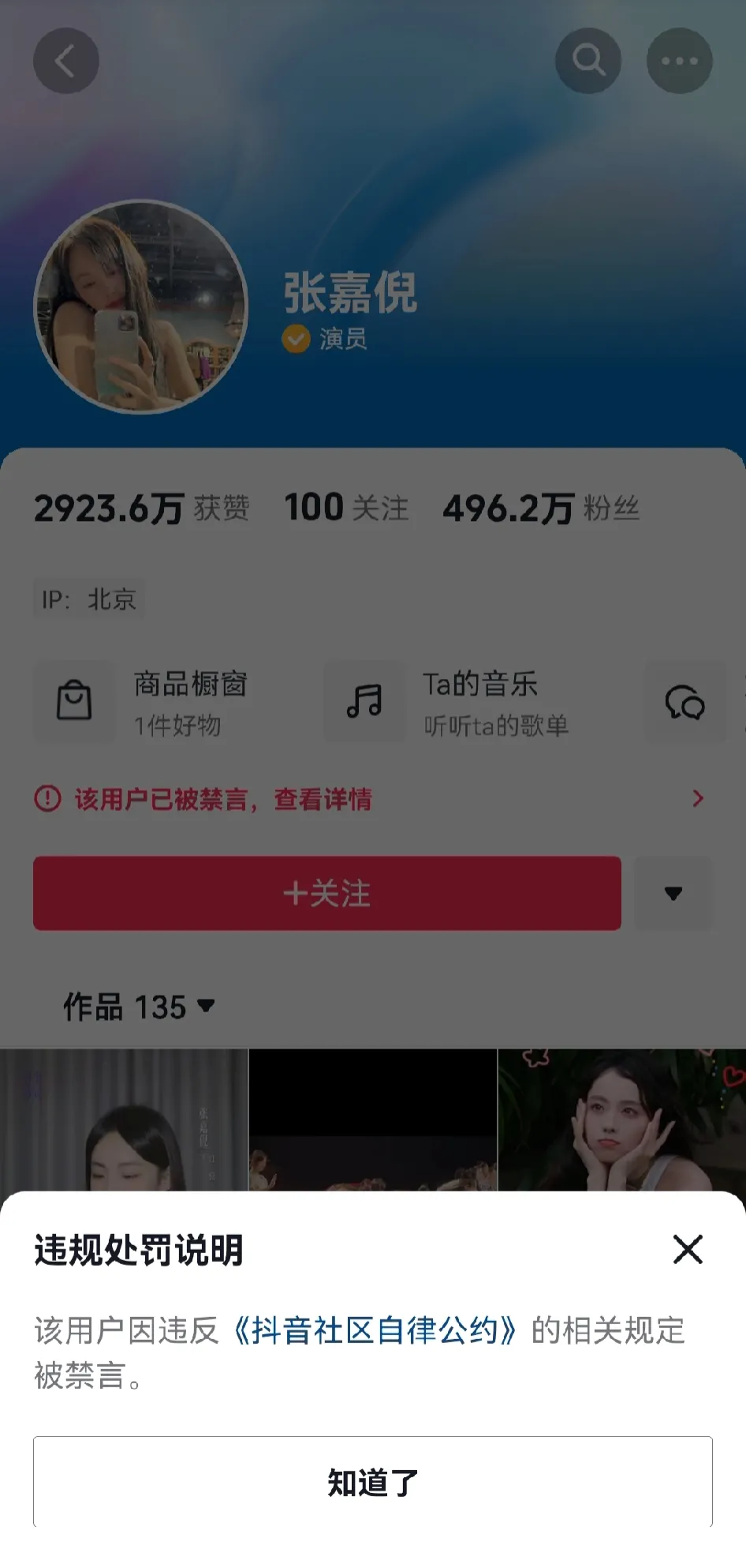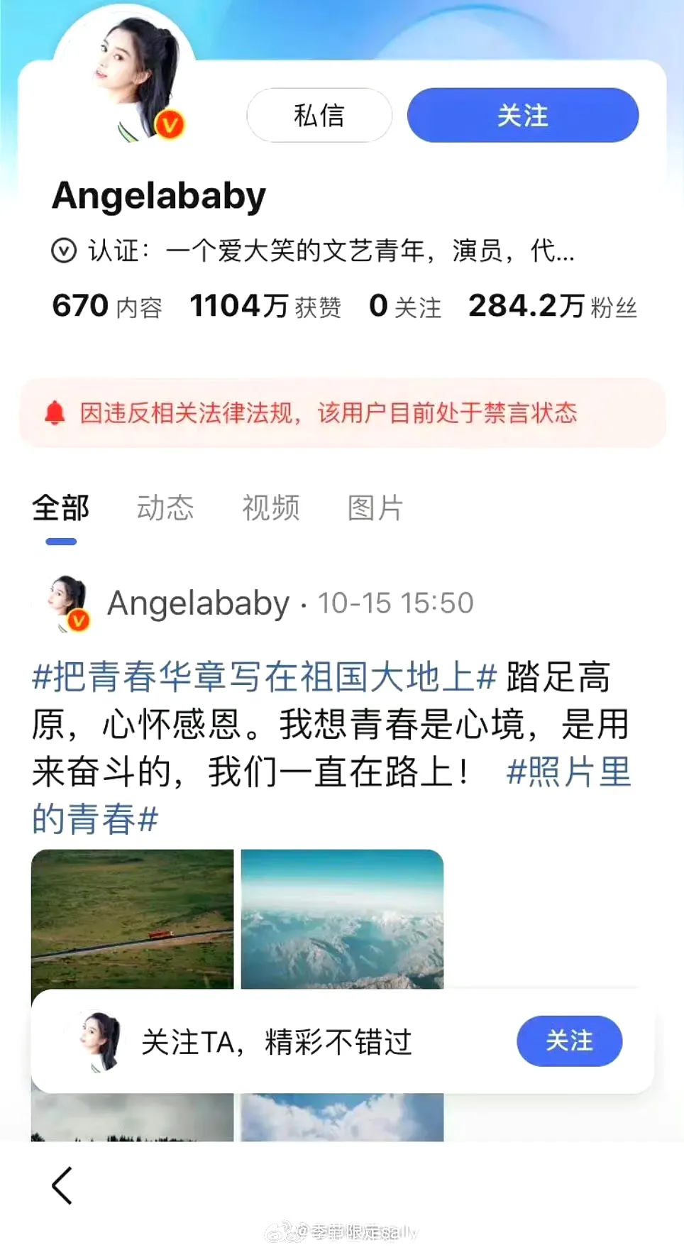 Angelababy杨颖、张嘉倪抖跟度的账号皆已禁言 比下午的禁止关注更进一步的公示禁言,我觉得不会是这么无缘无故的突然两平台同时动作 所以是真的凉了吗?