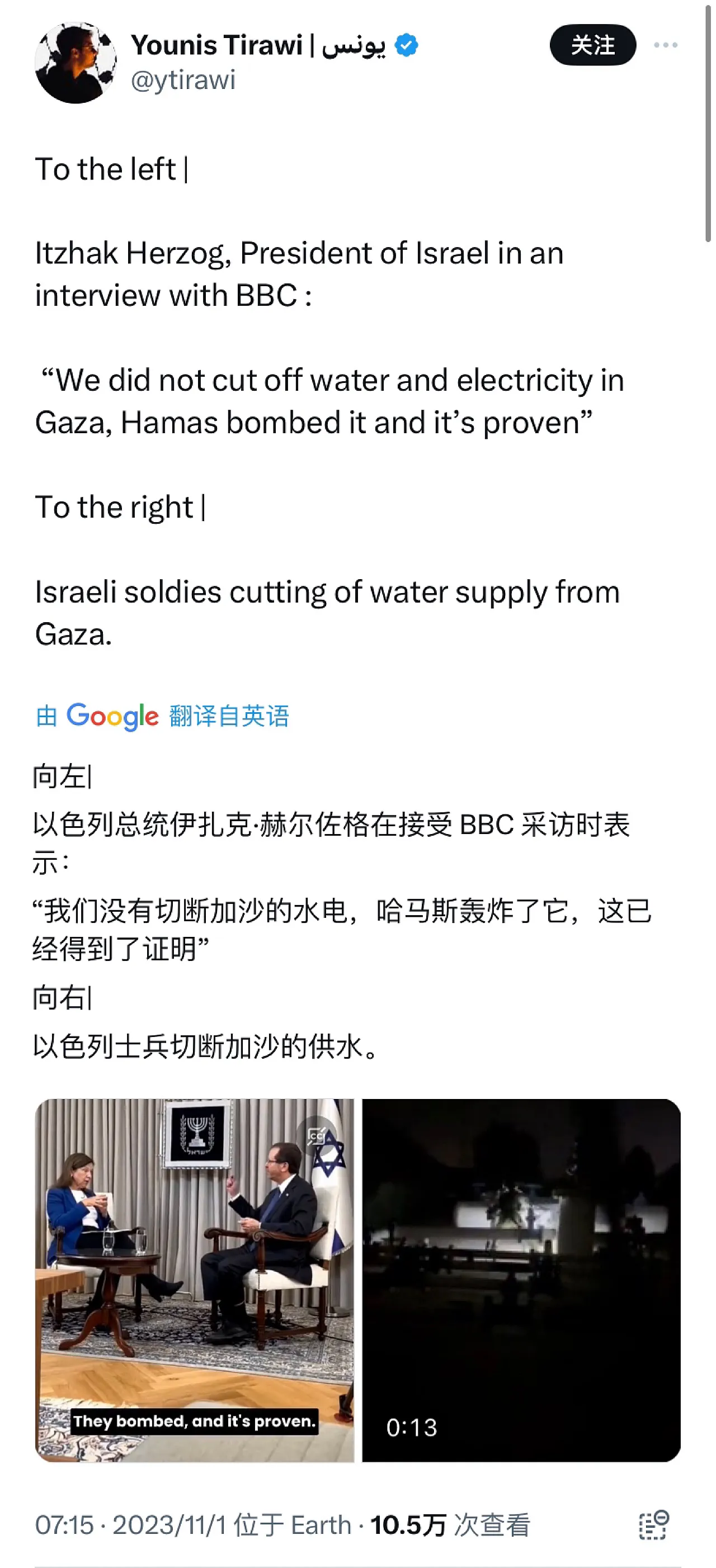 以色列总统伊扎克·赫尔佐格在接受BBC采访时表示:“我们没有切断加沙的水电,哈马斯轰炸了它,这已经得到了证明。”(图一、图二) 以色列国防军士兵切断加沙地带的供水。(图三、图四)