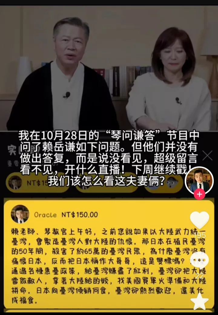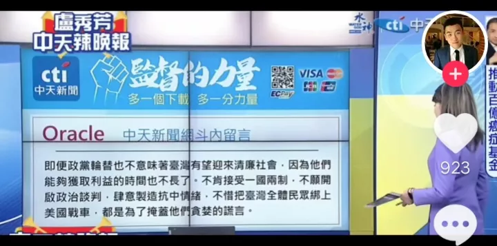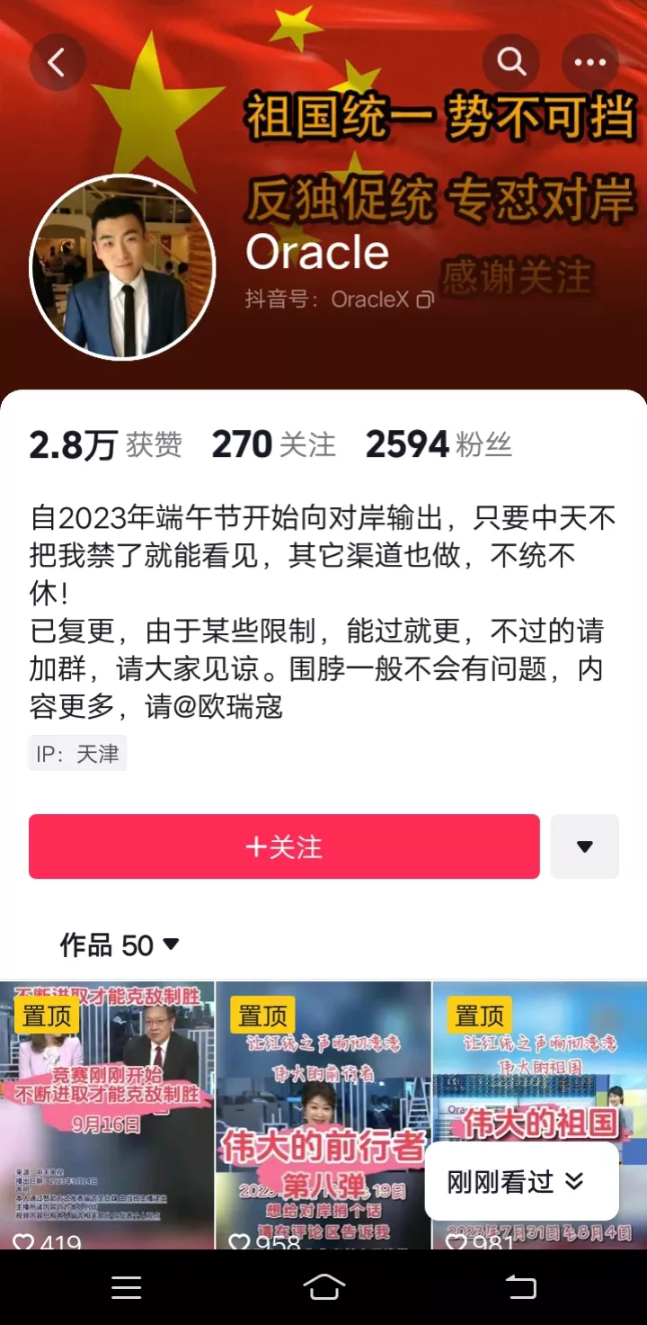 这位神秘土豪名叫oracle,是一位年龄26岁左右玉树临风的男士,他一脸正气,主页头像背景写着“祖国统一,势不可挡。反独促统,专怼对岸”,是一名令人尊敬的爱国人士,这完全可以从他的内容反映出来,内容都是参与了台湾省的媒体节目,呼吁媒体从业人员促进统一、怒怼台毒的发言,而且好多的发言还被郭正亮、卢秀芳、唐湘龙等当作精彩发言在节目中读了出来。