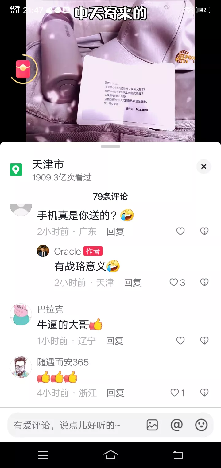 这位oraCLe寇先生今天发布的抖音内容揭开了谜底:卢秀芳为了感谢他赠送手机,特意邮来了中天电视台的杯子、帽子、背包作为回礼,还附上了感谢信。