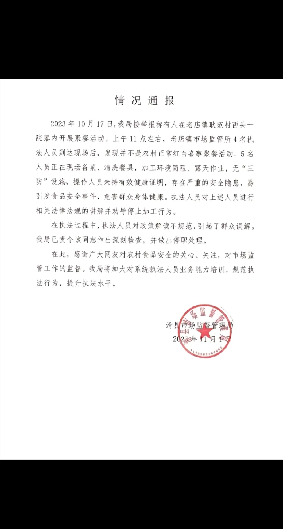 视频中的执法人员虽然没有表达清楚,而且去的地方也不是红白喜事的制作现场。(他们去现场是有人举报,有人办大席,没有登记)可以说完全是个乌龙。但是从说话的态度来说,还是很好的。