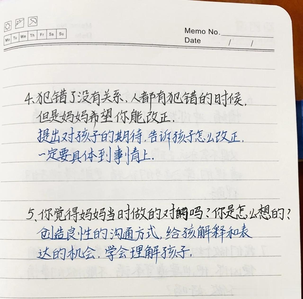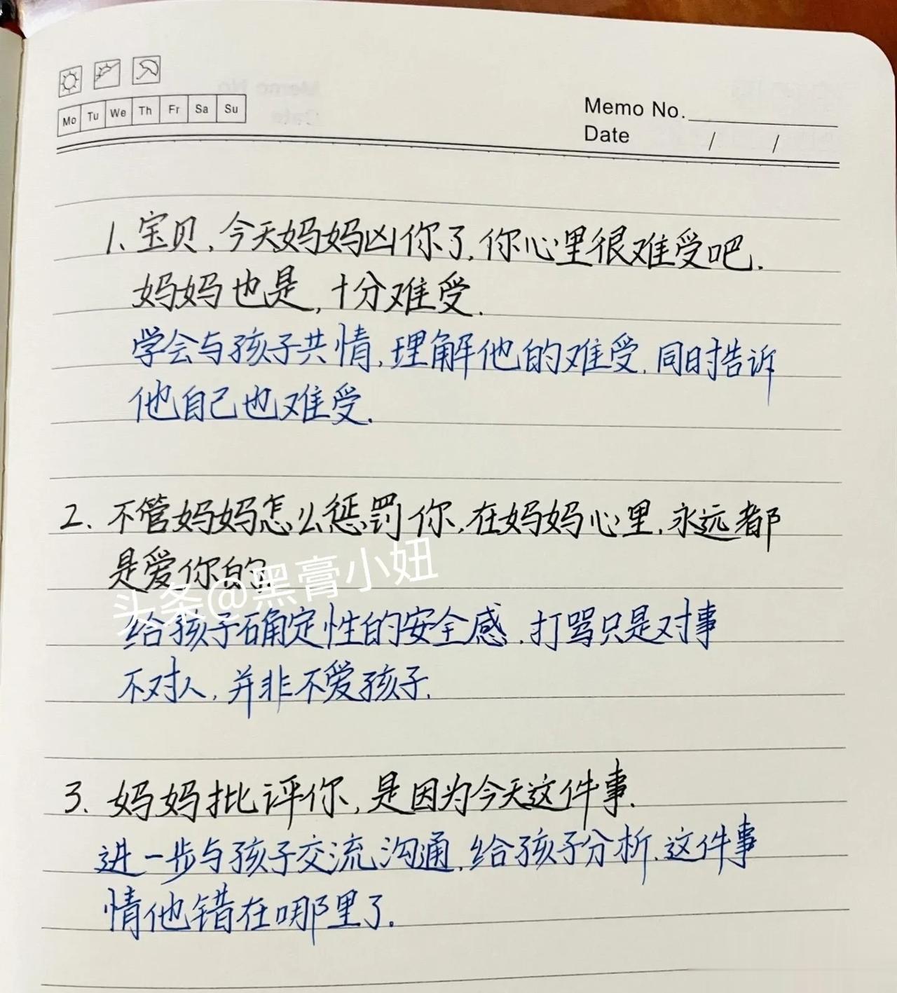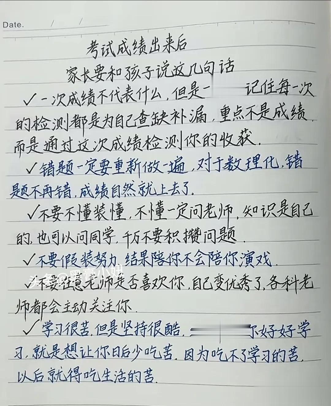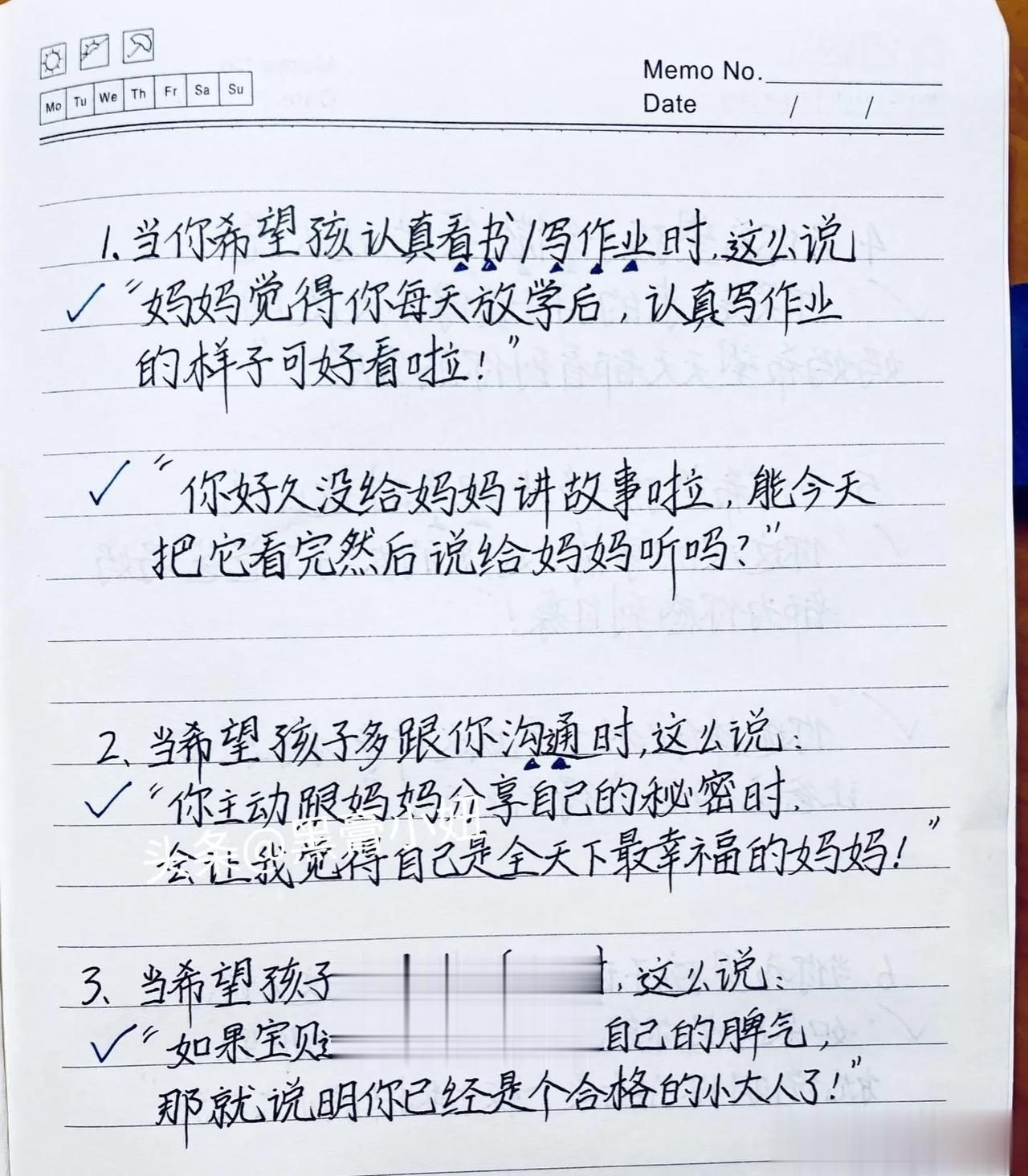 妈妈和孩子幽默对话,值得保存一辈子!考试成绩出来后,家长要和孩子说这几句话! 爸爸就是这样把我骗上了“985”! 孩子在学校被欺负,应采儿的回答亮了! 打骂孩子后,一定要说这些话,修复亲子关系,解开孩子心结! 这样说,让孩子不叛逆,肯定法,用暗示代替吼叫! …… 不愧是学霸妈妈的教育方法,全都手写整理出来!简直太用心了!父母语言的力量:你说他行,他就行,你说他不行,他就不行,你为他喝彩,他会给你一个又一个惊喜,你说他不如别人,他会用行动证明他真的很笨。 教育路上,比关注孩子成绩好坏更重要的,是助力他养成一个健全的人格。 跑得快的孩子不一定走得远。走得远的孩子,一定有教养,有素质,有自律的习惯和积极向上的人生态度。 学霸养成指南,解决沟通难题! 学霸妈妈修炼沟通指南