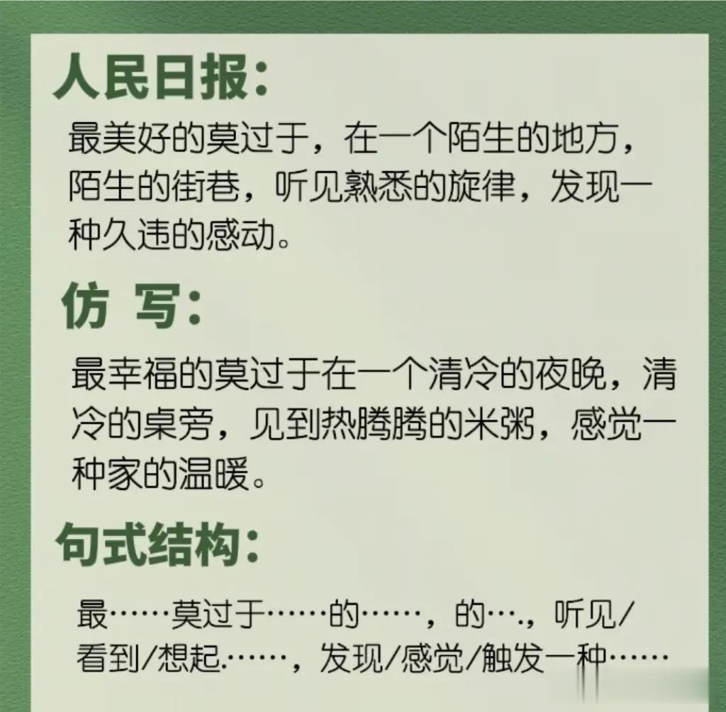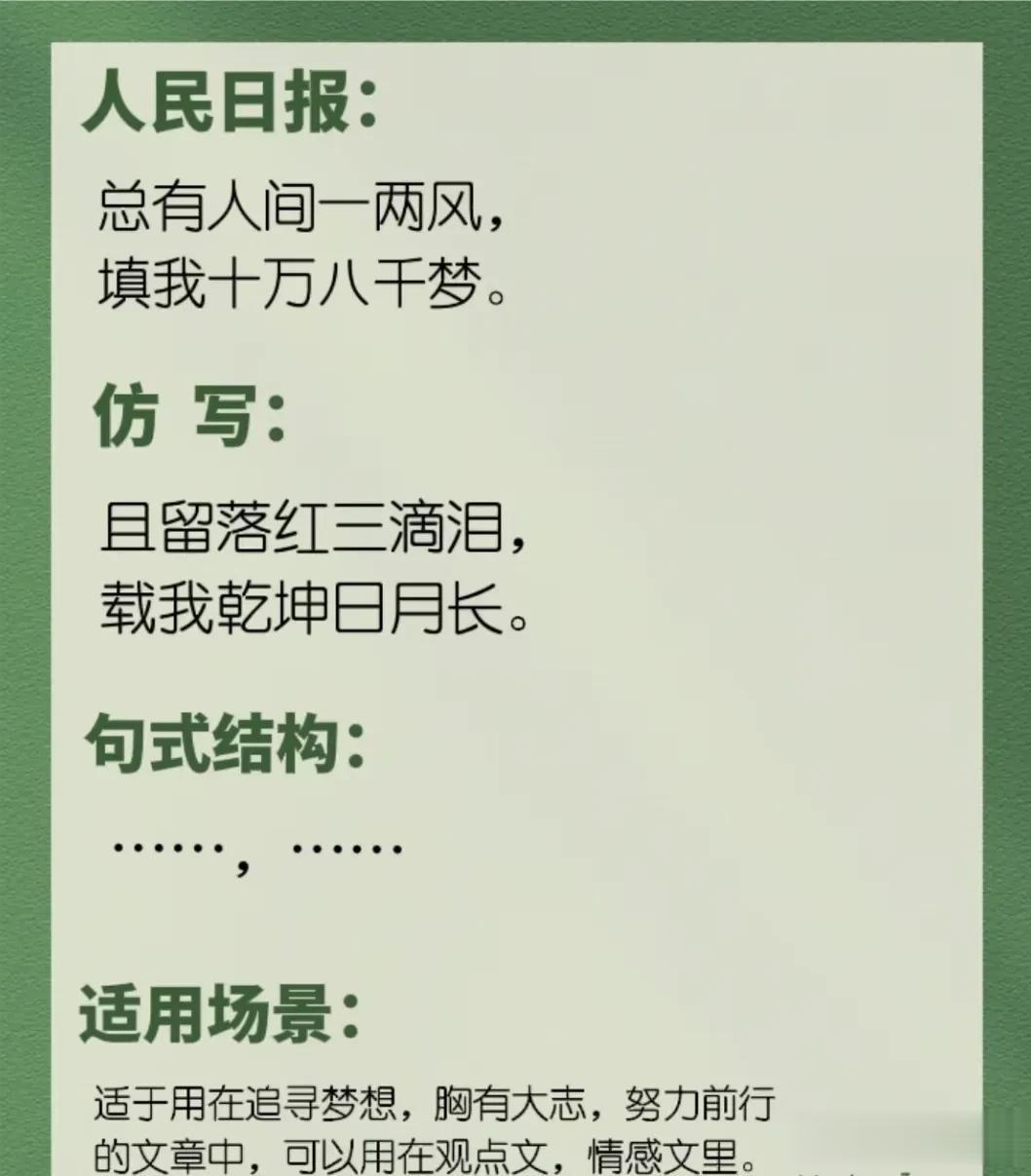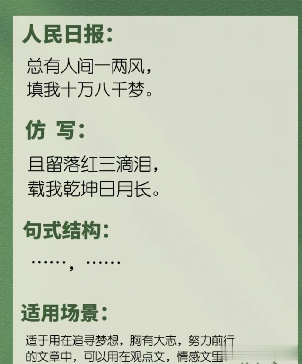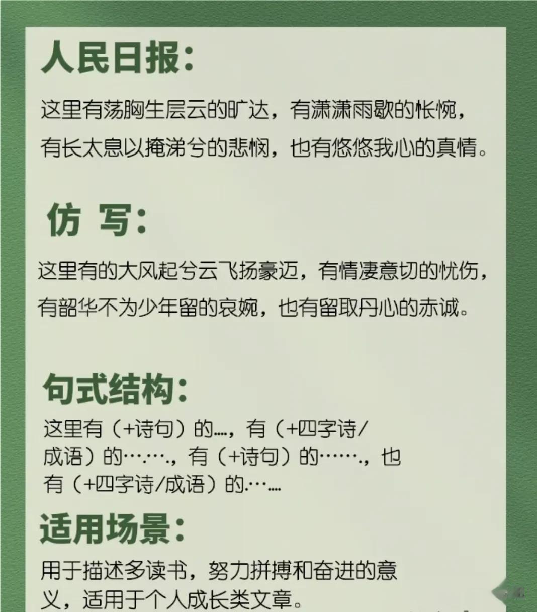 天哪!“写得太高级了”!不愧是学霸跟着人民日报仿写的,看完之后,简直太惊艳了,原来学霸的写作技巧是这样提升的![捂脸]真是后悔明白的太迟了! 人民日报的素材果然不一样,没事多背一背,写一写,能够很好的提升自己的文学素养。特别是词不达意,写作困难的孩子。 人民日报初高中写作技