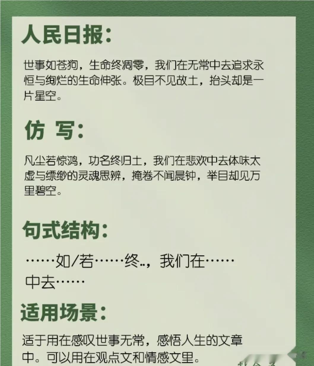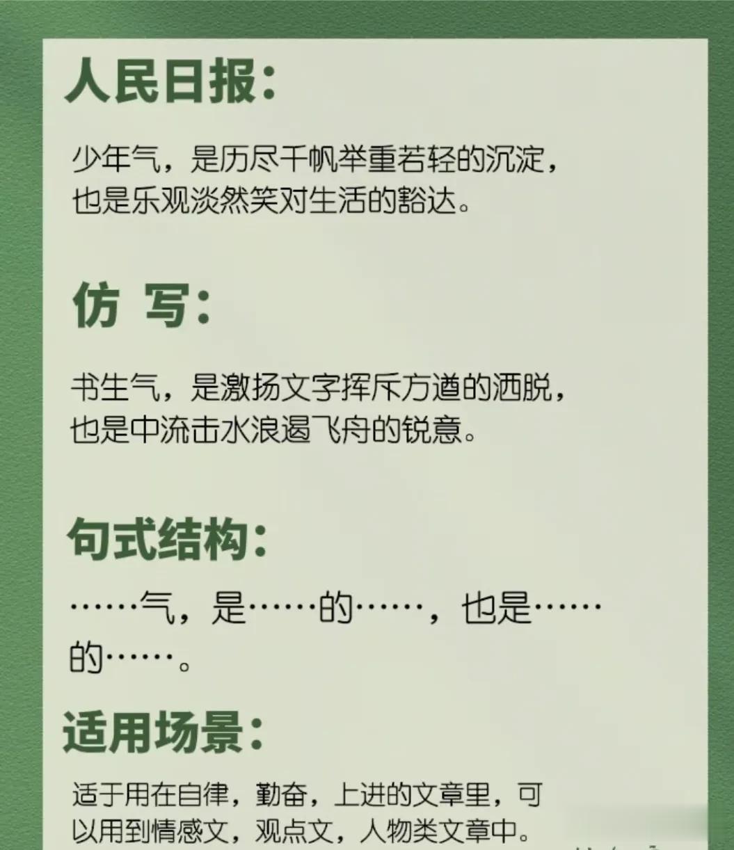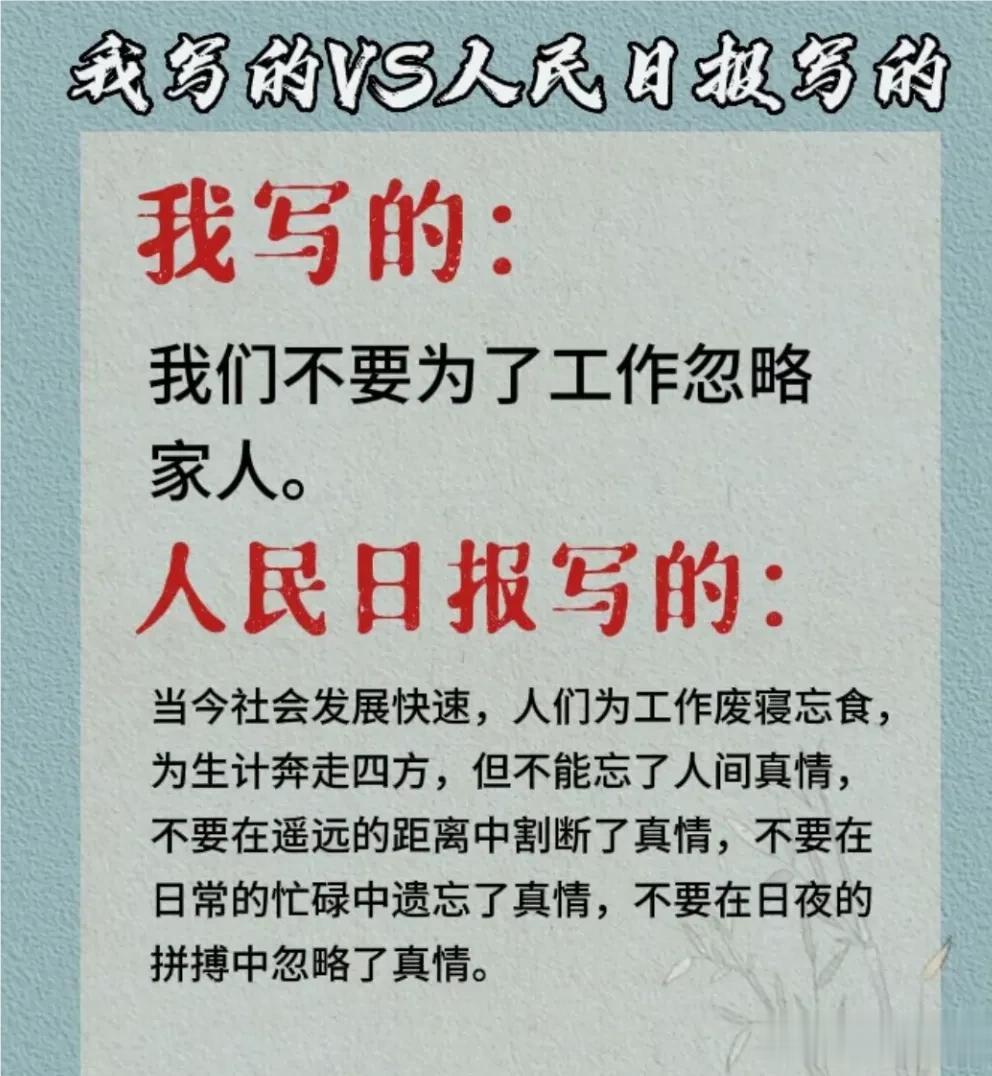 天哪!“写得太高级了”!不愧是学霸跟着人民日报仿写的,看完之后,简直太惊艳了,原来学霸的写作技巧是这样提升的![捂脸]真是后悔明白的太迟了! 人民日报的素材果然不一样,没事多背一背,写一写,能够很好的提升自己的文学素养。特别是词不达意,写作困难的孩子。 人民日报初高中写作技