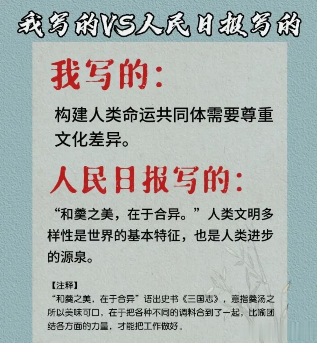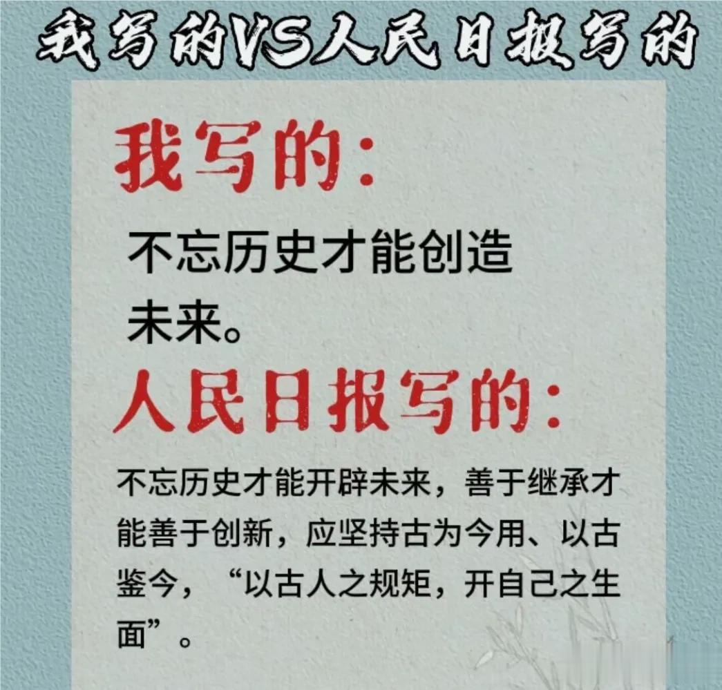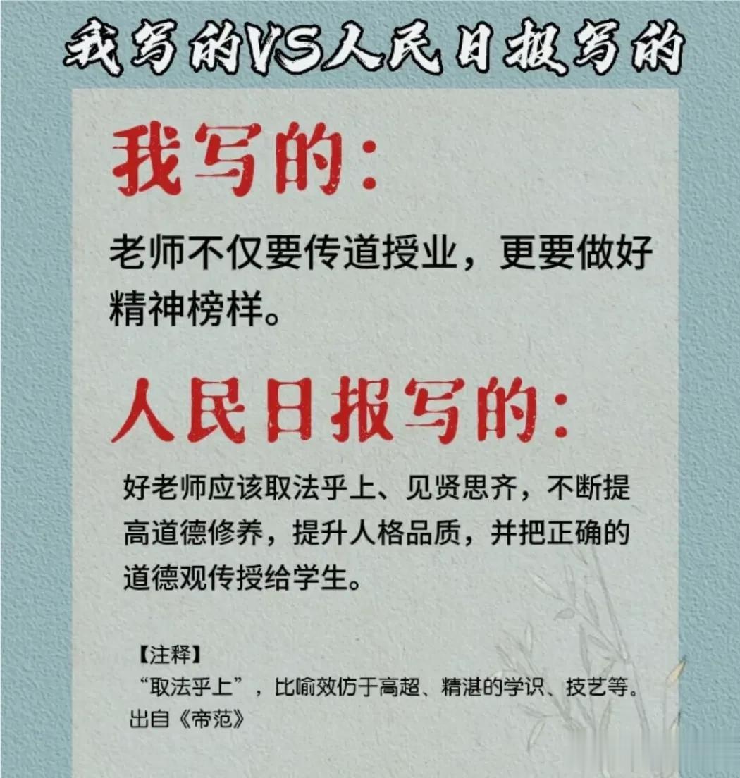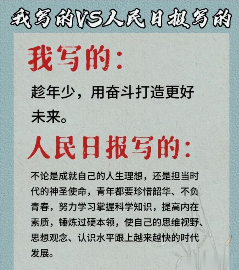 天哪!“写得太高级了”!不愧是学霸跟着人民日报仿写的,看完之后,简直太惊艳了,原来学霸的写作技巧是这样提升的![捂脸]真是后悔明白的太迟了! 人民日报的素材果然不一样,没事多背一背,写一写,能够很好的提升自己的文学素养。特别是词不达意,写作困难的孩子。 人民日报初高中写作技