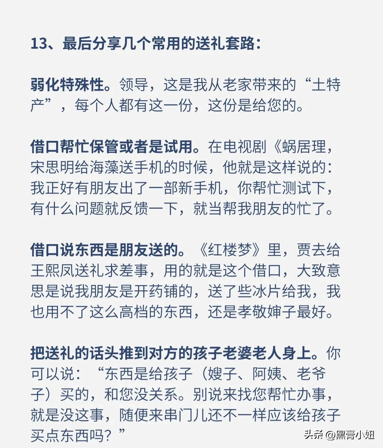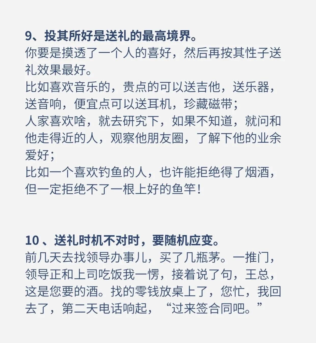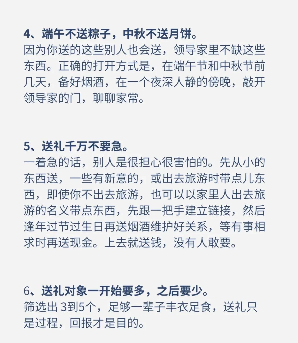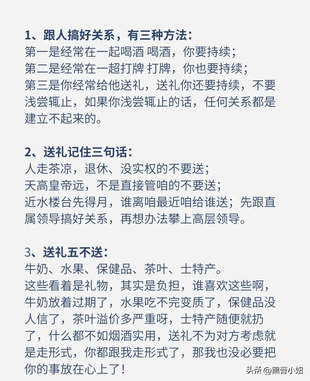 一位厅级退休前辈悄悄告诉我的送礼潜规则、和领导出去应酬,牢记这些“不成文”的规矩,领导不仅高看你,也会更器重你!赶紧学起来!据说,那些在职场中混得好的人,早就摸清并熟练运用了! 人到中年,无论是身在官场、职场,还是生意场,哪怕是平时红白喜事,孩子上学,都免不了要做一件事,那就是应酬。 中国是一个讲关系、讲人情的社会,你会应酬会说话会做人,朋友就多,人脉就广,做事情也会更顺利! 应酬是门技术活,懂得应酬,你的事情就成功了一大半。懂得应酬就有人脉有资源,不懂应酬,再大的困难也解决不了,再小的问题也会变得难缠。赶紧下方链接系统的学起来! 中国式应酬送礼技巧