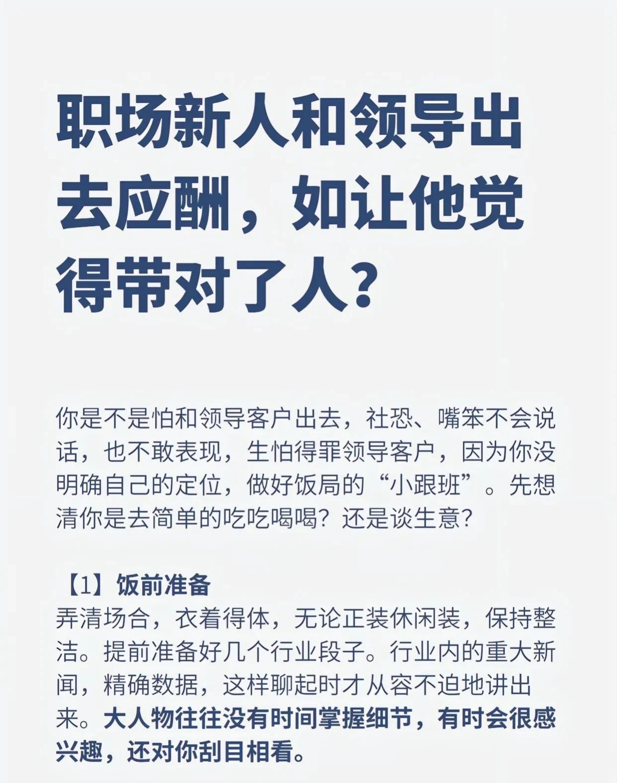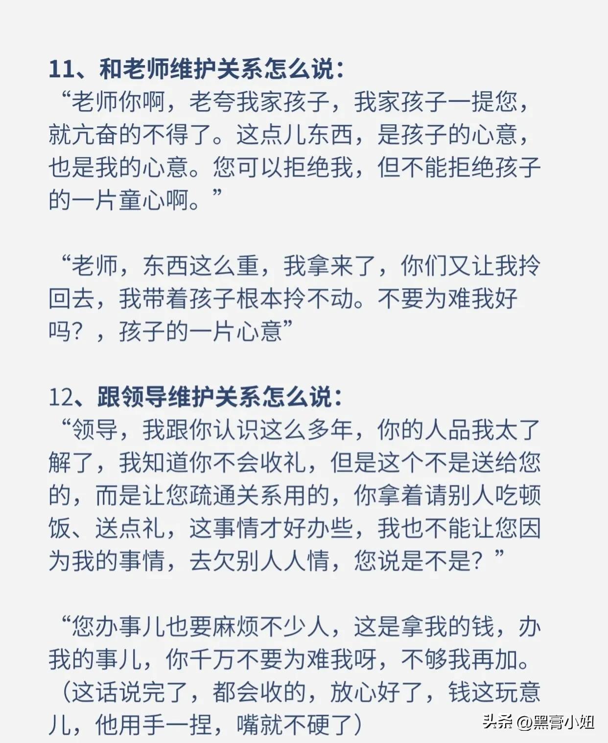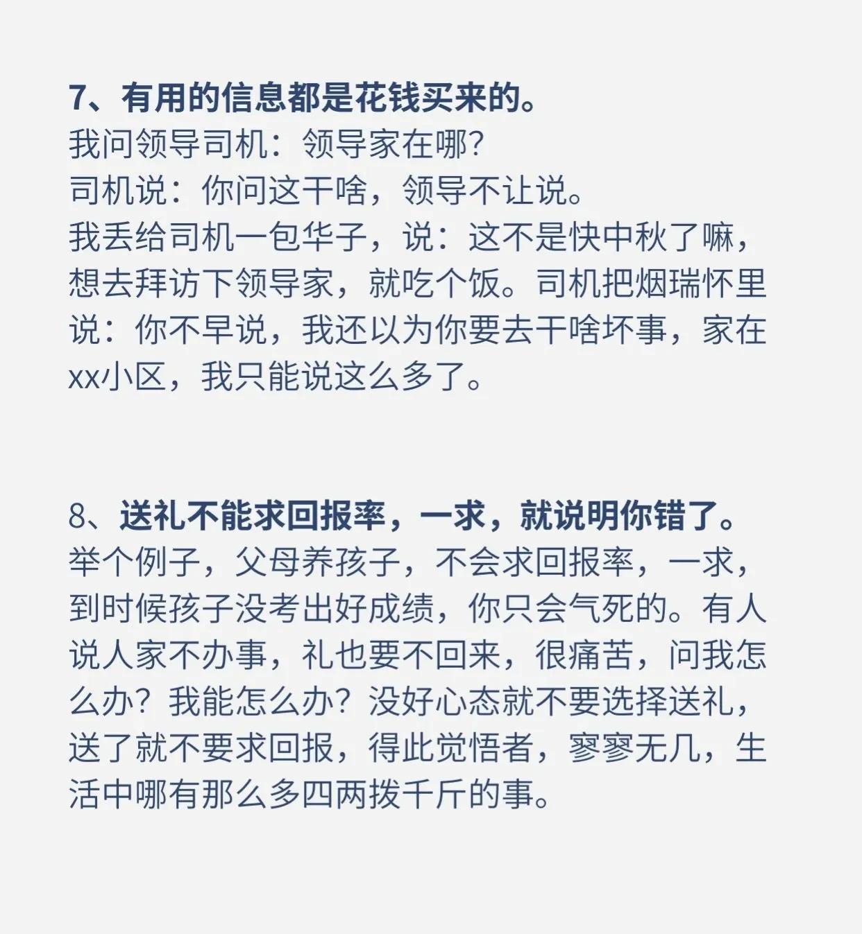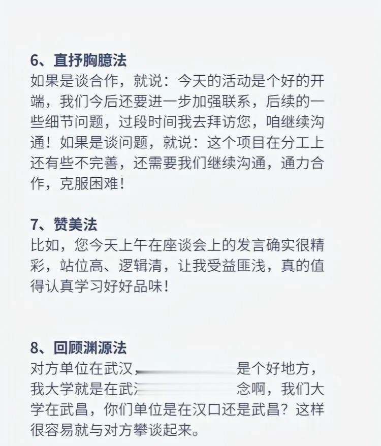 一位厅级退休前辈悄悄告诉我的送礼潜规则、和领导出去应酬,牢记这些“不成文”的规矩,领导不仅高看你,也会更器重你!赶紧学起来!据说,那些在职场中混得好的人,早就摸清并熟练运用了! 人到中年,无论是身在官场、职场,还是生意场,哪怕是平时红白喜事,孩子上学,都免不了要做一件事,那就是应酬。 中国是一个讲关系、讲人情的社会,你会应酬会说话会做人,朋友就多,人脉就广,做事情也会更顺利! 应酬是门技术活,懂得应酬,你的事情就成功了一大半。懂得应酬就有人脉有资源,不懂应酬,再大的困难也解决不了,再小的问题也会变得难缠。赶紧下方链接系统的学起来! 中国式应酬送礼技巧